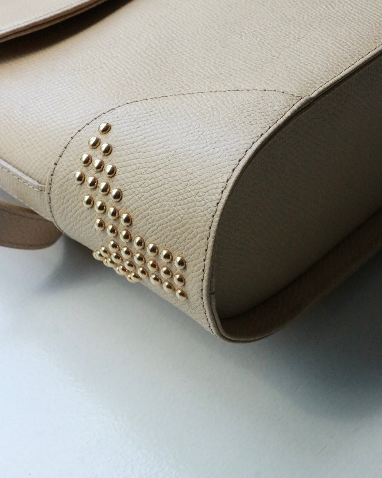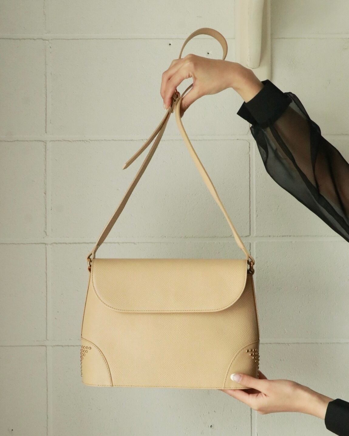 サイドに施された丸スタッズのYマークが上品さの中にもモードな印象をプラス。サイズ感も良く、収納力もあり、斜め掛けも◎