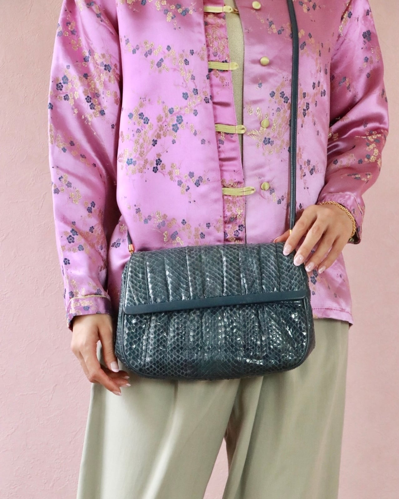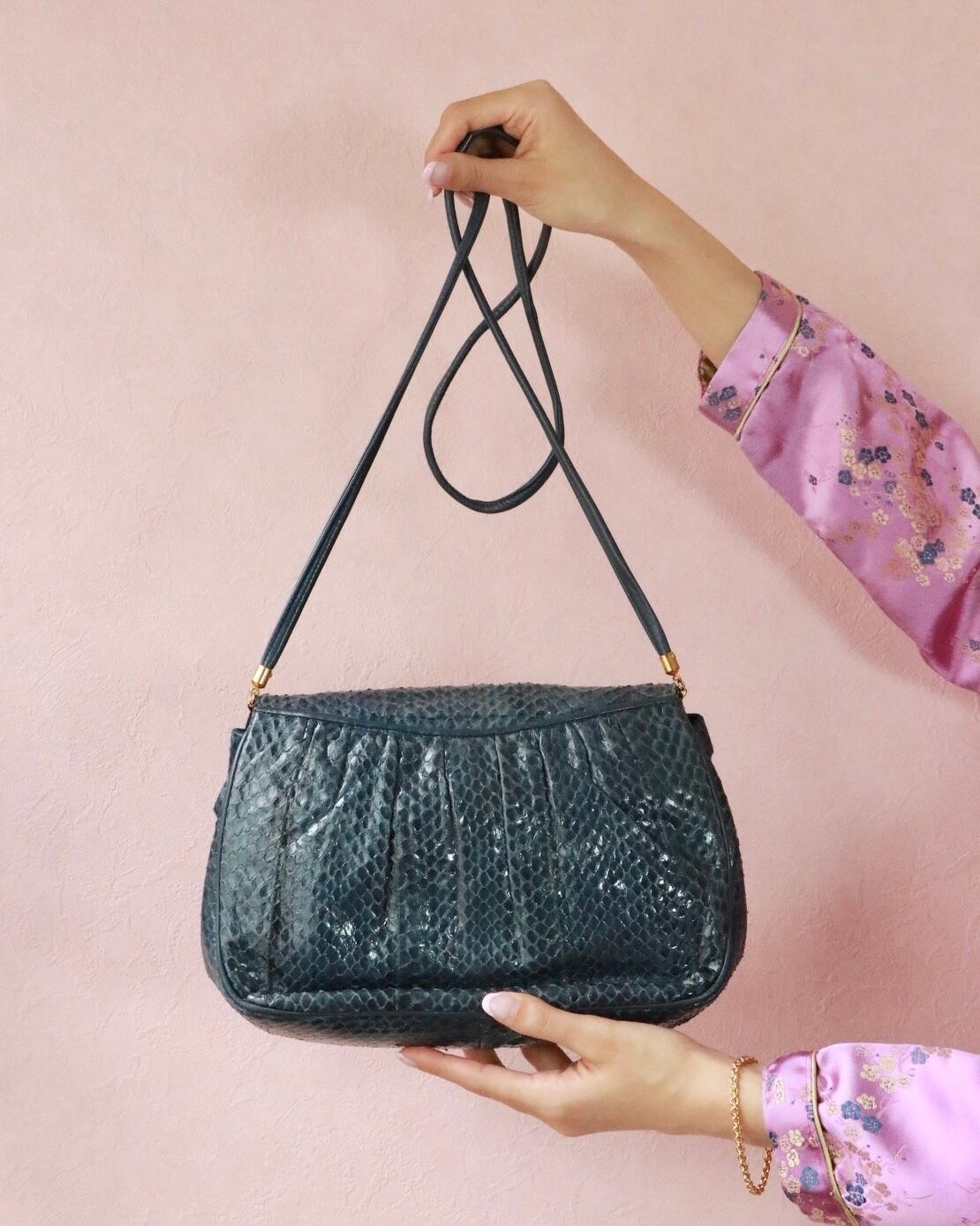 柔らかな手触り、洒落たネイビーの色合いはパイソンレザーならでは。取り外し出来るストラップはパーティーシーンではクラッチバッグにしても◎