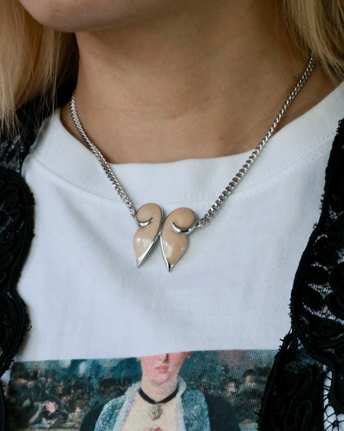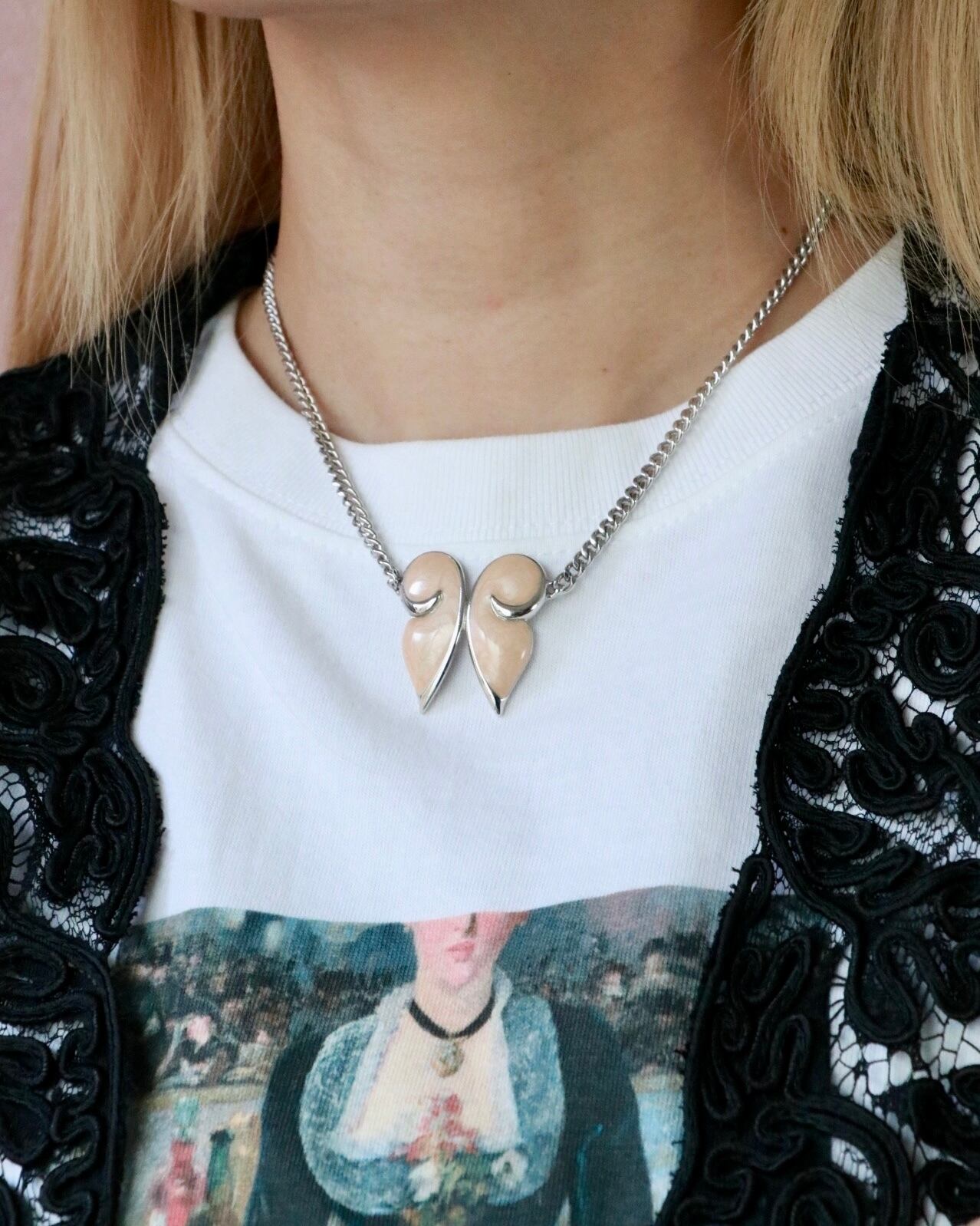 バタフライモチーフの可愛いネックレスはモネのヴィンテージ 。シルバーベースのチェーンにベージュのエナメル蝶々がとっても可愛いらしくスペシャルな一点。首元で止まる長さは合わせるトップスを選ばず年中大活躍できますが、特に夏ファッションとベストマッチのシルバーネックレスは他と差を付けるデザインを選びたい。
