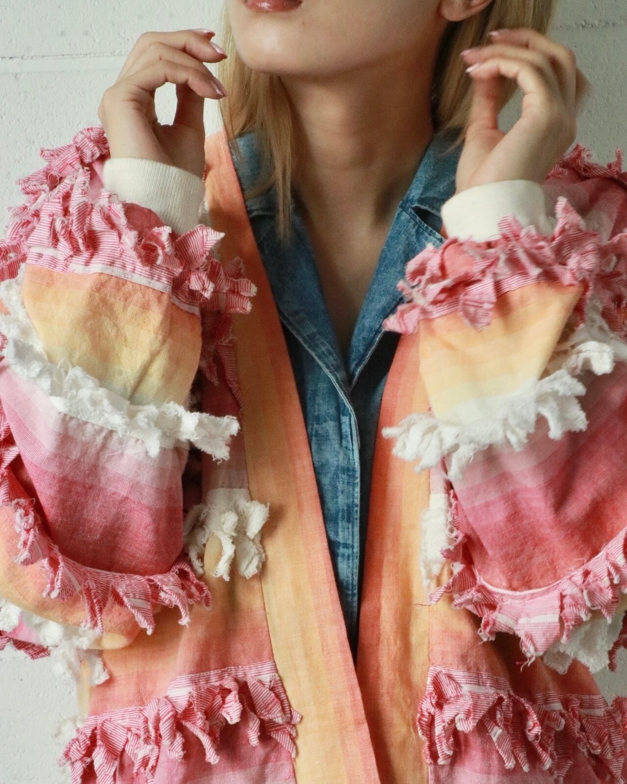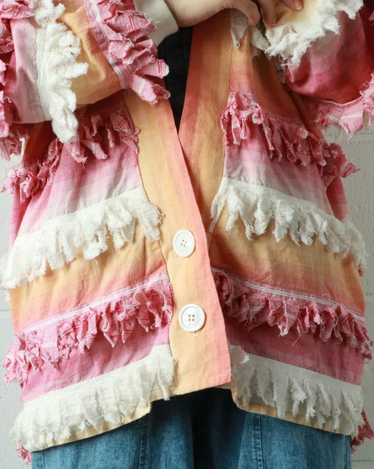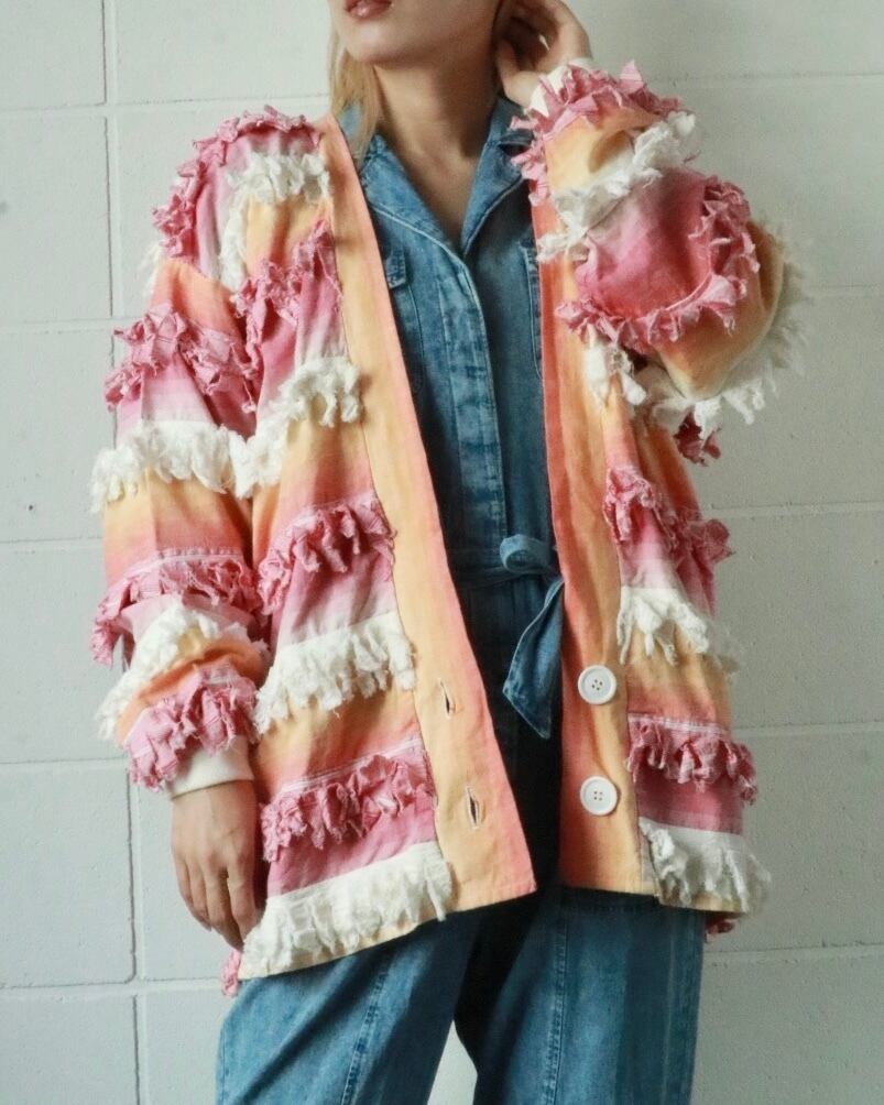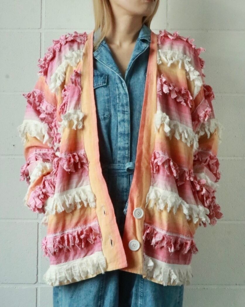 サーモンピンクからピンクへとグラデーションになった色合い、全体的にフリンジが付いたゆったりボディーのユニークな羽織りです。