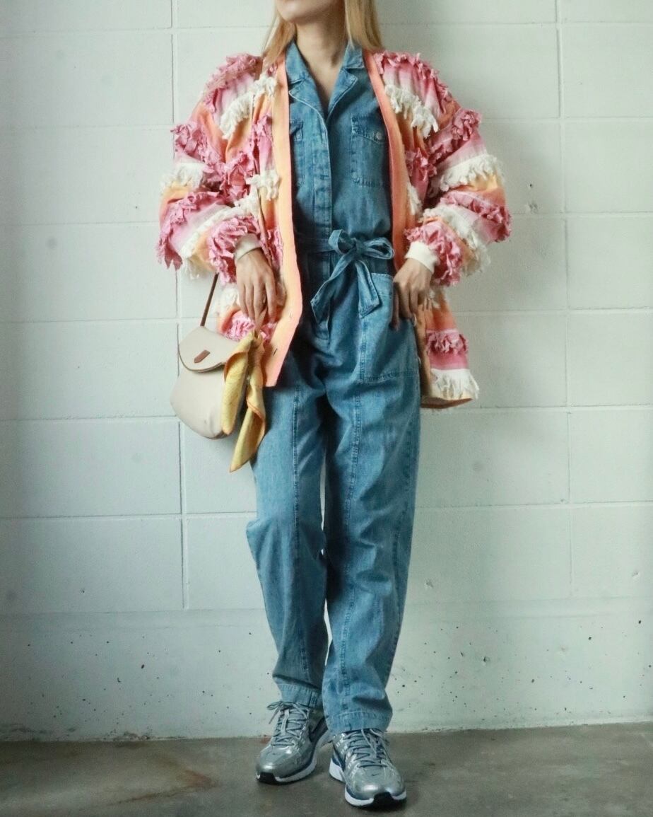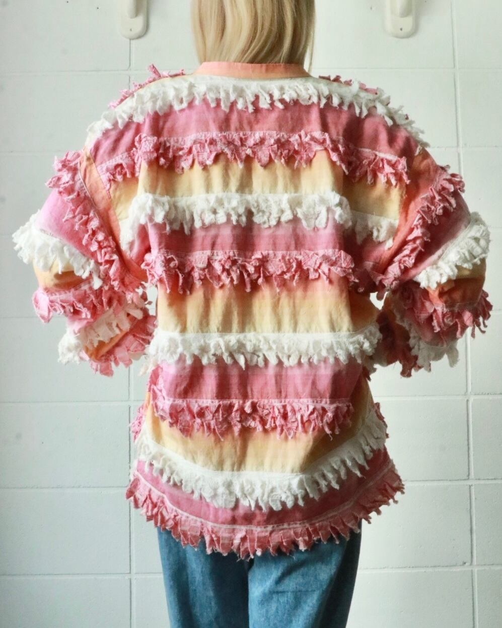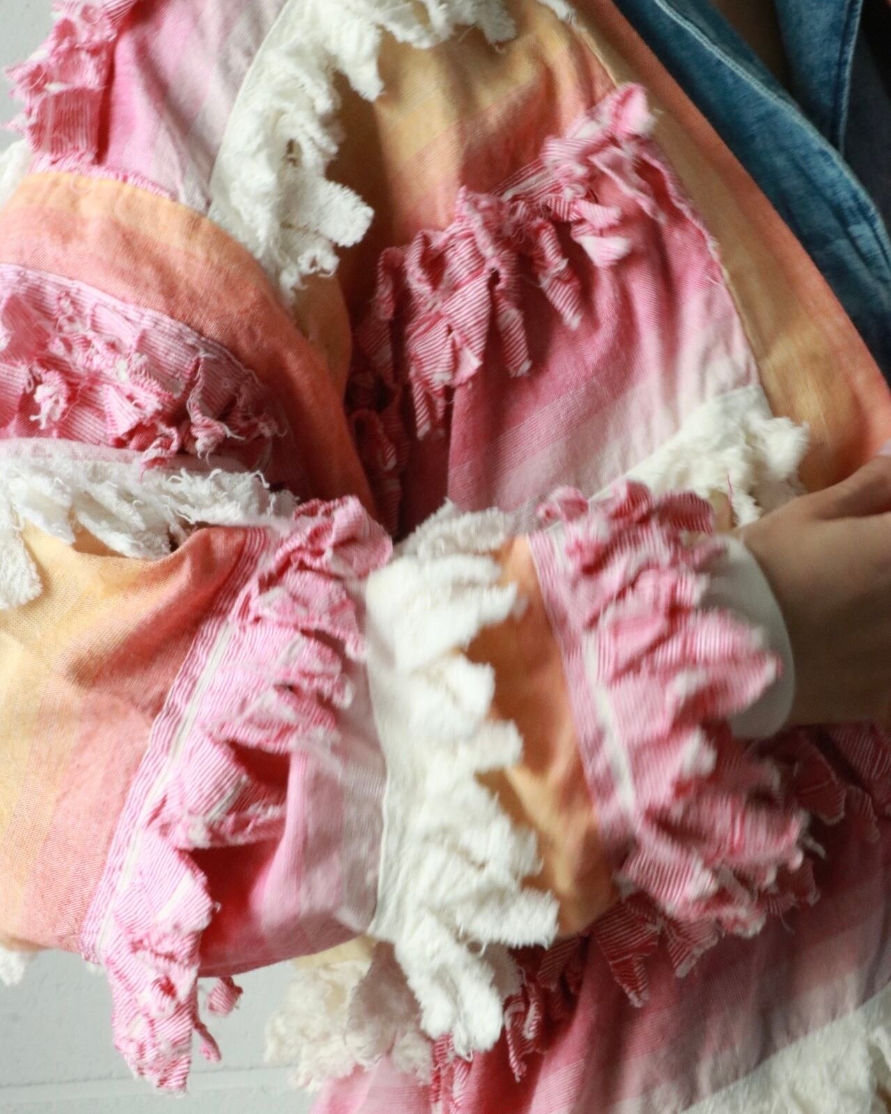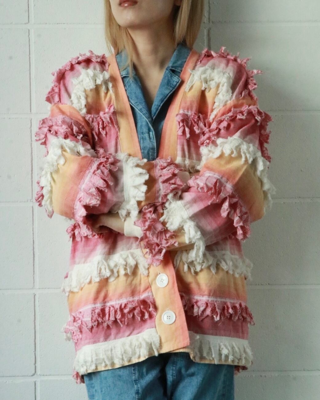 サーモンピンクからピンクへとグラデーションになった色合い、全体的にフリンジが付いたゆったりボディーのユニークな羽織りです。