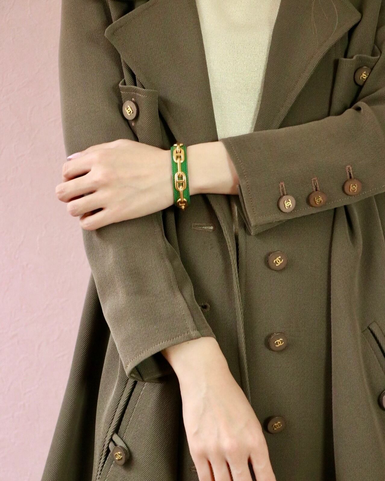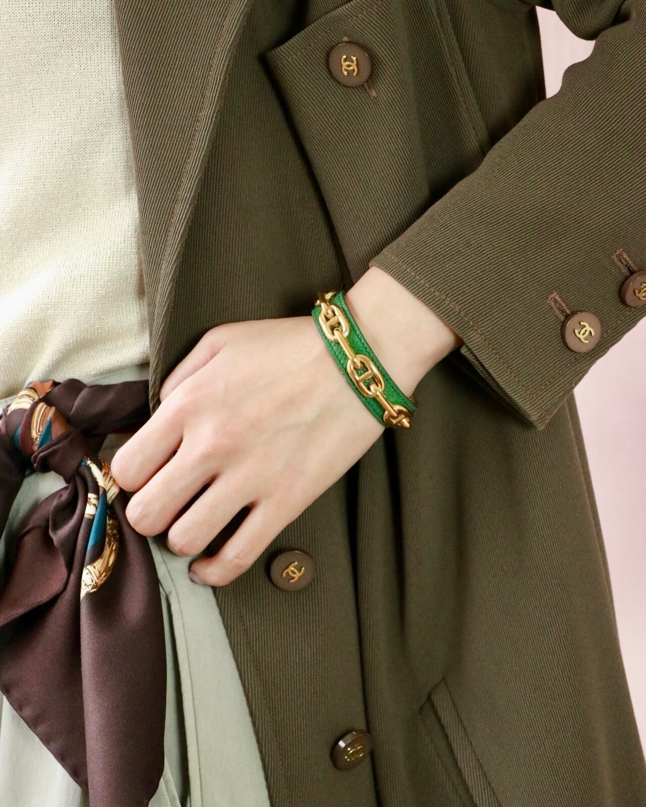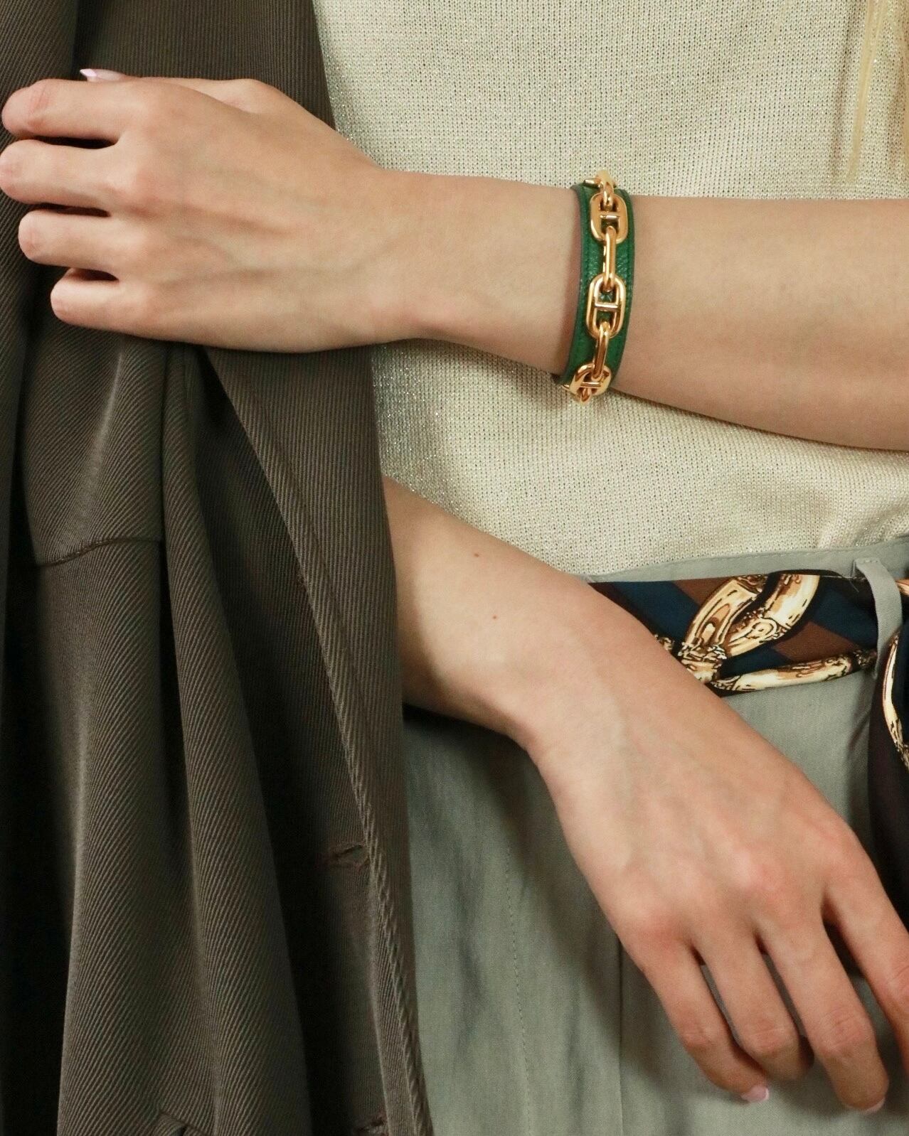 こちらはシンプルでありながら存在感溢れるエルメスの代表的なアイコン、シェーヌダンクルとレザーのコンビデザイン。