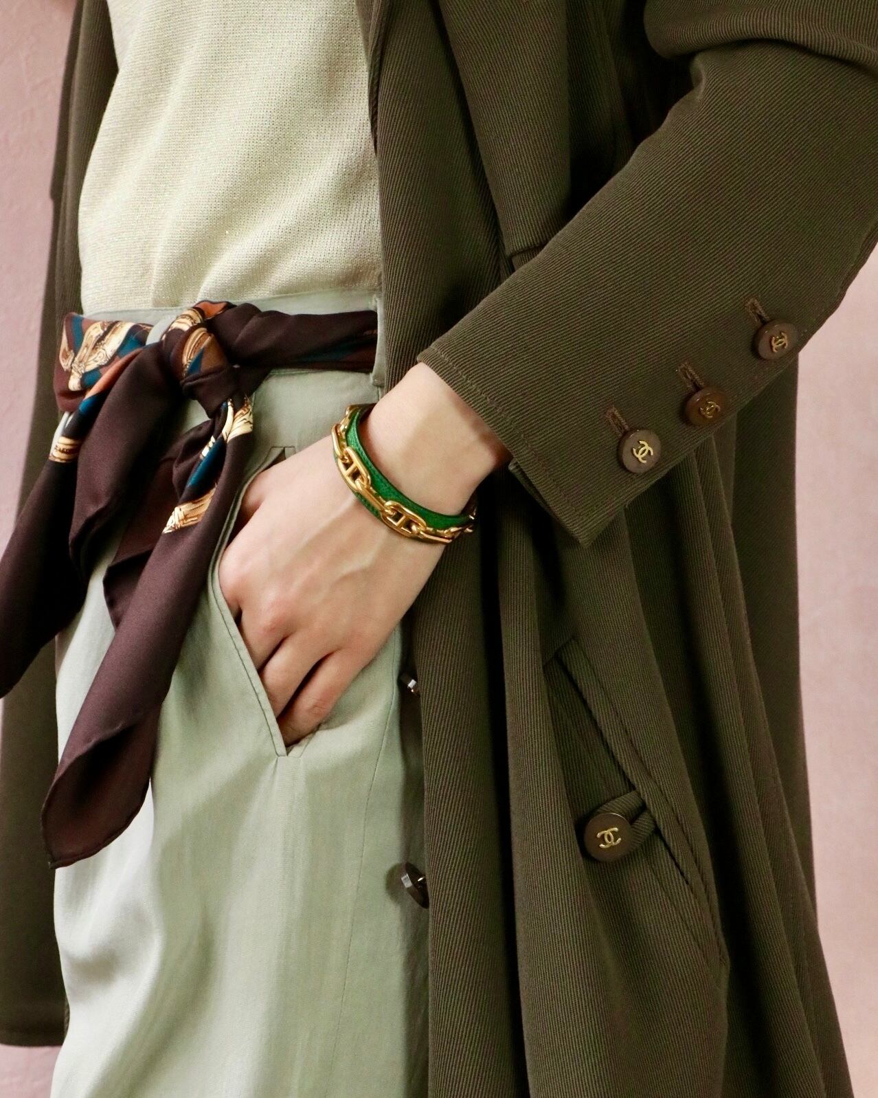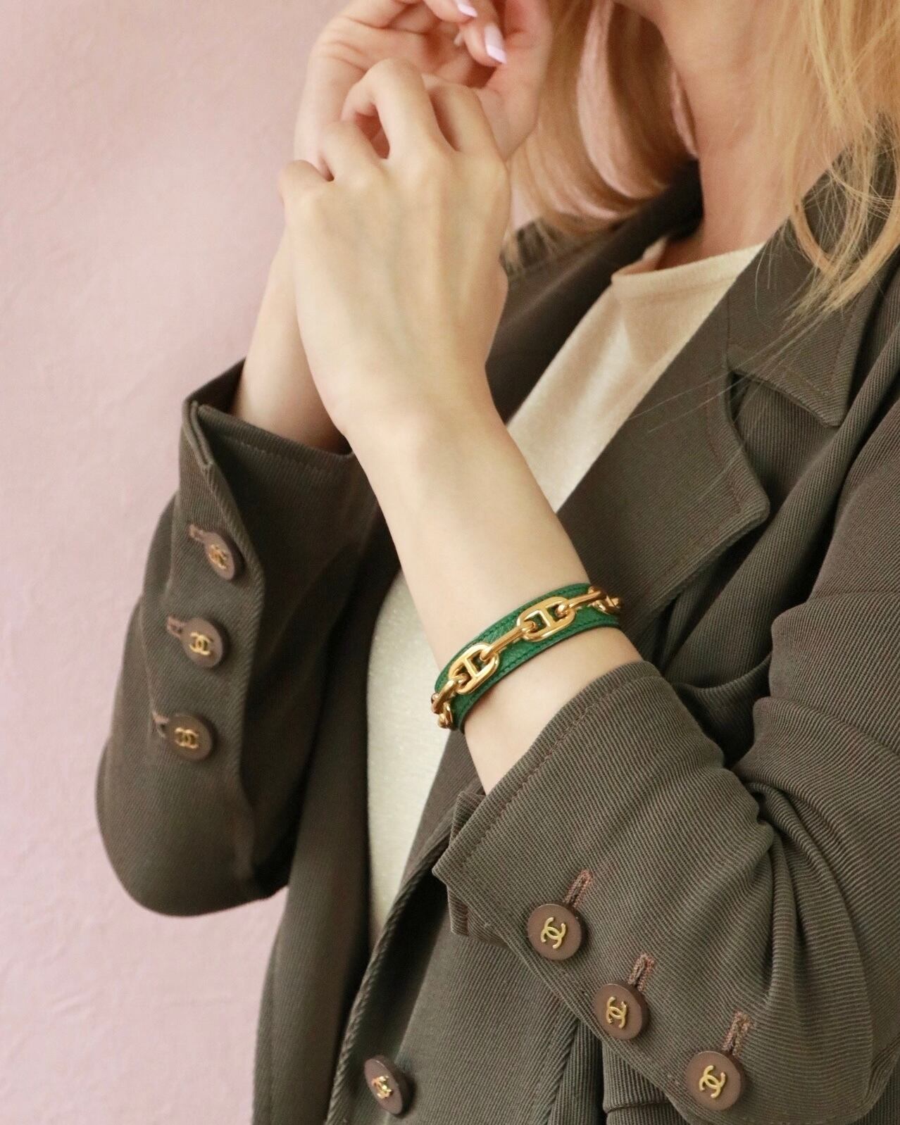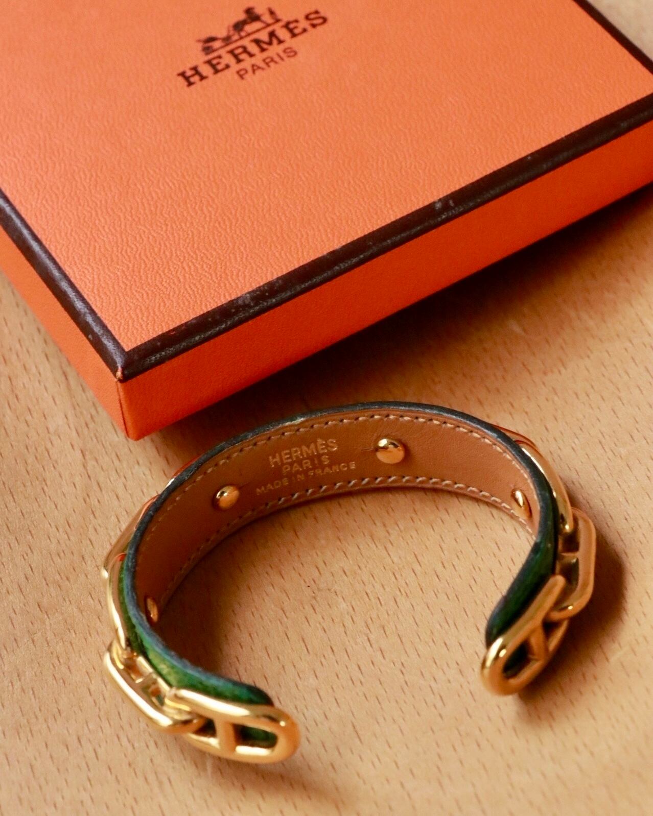 こちらはシンプルでありながら存在感溢れるエルメスの代表的なアイコン、シェーヌダンクルとレザーのコンビデザイン。