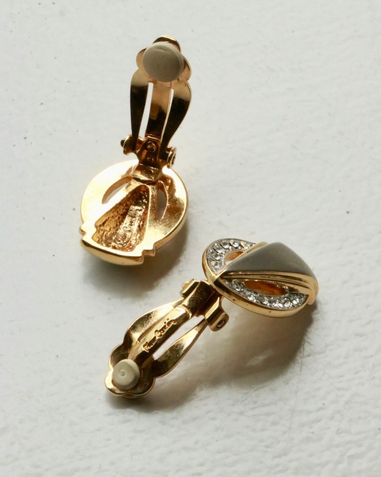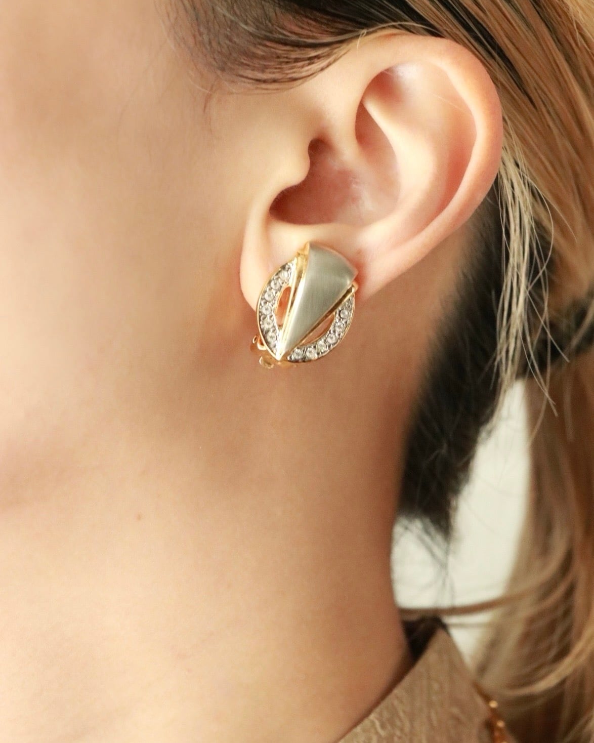 ゴールドカラーにラインストーンが顔まわりにクールな華やぎをプラスする、ピエールカルダンのイヤリング。デイリーにもオケージョンにも馴染む程良いサイズ感。ヴィンテージならではのデザインが魅力的です。