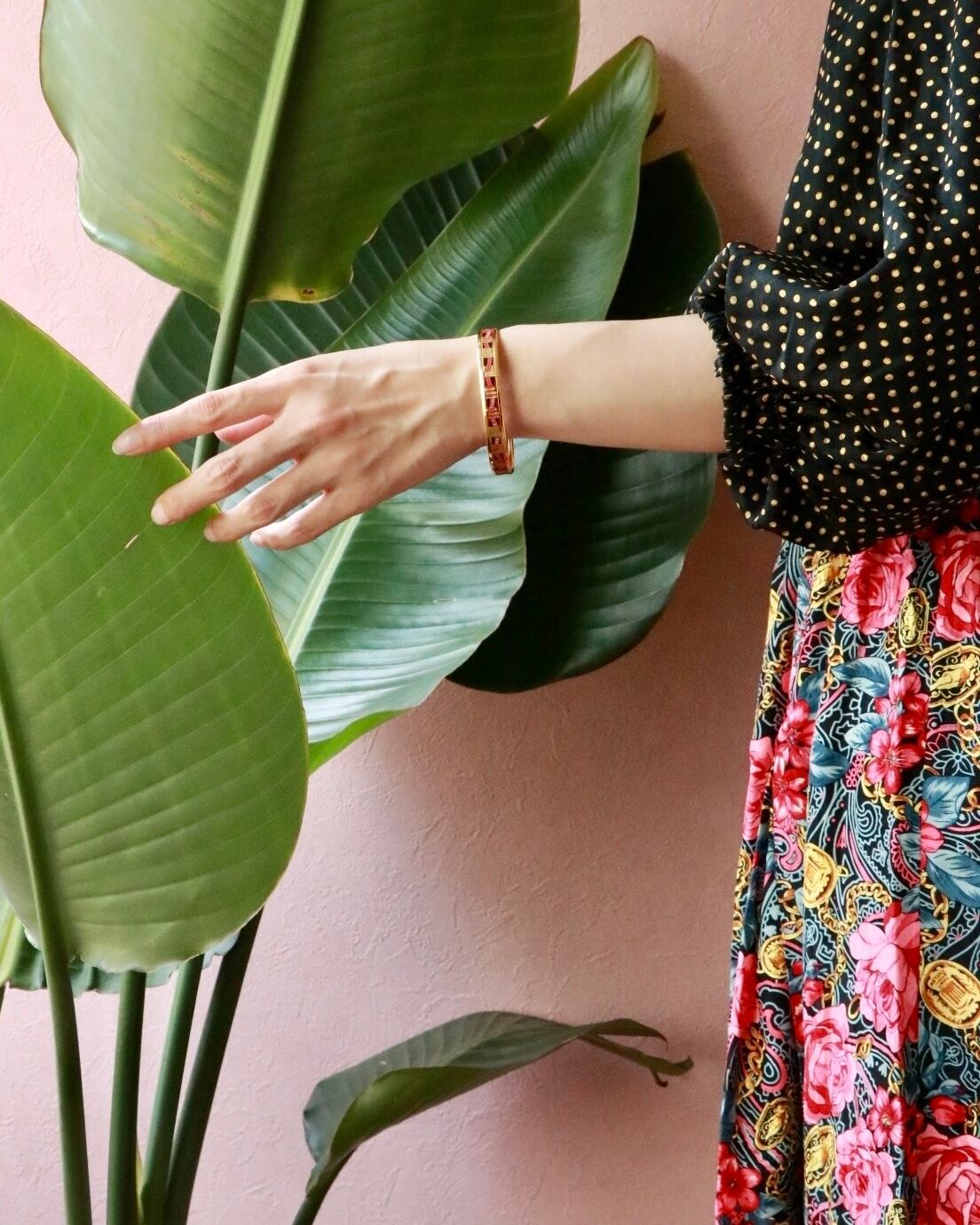 シーズンを問わないリボンテープのフェミニンなデザインと、上品な七宝焼の質感で大人女性の手元のアクセントにぴったり。シンプルなコーディネートを格上げしてくれる。