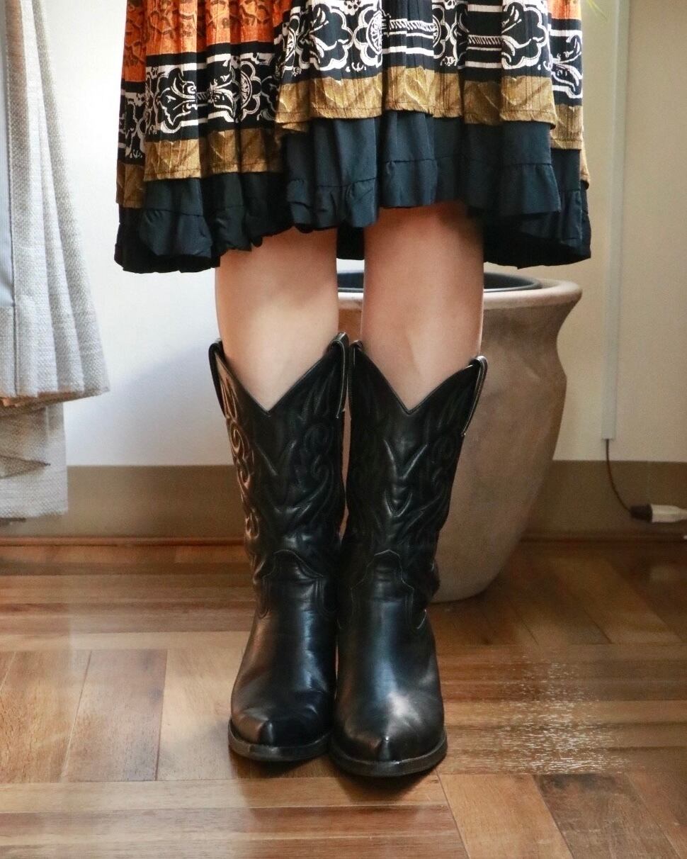 ウェスタンブーツながらもオールブラックでまとめられ、モード感もキープ。