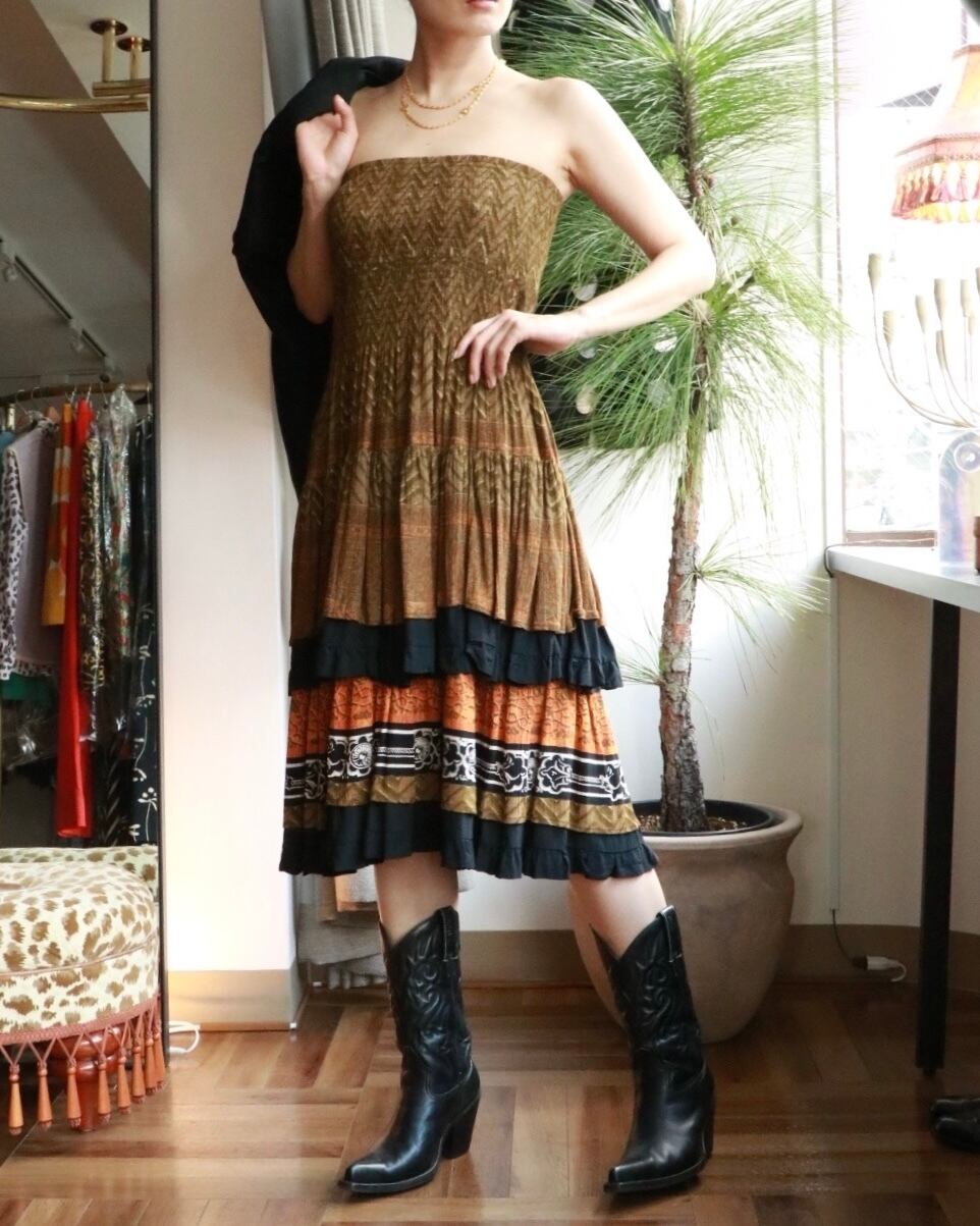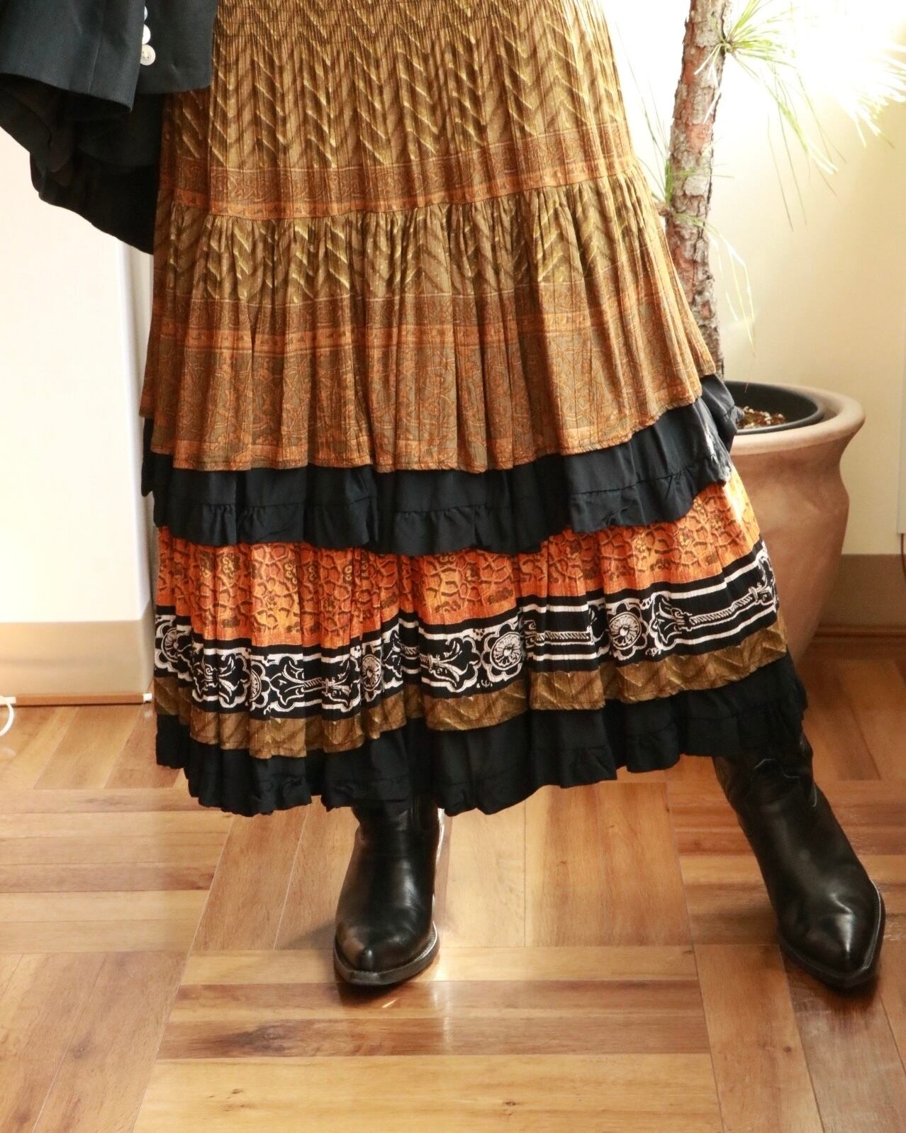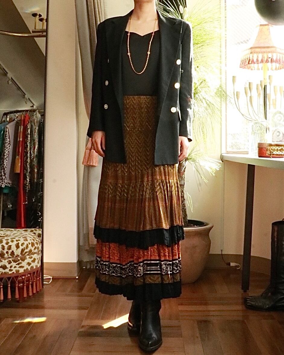 オリエンタルムードたっぷりのスカートが入荷。美シルエットで、2段に重なるプリーツが動くたびに残香を感じられるような優雅な一着。ウエストで履いても、ベアトップでも着れる2way使用で色々なスタイリングを楽しめます。カジュアルなTシャツやジャケットスタイルと合わせても品よくまとまります。