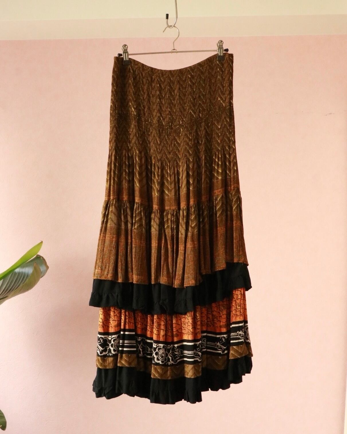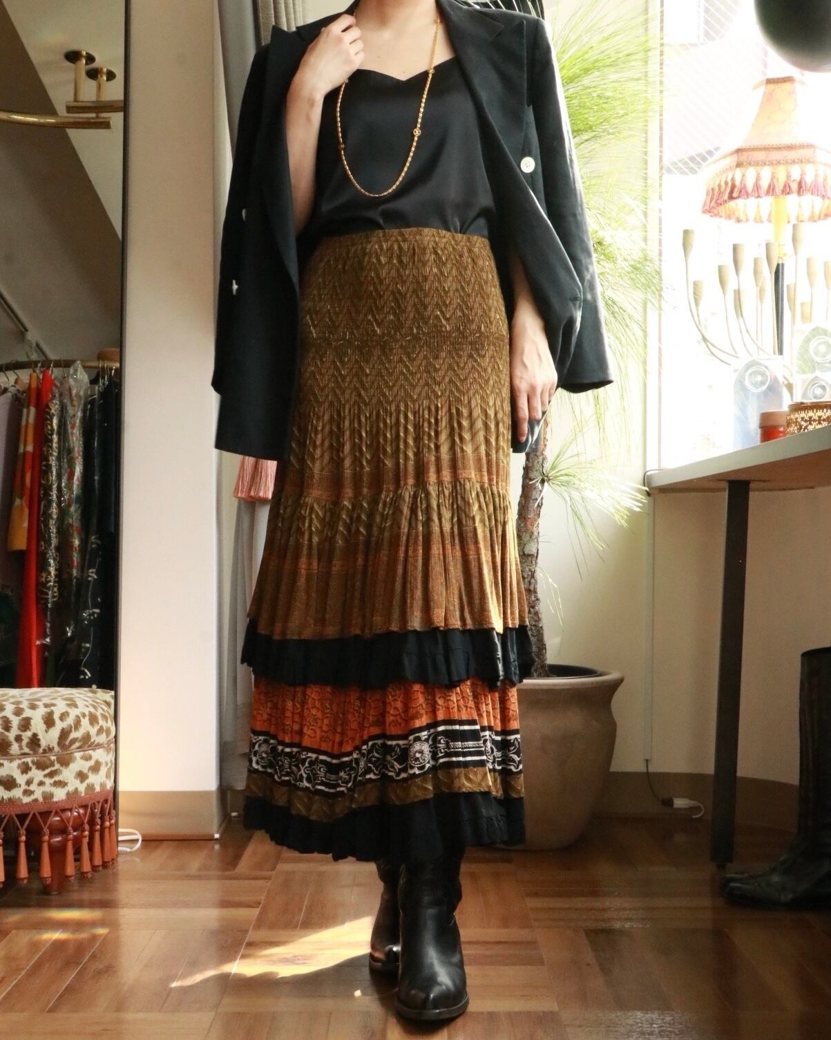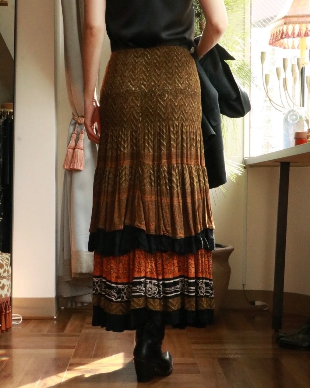 オリエンタルムードたっぷりのスカートが入荷。美シルエットで、2段に重なるプリーツが動くたびに残香を感じられるような優雅な一着。ウエストで履いても、ベアトップでも着れる2way使用で色々なスタイリングを楽しめます。カジュアルなTシャツやジャケットスタイルと合わせても品よくまとまります。
