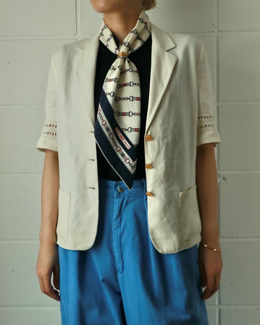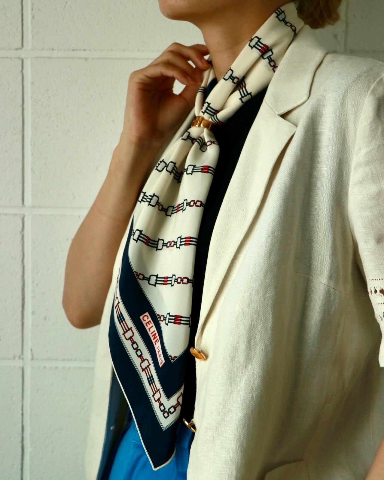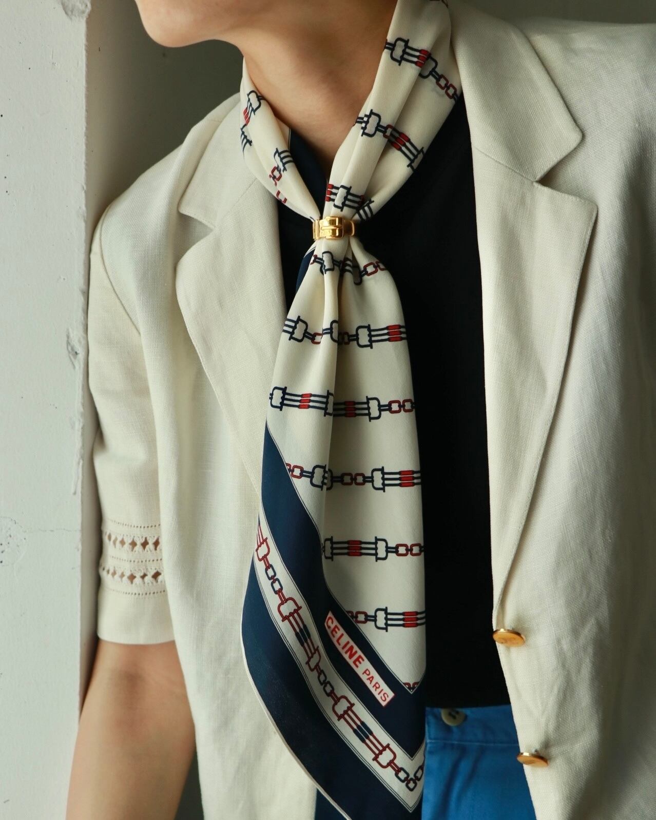 清潔感のあるホワイトをベースとした青と赤のトリコロールカラーで構成されたスカーフは、セリーヌのもの。