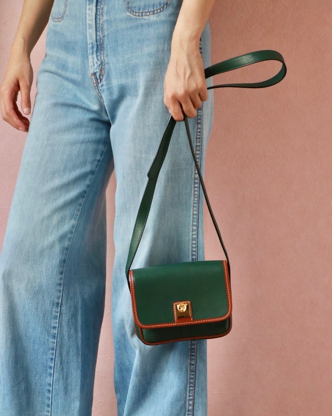 マチがあるのでこのサイズにしては収納力があり、実用的。グリーンとブラウンのコンビがコーディネートのアクセントに!