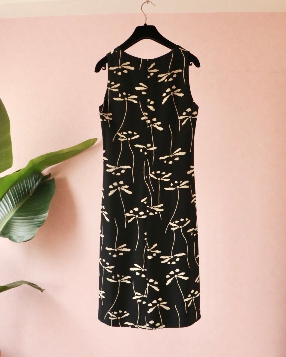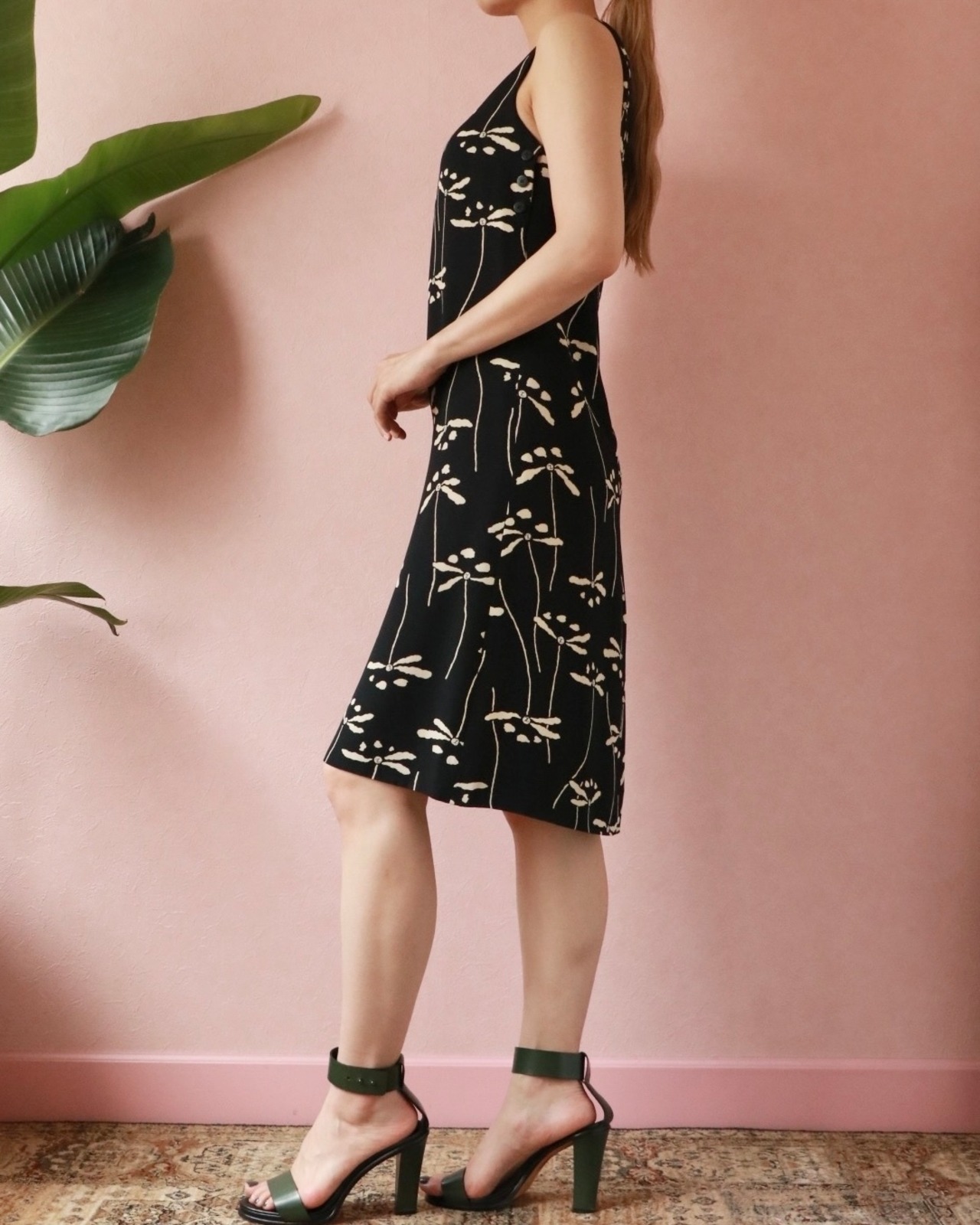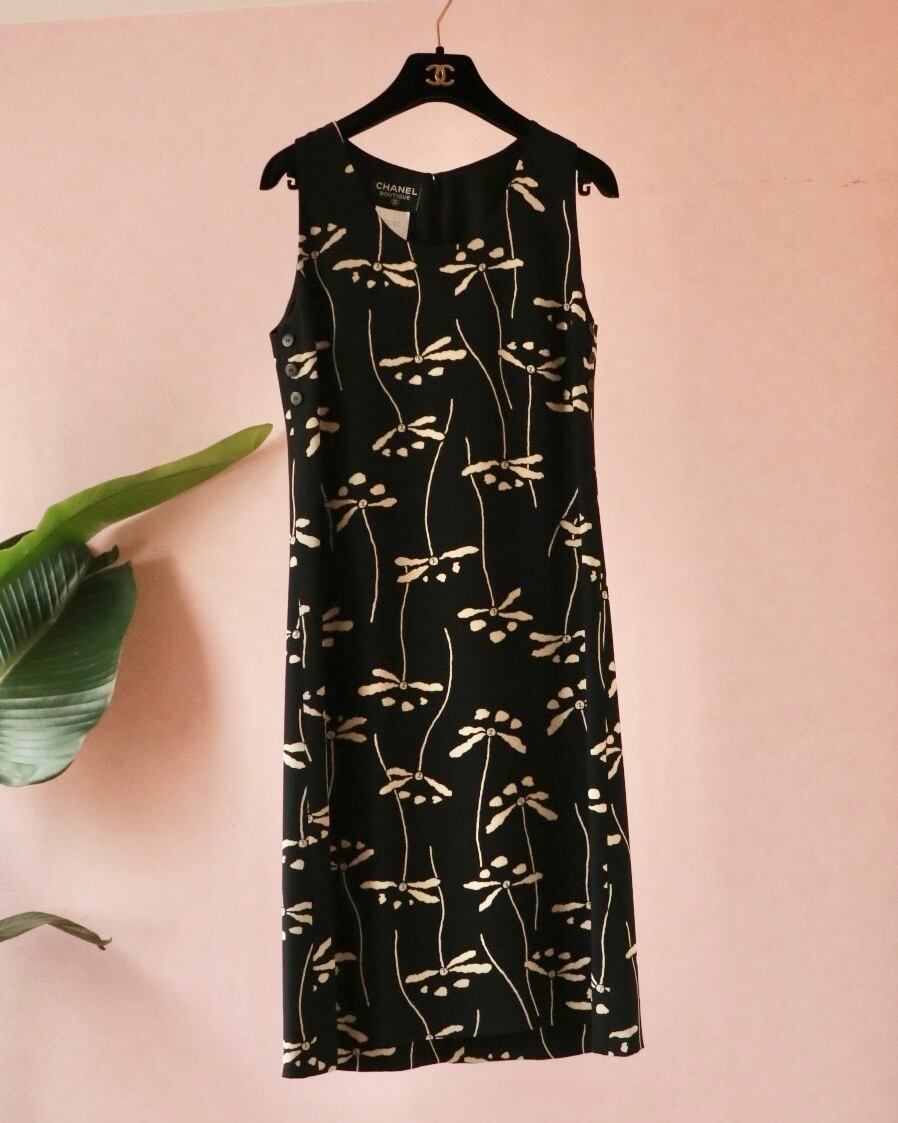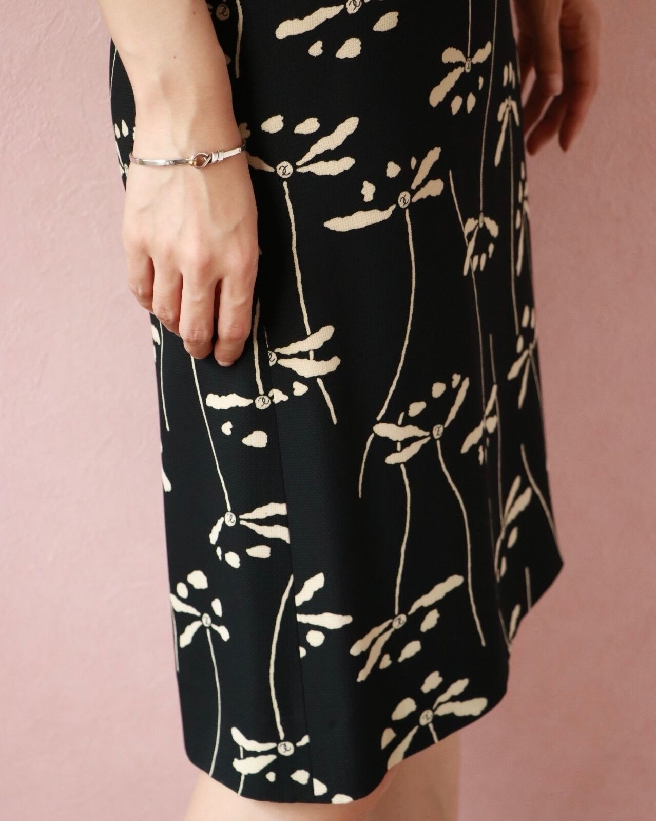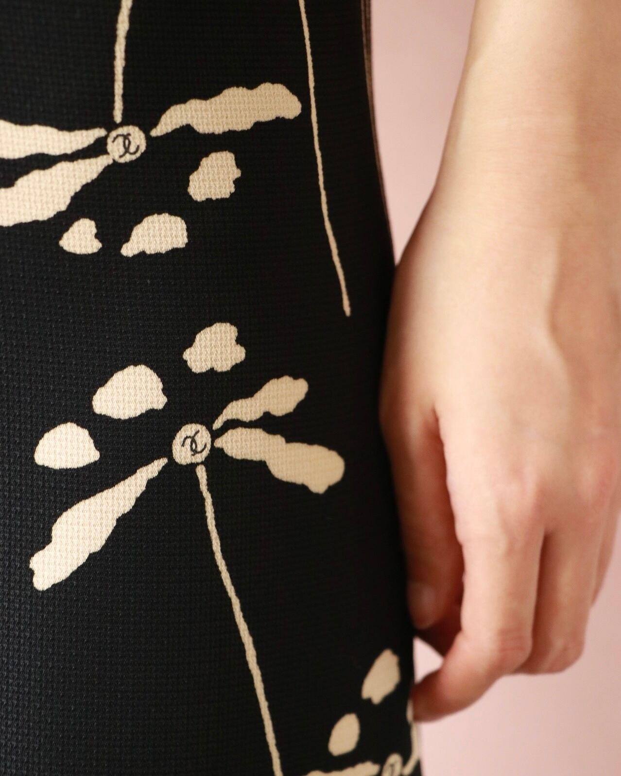トンボモチーフに黒とベージュのコンビネーションが大人カジュアルな雰囲気のシャネルワンピース。Aラインのミニマルなノースリーブデザインと伸縮性の素材がストレスフリーな着心地を叶え、クラシックな丈感で脚を長くスタイルアップして魅せてくれるスペシャルな一着。