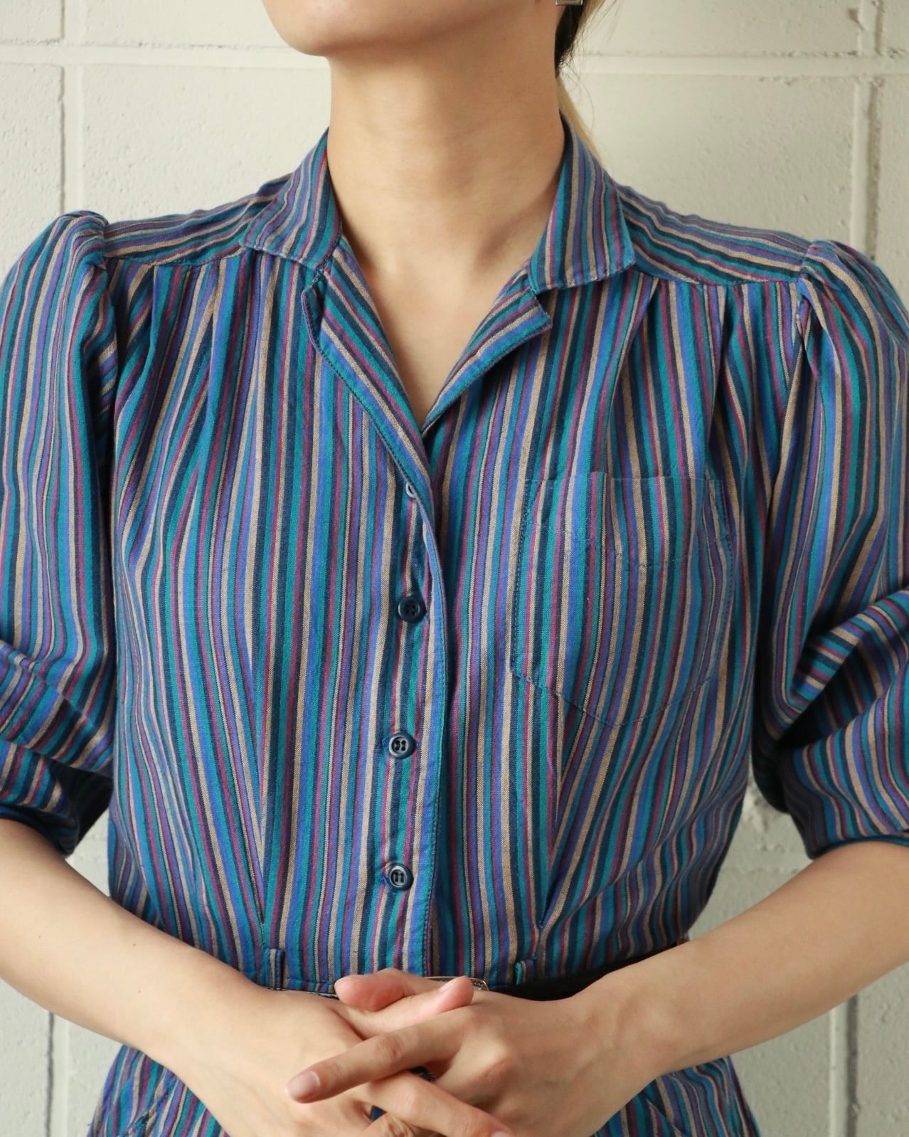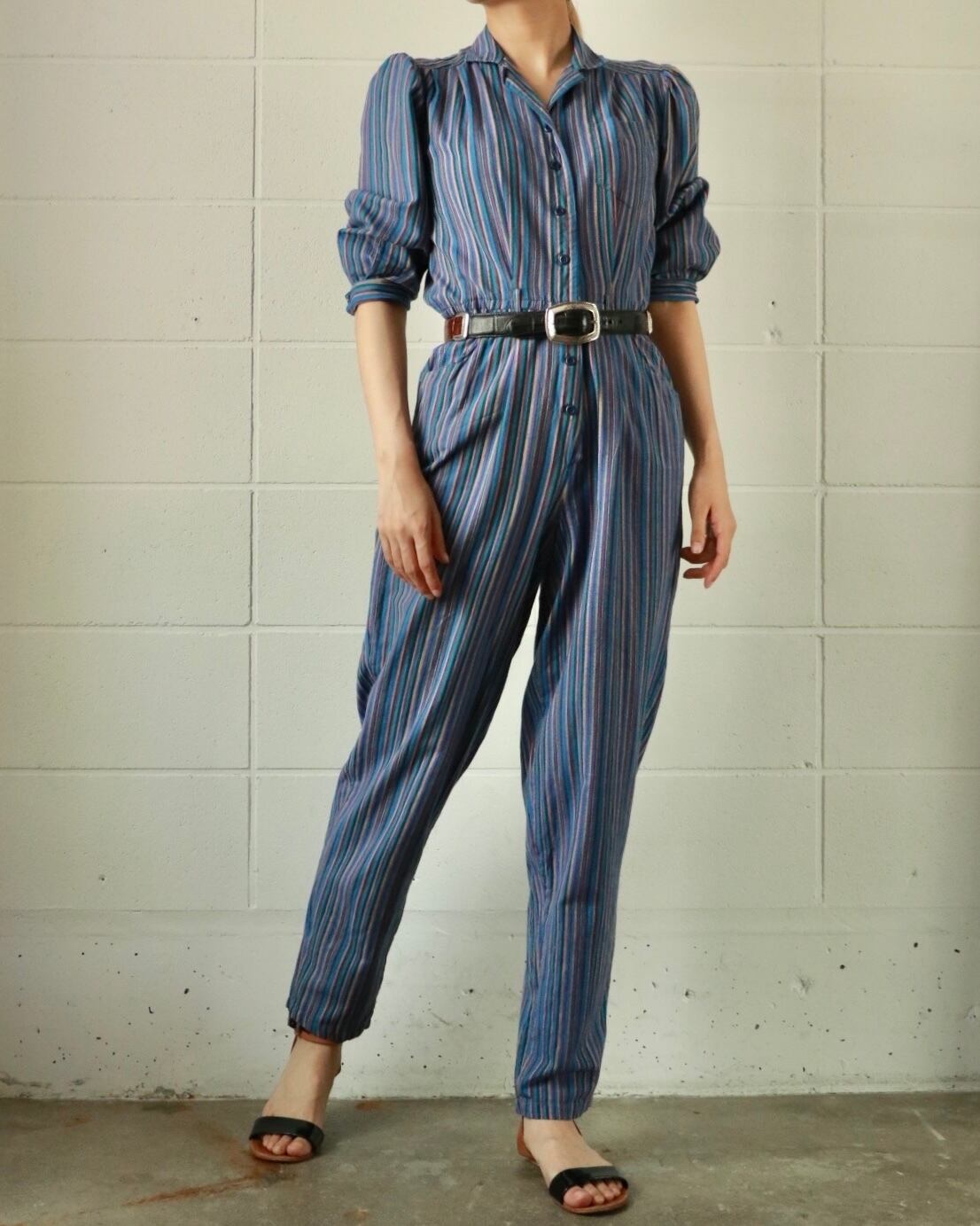 ヴィンテージならではのマルチカラー。カジュアルになりやすいオールインワンも程よいパフスリーブでスタイルアップにも。ウエストマークにベルトやスカーフで小物使いも楽しみたい。コットン素材でサラリとした着心地で、これからの季節に沢山着たい1枚です。