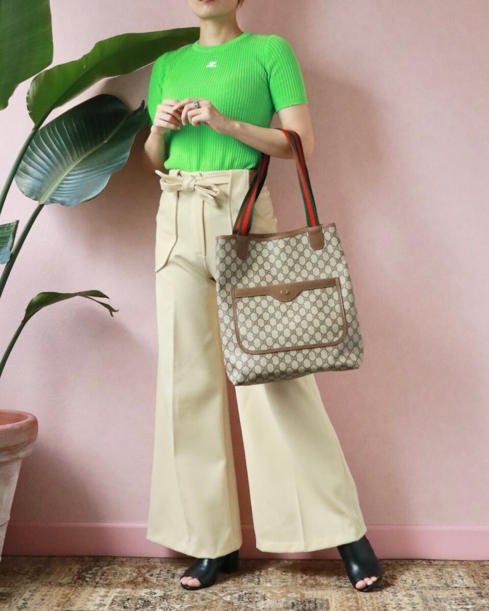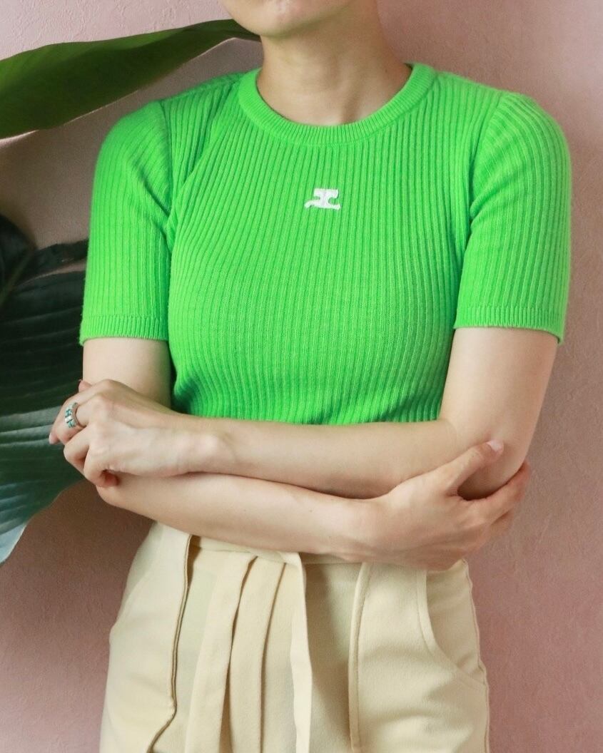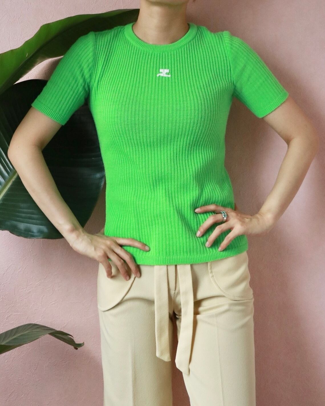 ブライトなグリーンカラーが目を引く70年代のクレージュニット。タイトでミニマルなシルエット、首元の詰まったデザインがクレージュらしい一着。普遍的な人気を誇る不動のデザインは、ボトムスを選ばず大活躍します。