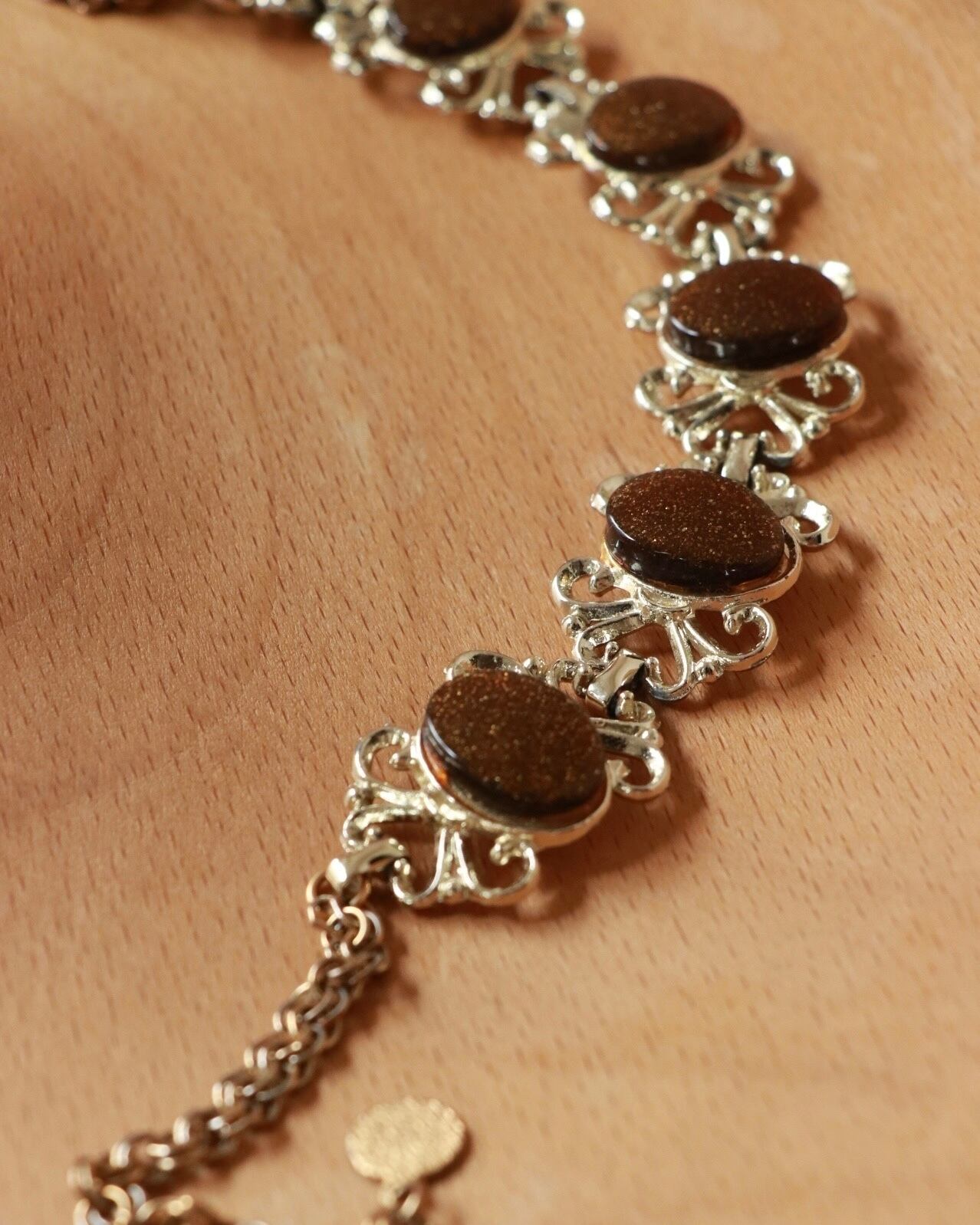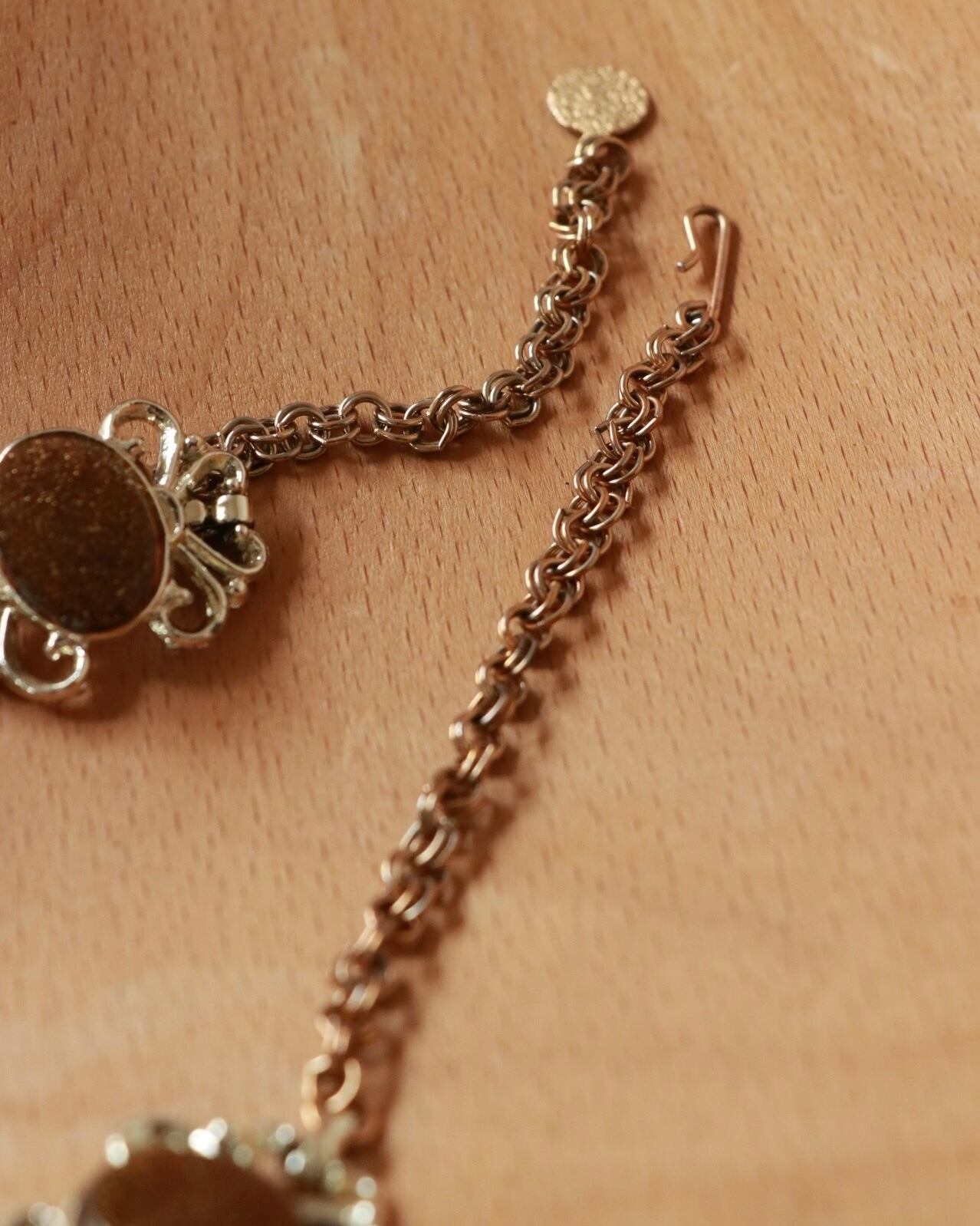 ゴールドラメが入ったブラウンカラーのモチーフとシルバーが華やさのあるデザインのヴィンテージチョーカーネックレス。シーンを問わず首元から覗かせるてコーディネートのアクセントとして取り入れてみてはいかがでしょうか。