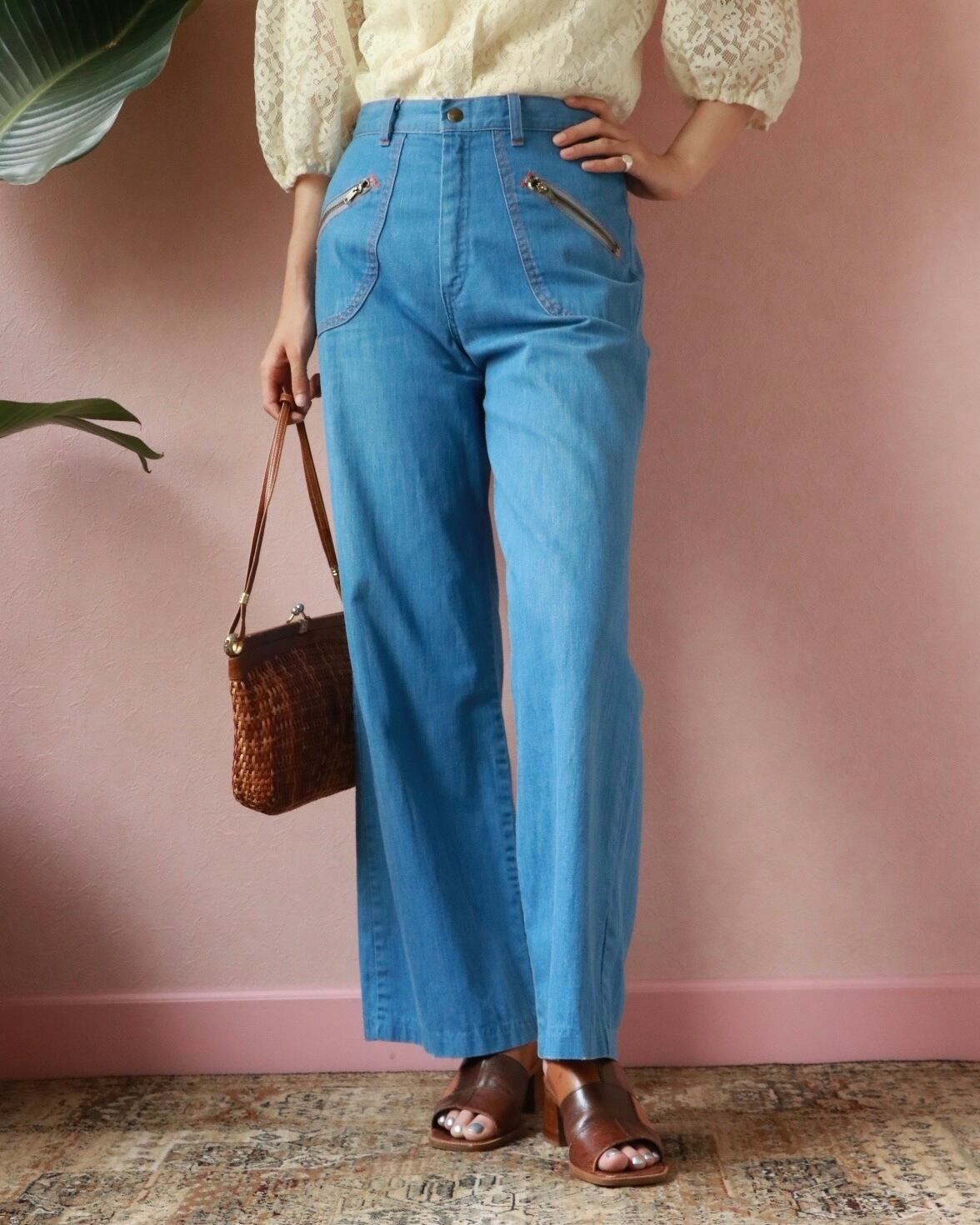 薄手のデニム生地なので季節問わず軽やかに肌に馴染み、70s特有の腰回りピタピタなデザインではないのでより心地良く過ごせる。ジップポケットにオレンジステッチがアクセントに。