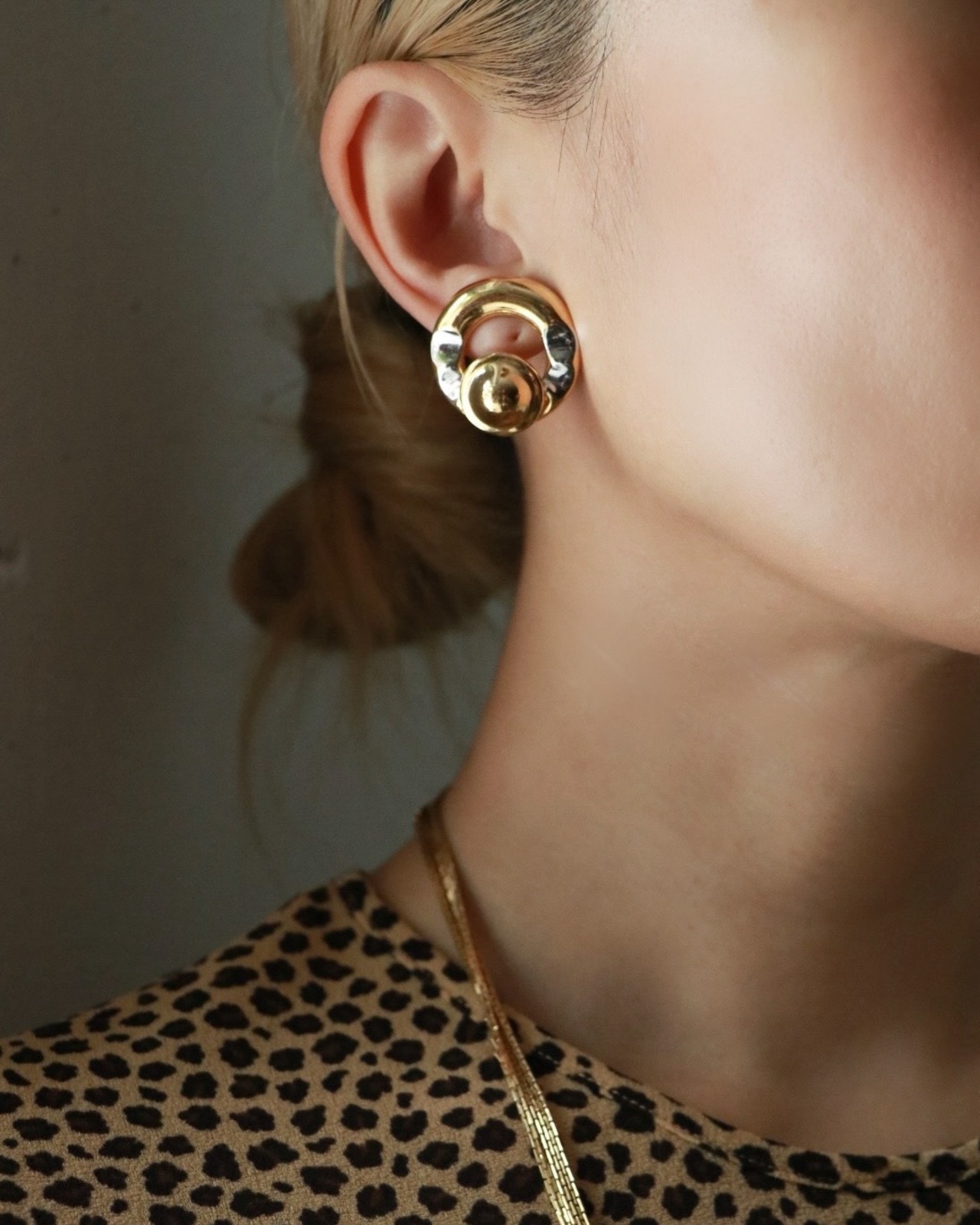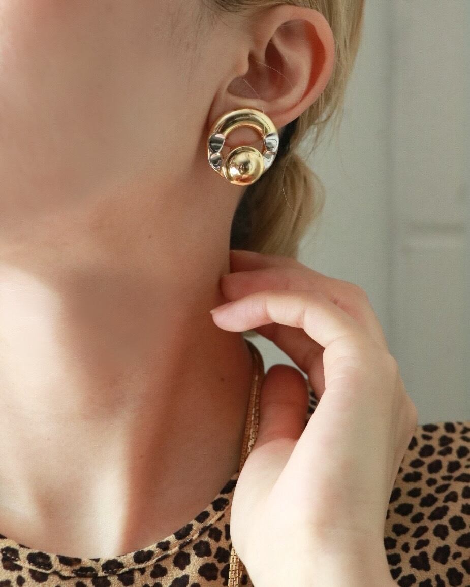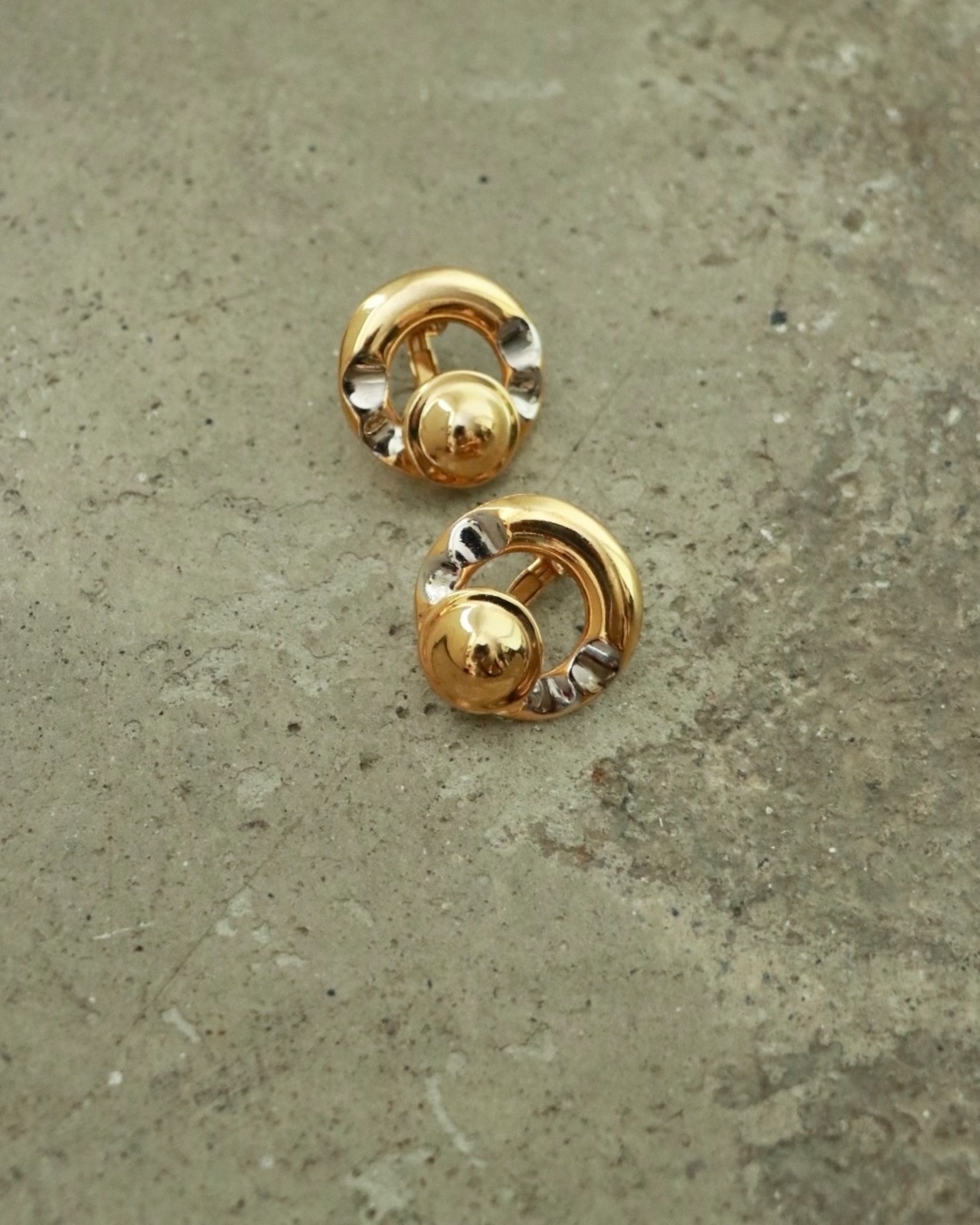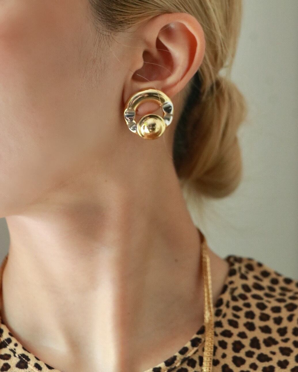 顔周りをぱっと華やかにしてくれるヴィンテージイヤリング。立体的なフォルムでどの角度から見ても美しい。シルバーxゴールドのコンビでお手持ちのアクセサリーとも合わせやすい。カジュアルにもドレスアップにも◎