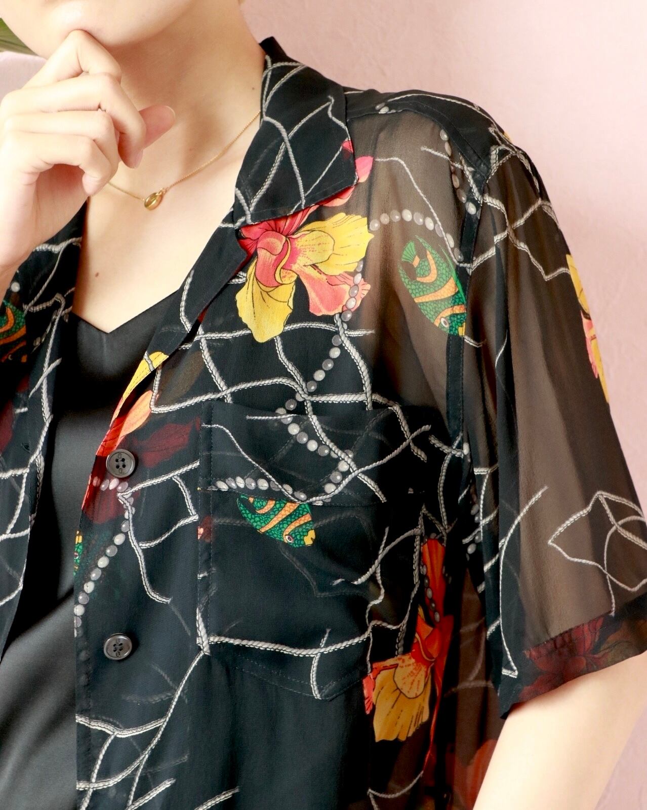 大きな花柄の大胆なプリントでありつつ派手すぎないのはブラックカラーと透け感!