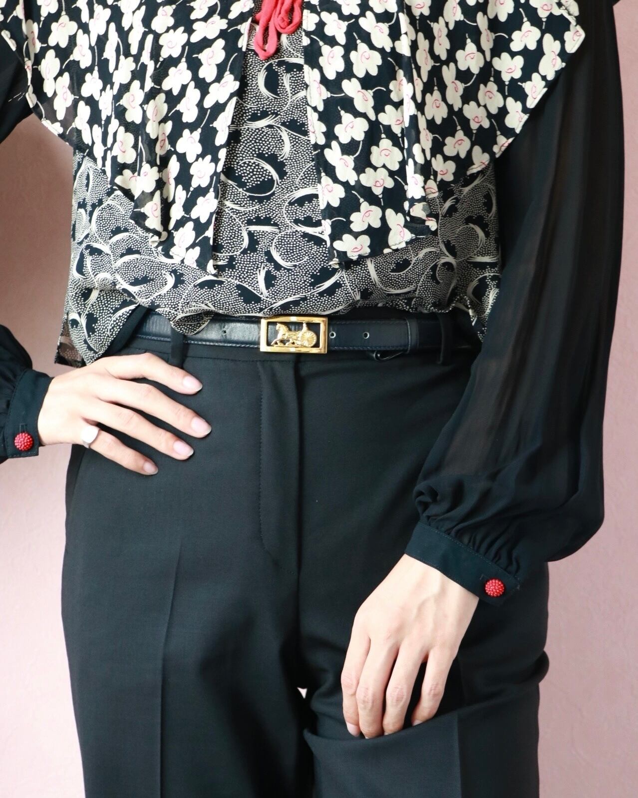 ダークネイビーのベルトに馬車ロゴが上品に輝く。