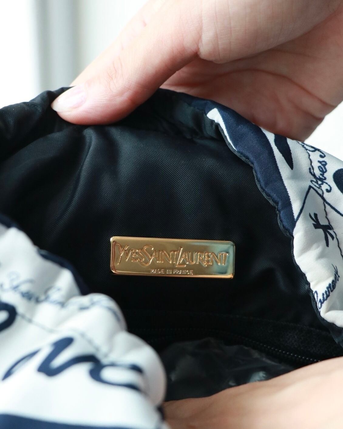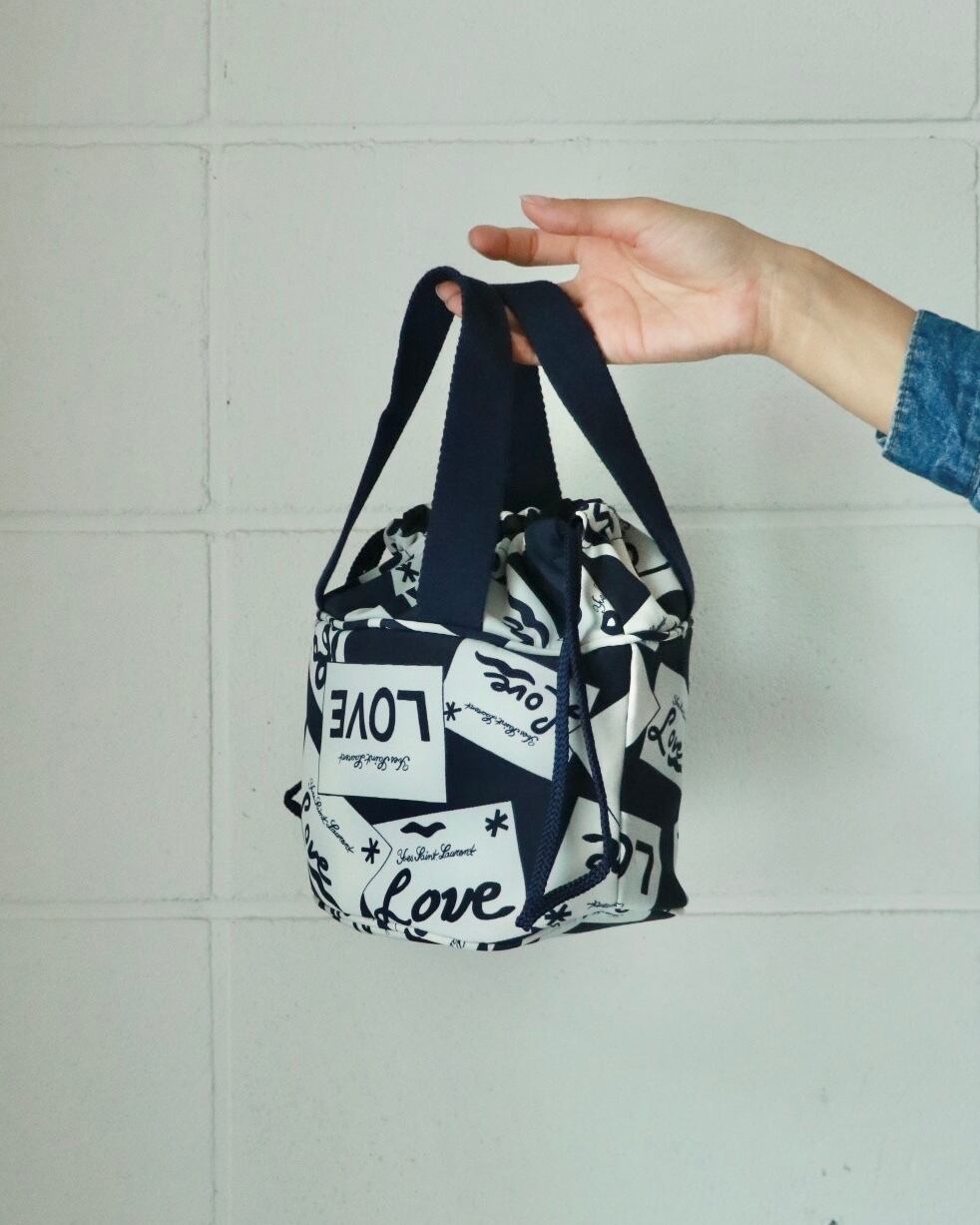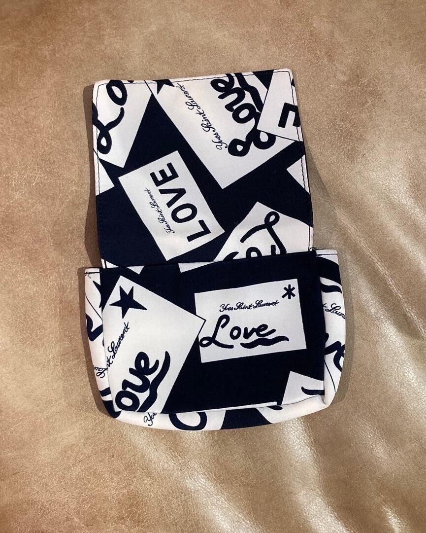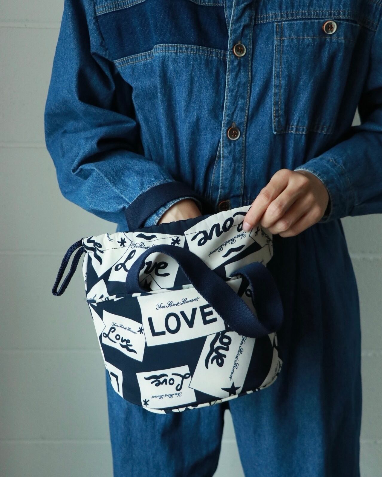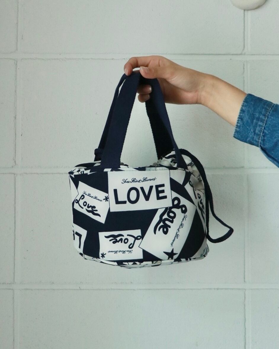 LOVEモチーフのポップなバッグはイブサンローラン。ペットボトルも入ってしまう実用的なサイズ感の巾着型ハンドバッグ。ナイロン素材がとっても軽量で、折り畳みができるので旅行でも大活躍します。中には可愛いポーチがセットで付いてます。