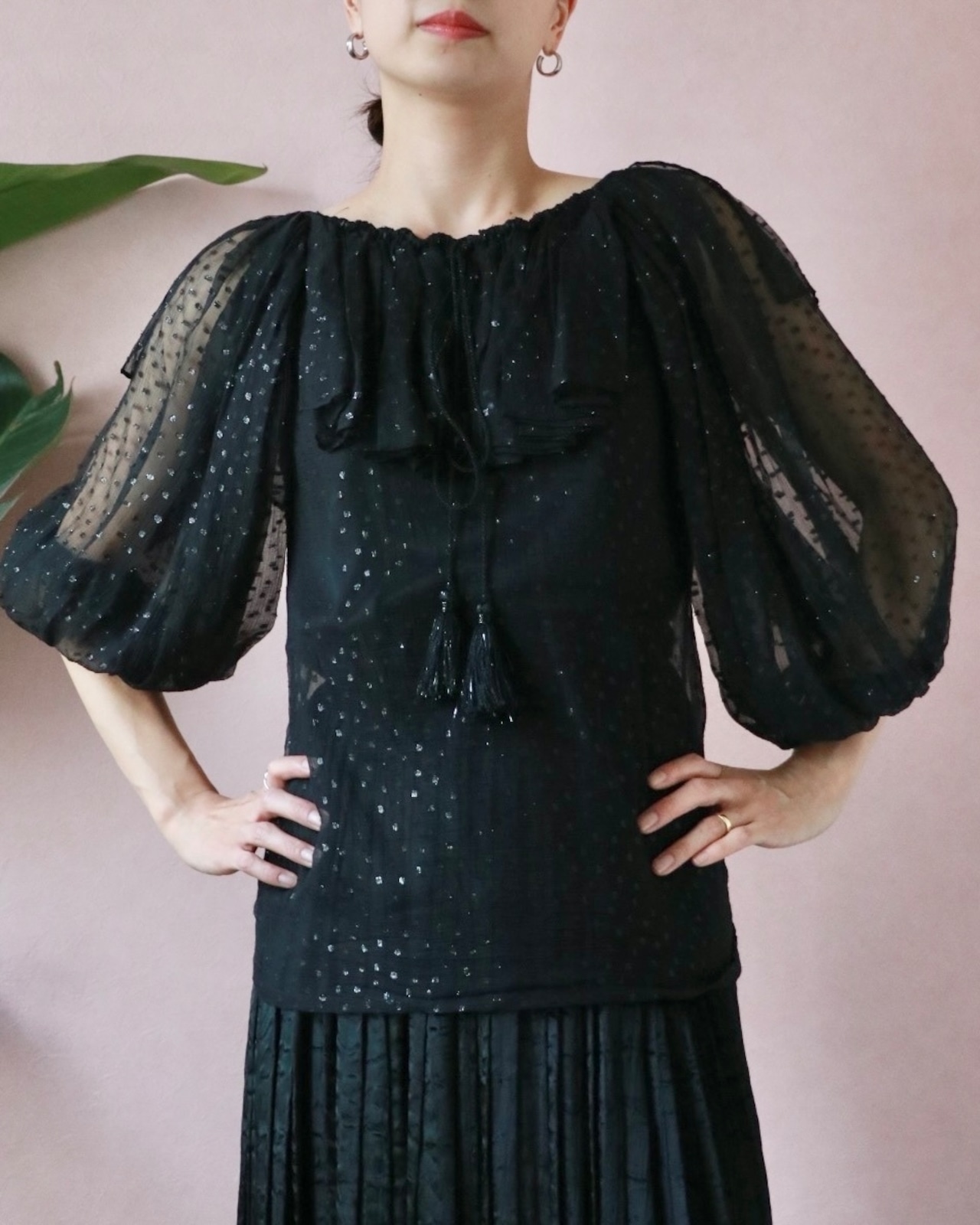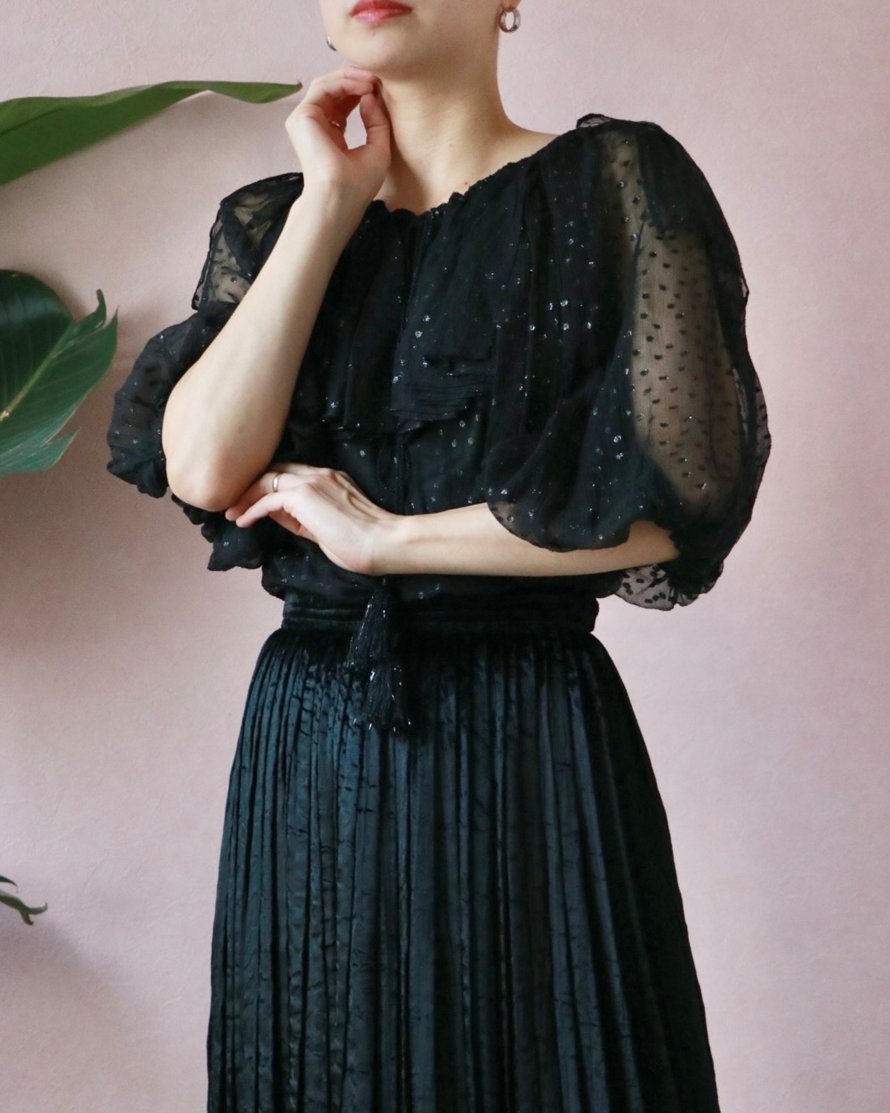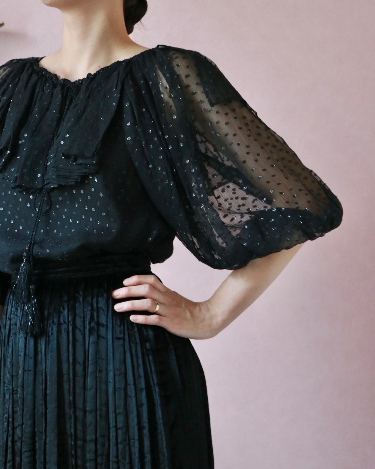 今にも踊り出したくなるバルーンスリーブやタッセルリボンがフェミニンなアクセント。