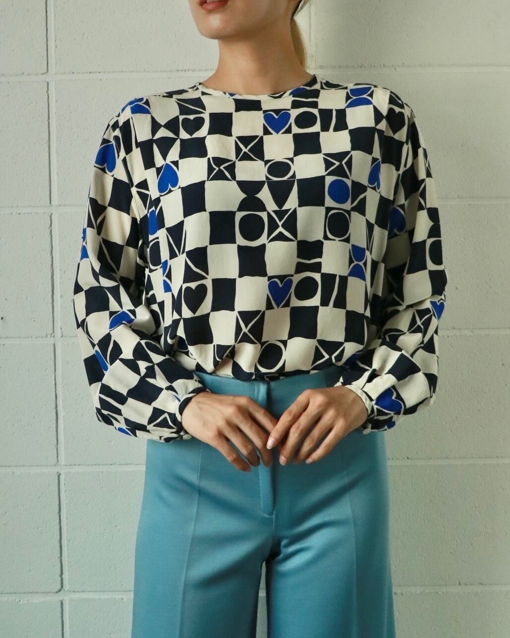 遊び心をくすぐるプリントがアクセントになったシルク100%の艶やかな光沢と滑らかな着心地でリュクスな気分に。カラーパンツで合わせてもモノトーンで合わせても個性が光ります。重宝すること間違いなし◎