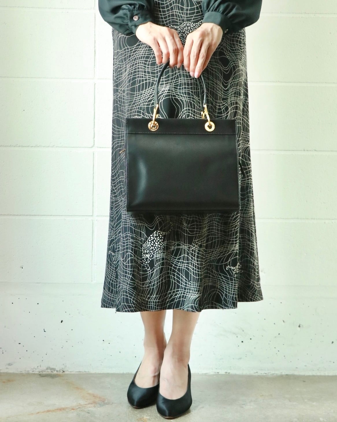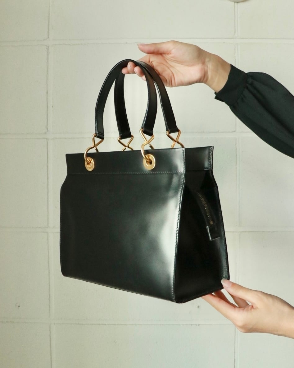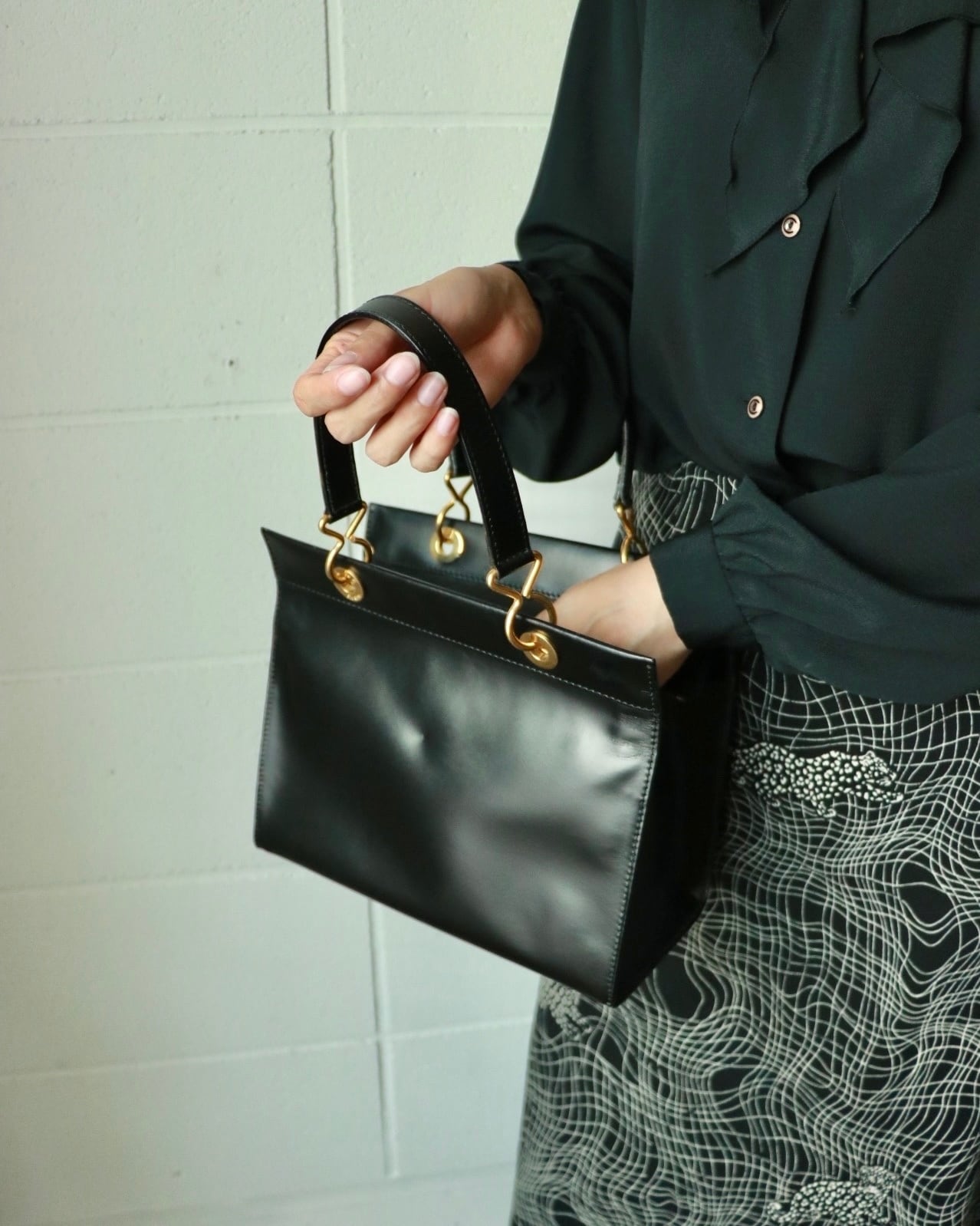 オールドセリーヌらしい上品でクラシカルなデザイン。煌びやかなゴールド金具と艶めくブラックレザーが際立つミニマムさ。どんなシーンにもハマる一点。