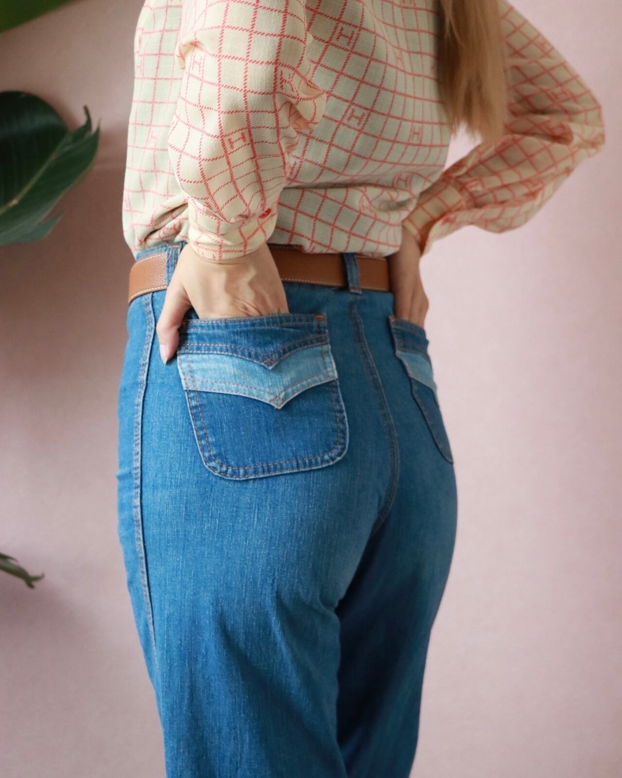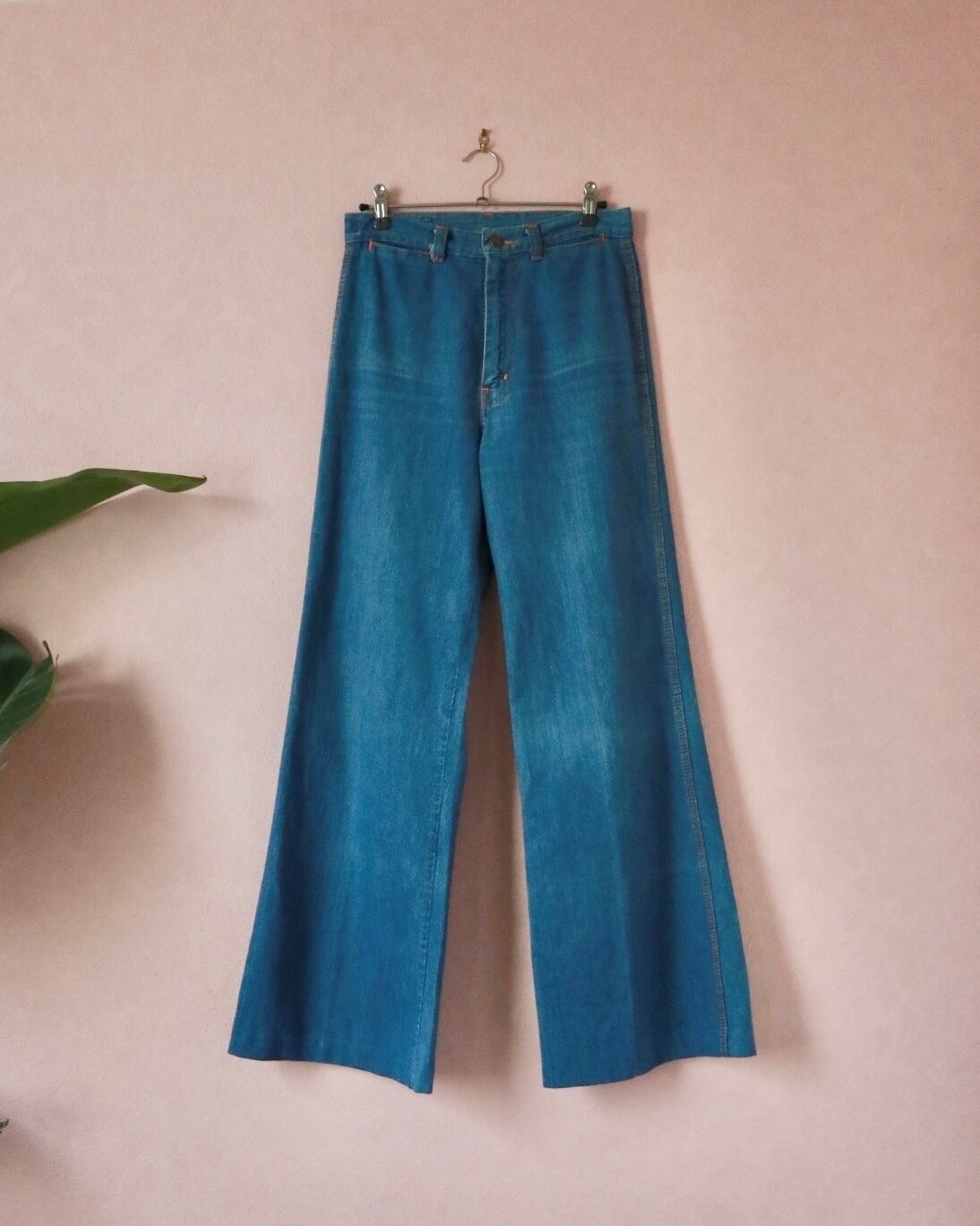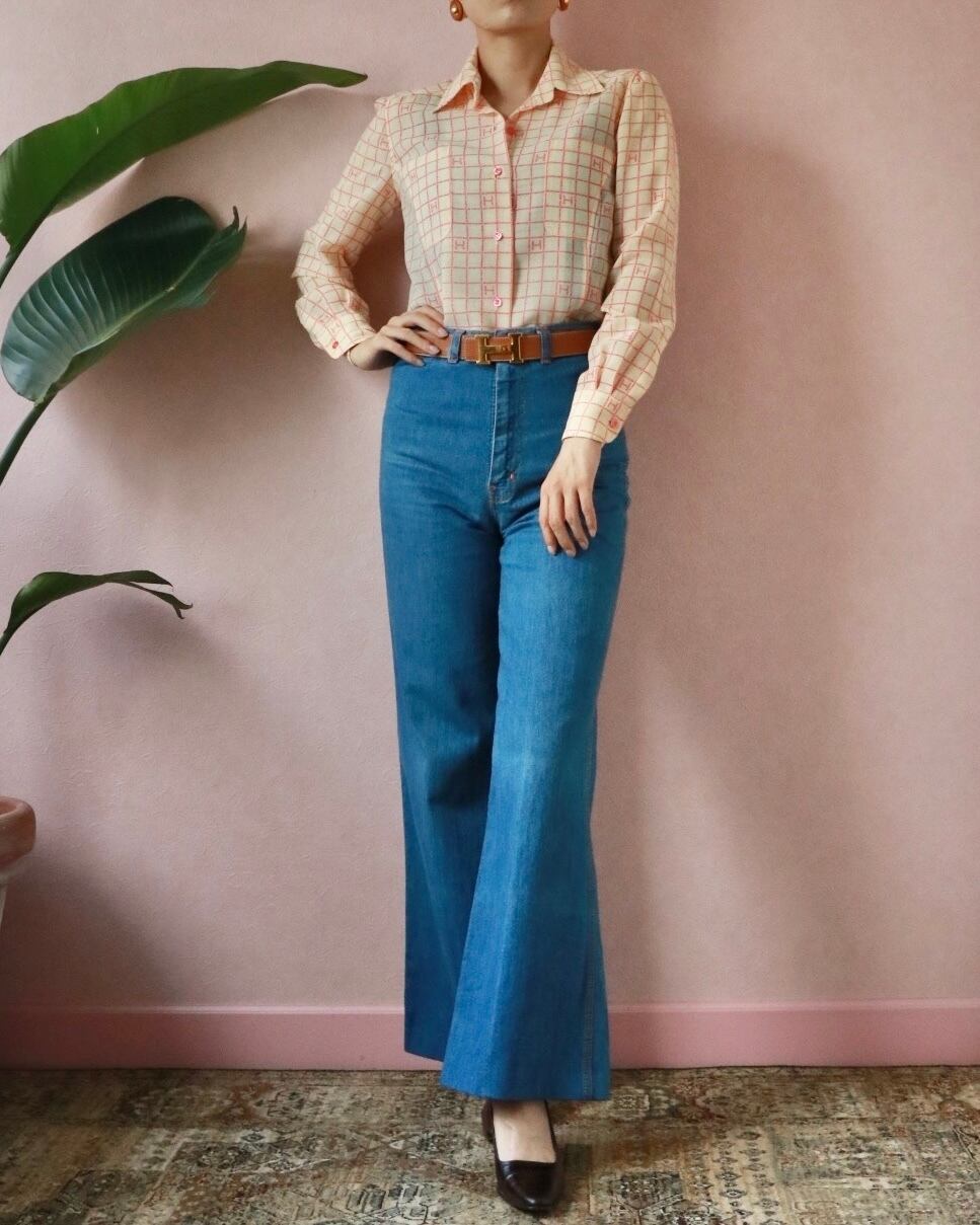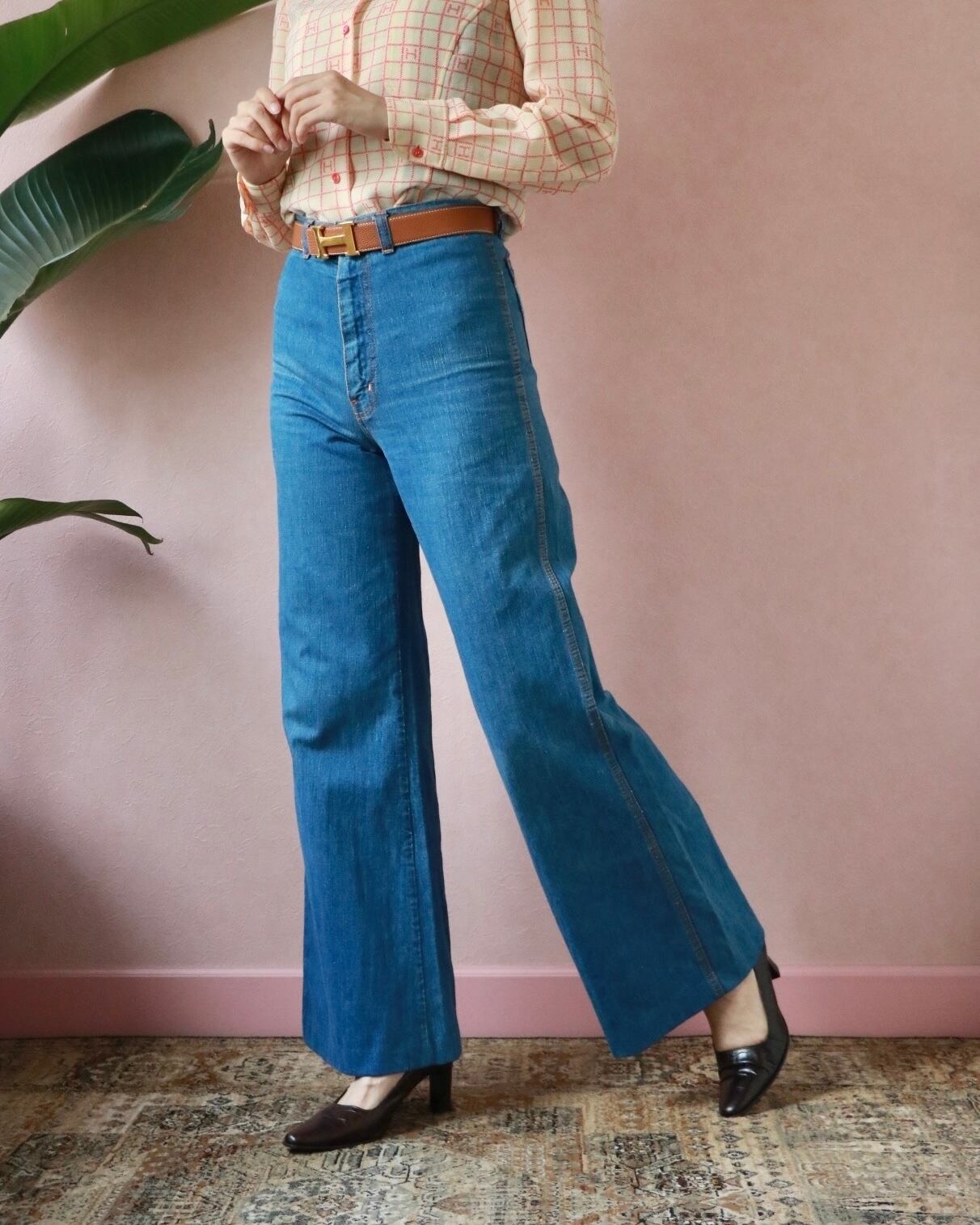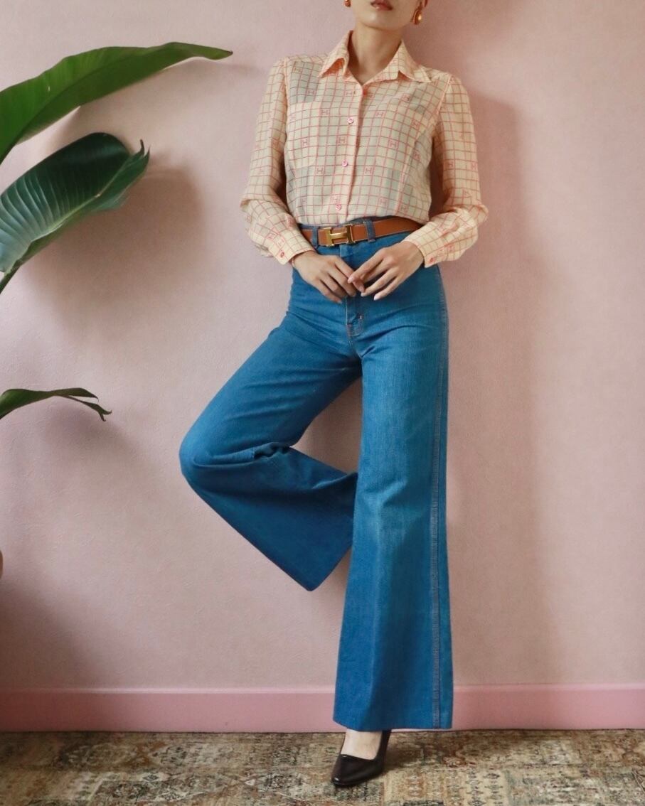 70'sらしいハイウエスト×フレアシルエットのコンビは、美しいレッグラインを仕上げてくれる。
