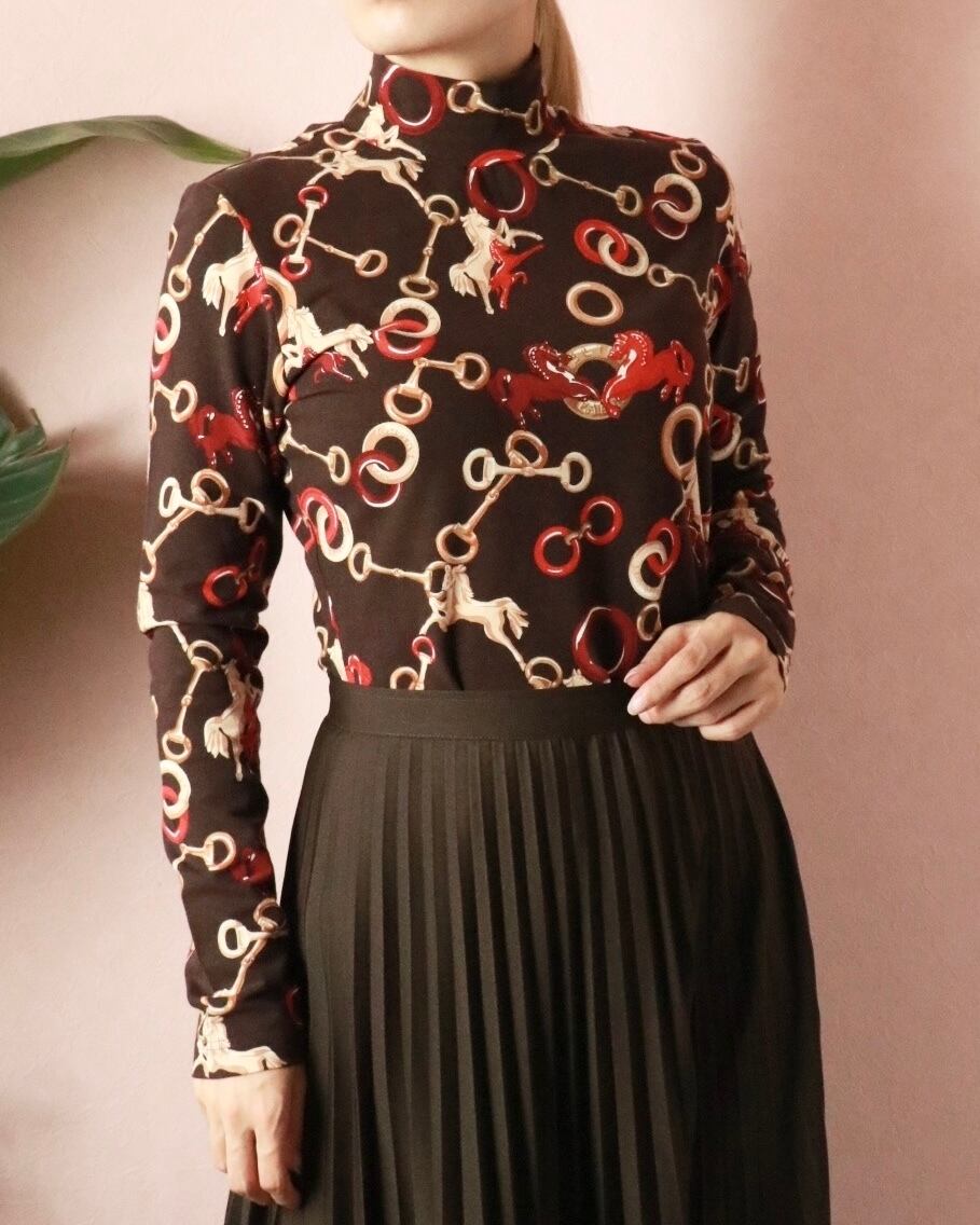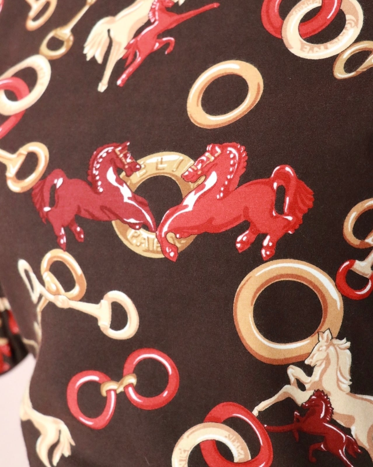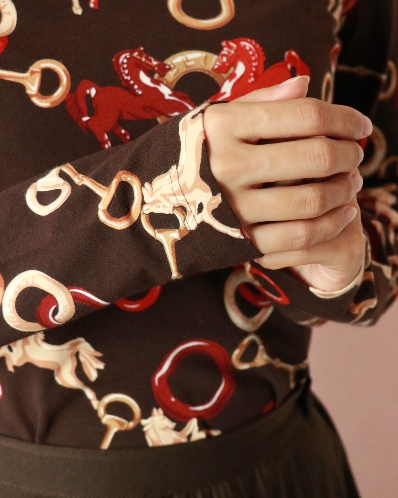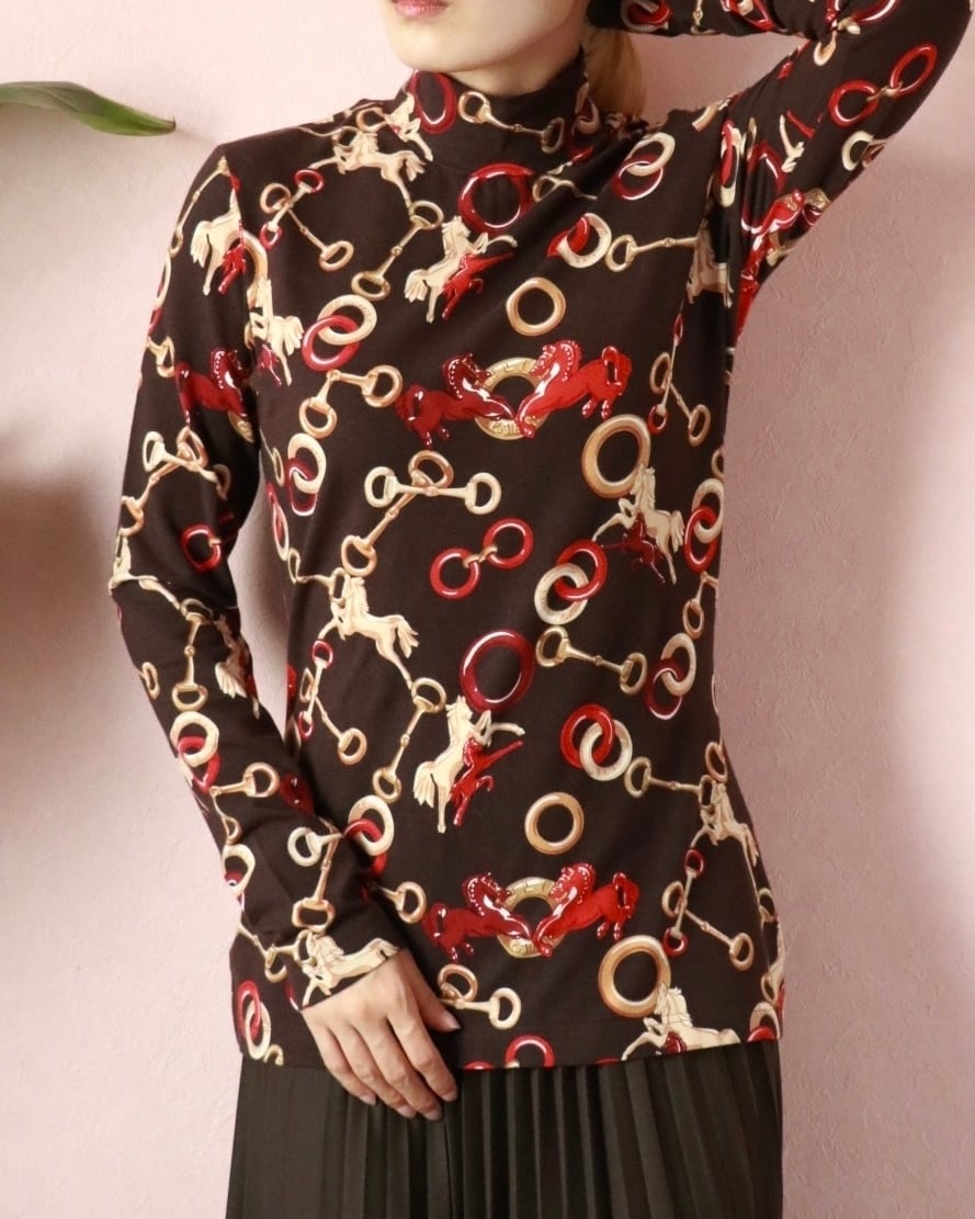 シーズンムードを高める、茶色ベースにホースビットやサークルロゴ、馬の総柄があしらわれたデザイン。