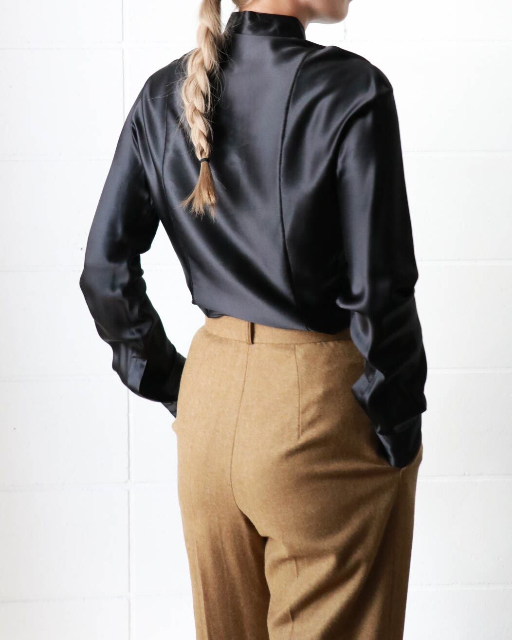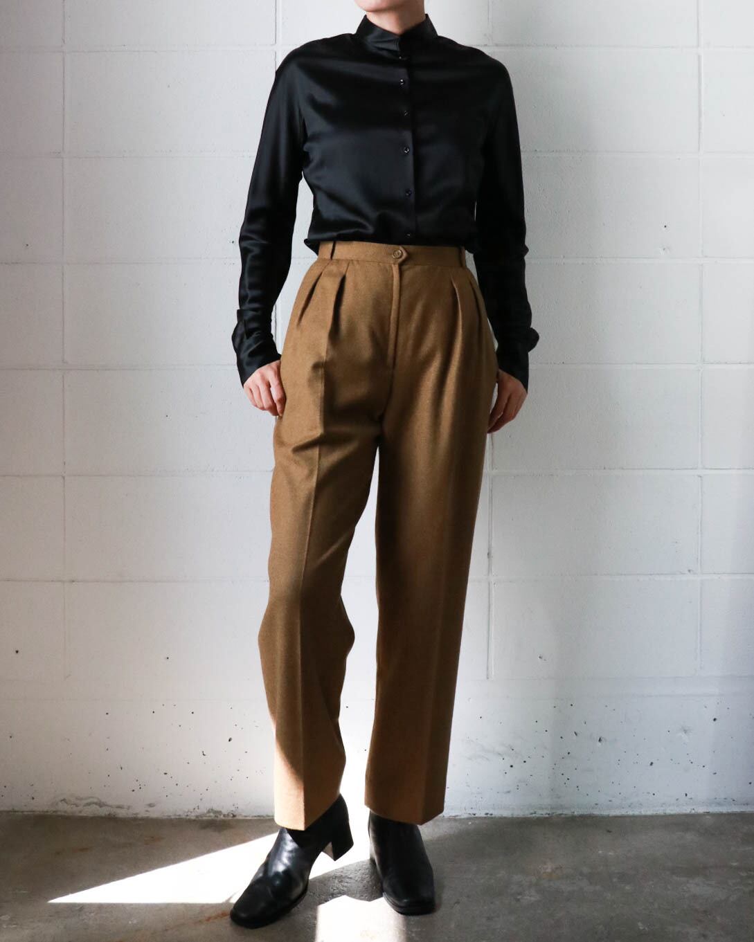 オールブラックにサテン素材がエレガントな組み合わせのクリスチャンディオールブラウス。