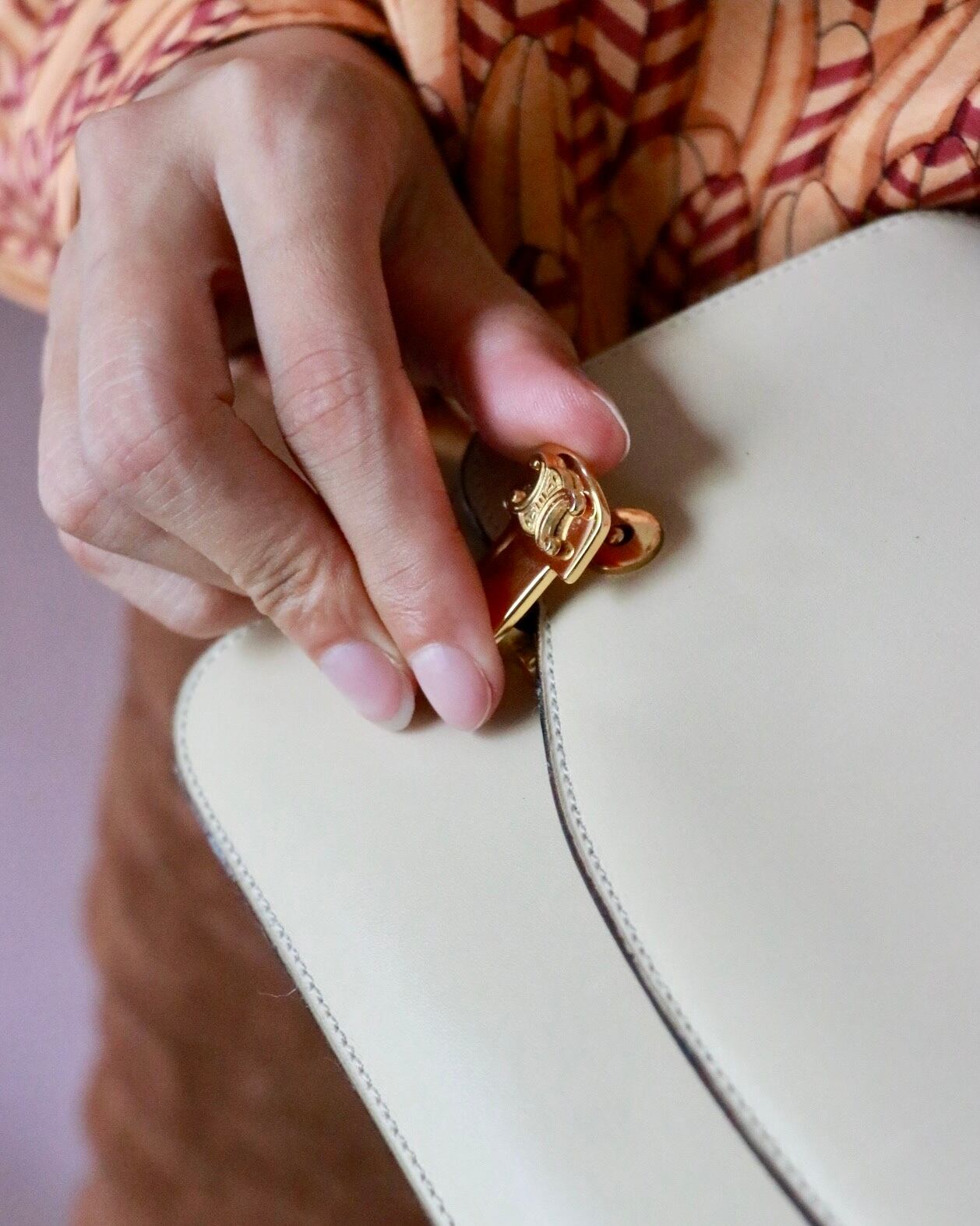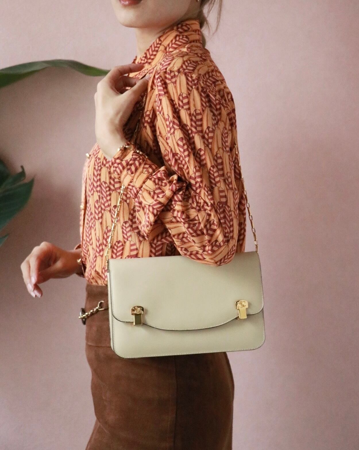 落ち着いたベージュカラーに、マカダムの留め金具とチェーンの持ち手がアクセント。