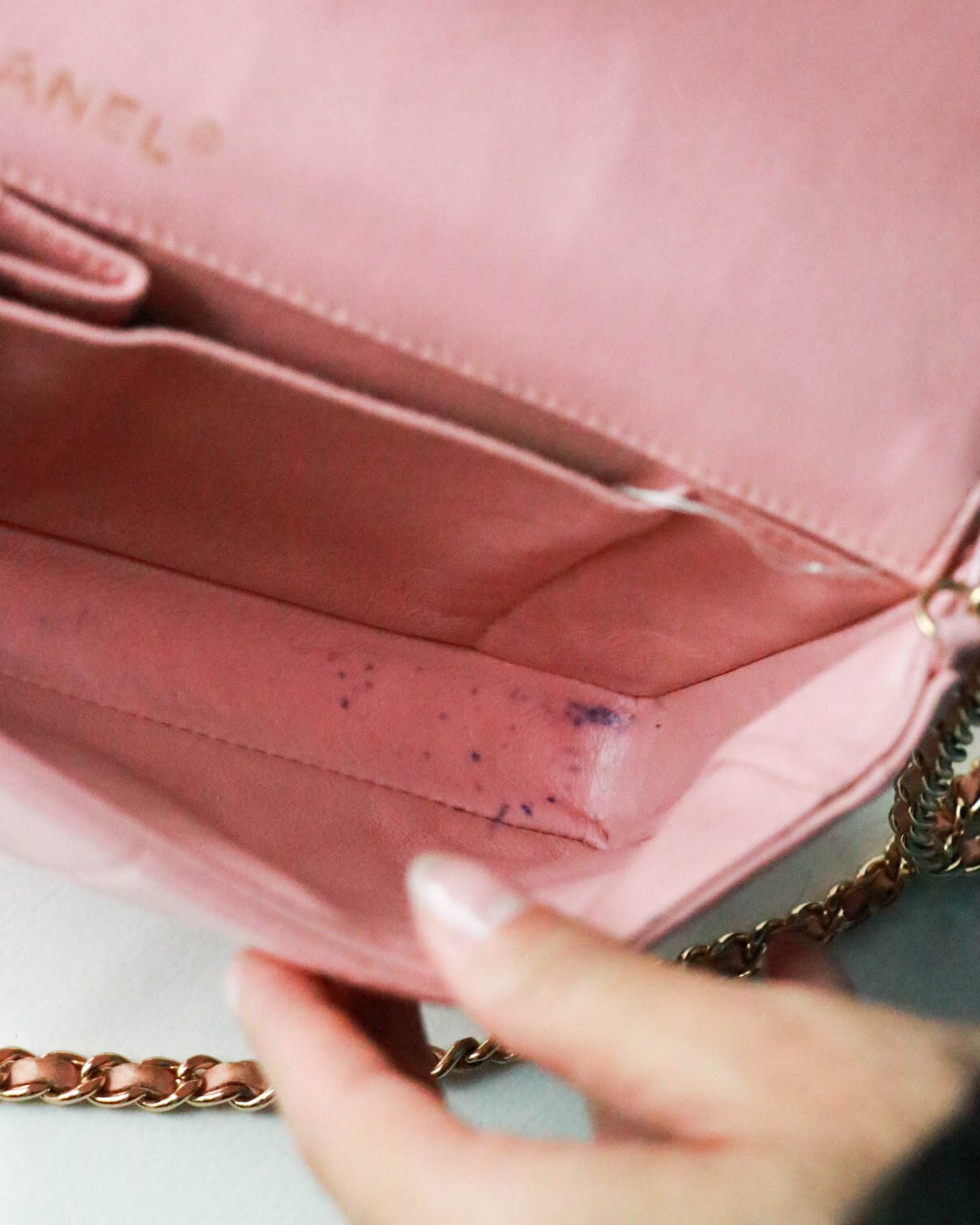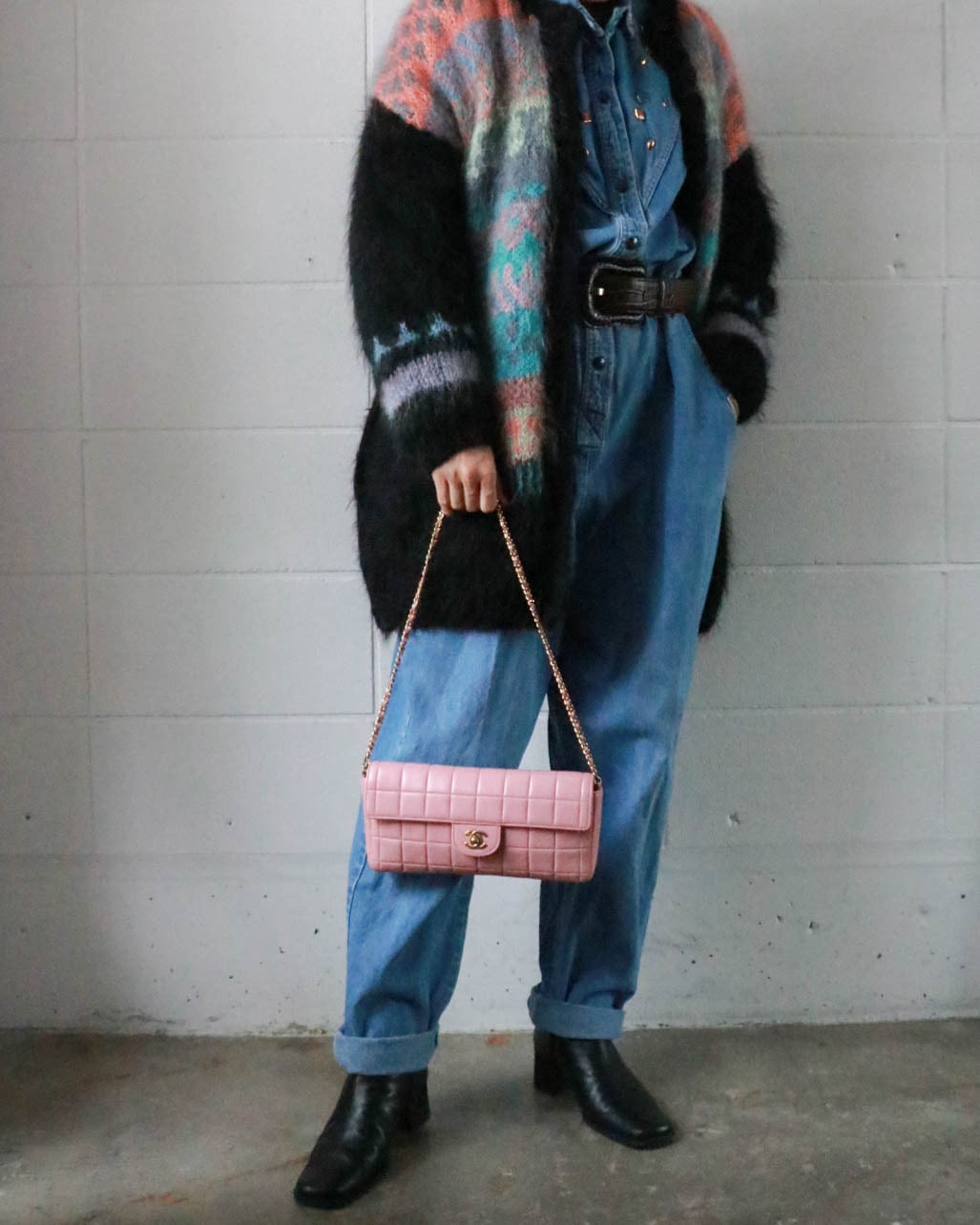 シャネルのアイコン的デザイン「マトラッセ」は斜めにステッチが入ったキルティングが印象的ですが、チョコバーはステッチが縦に入ることで、その名の通り板チョコを連想させるデザインが特徴。ベビーピンク色に染まったバッグはその存在だけでもうかわいい。