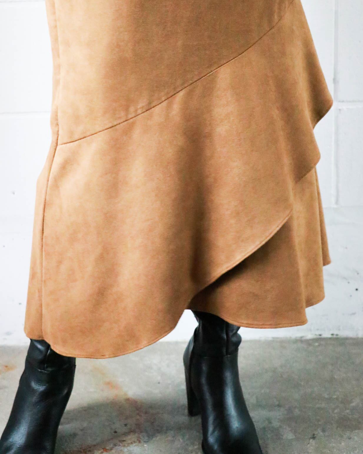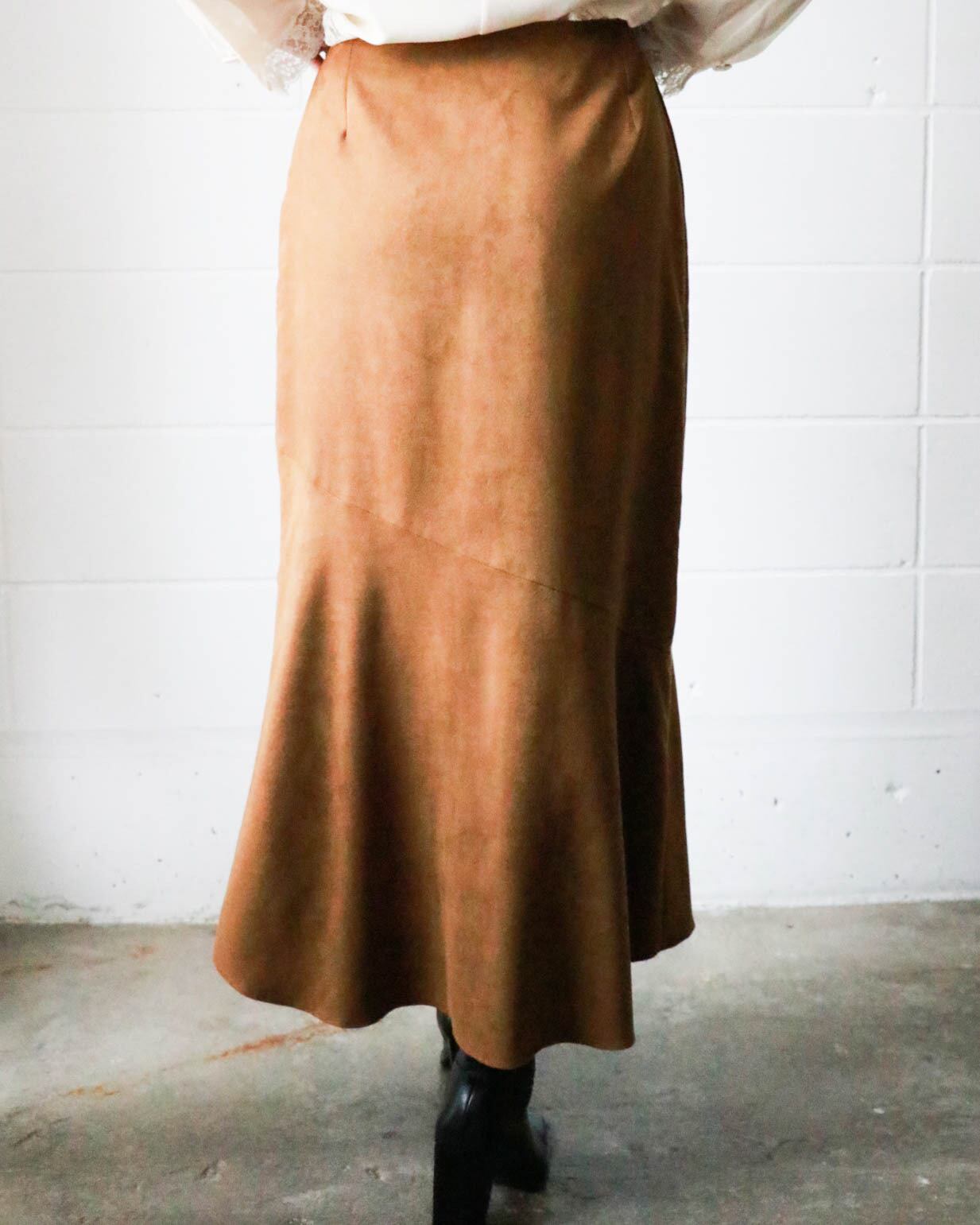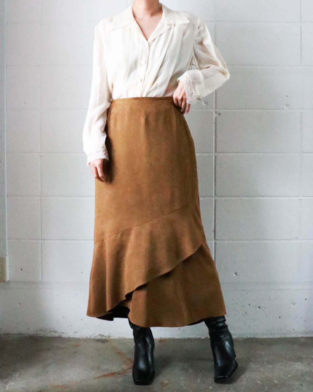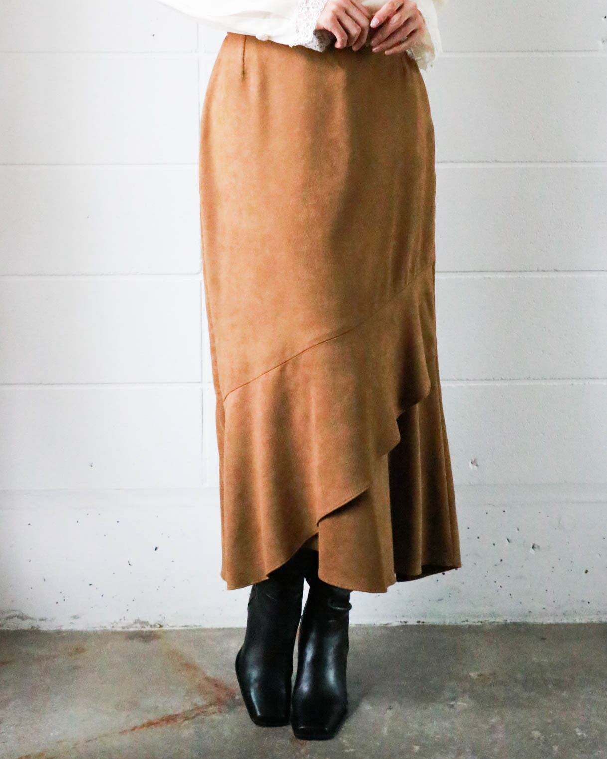 暖味のあるピーチスキンのような肌触りに気分が高まるロングスカート。