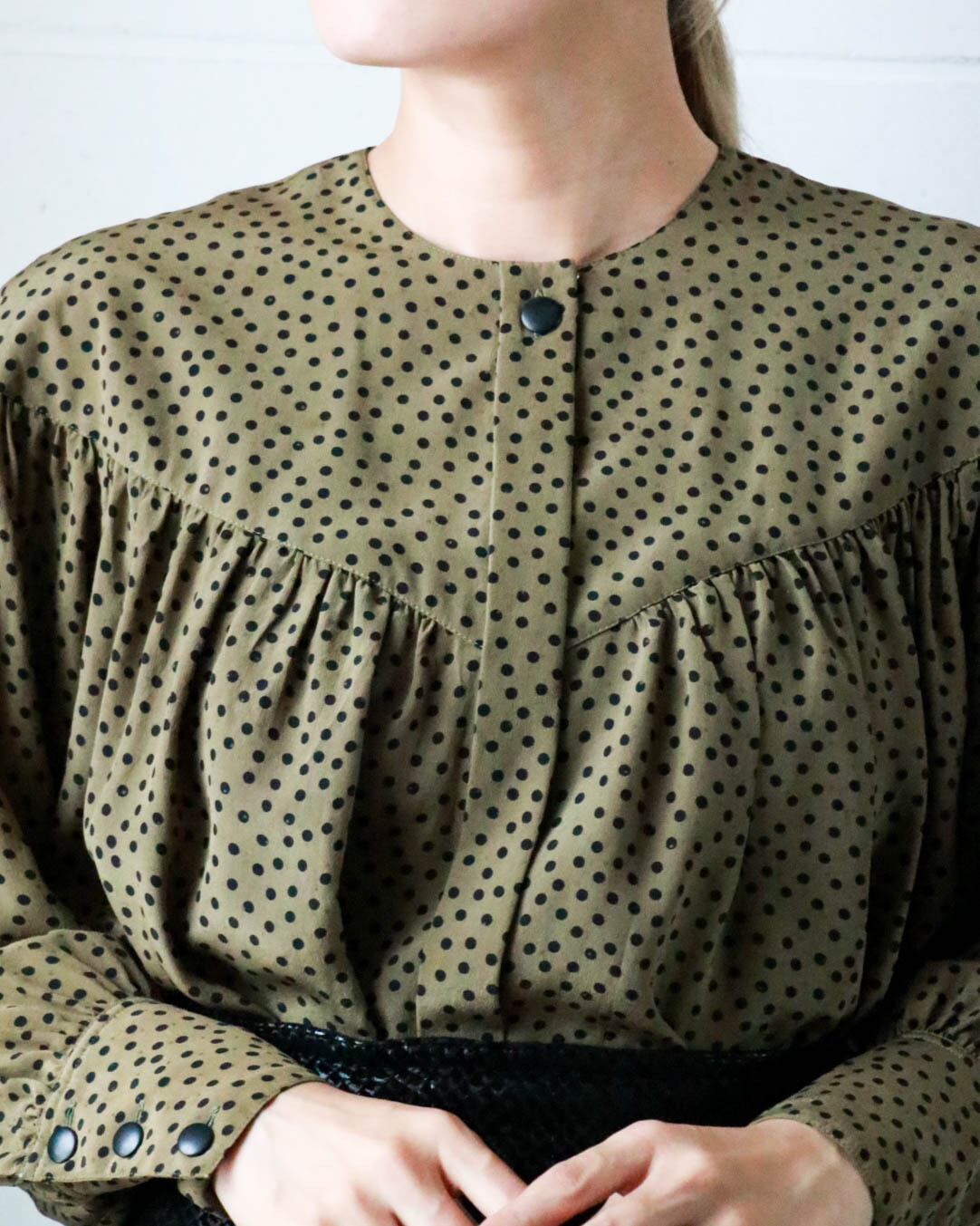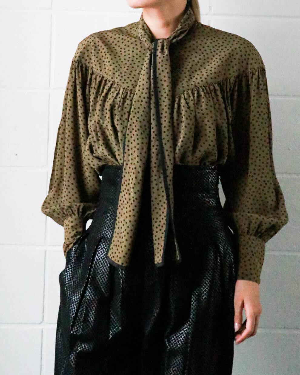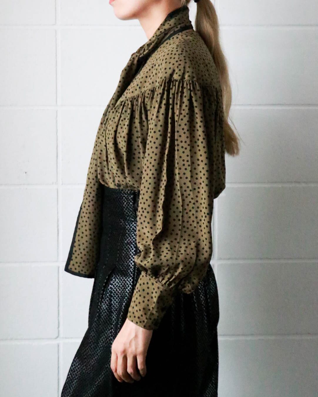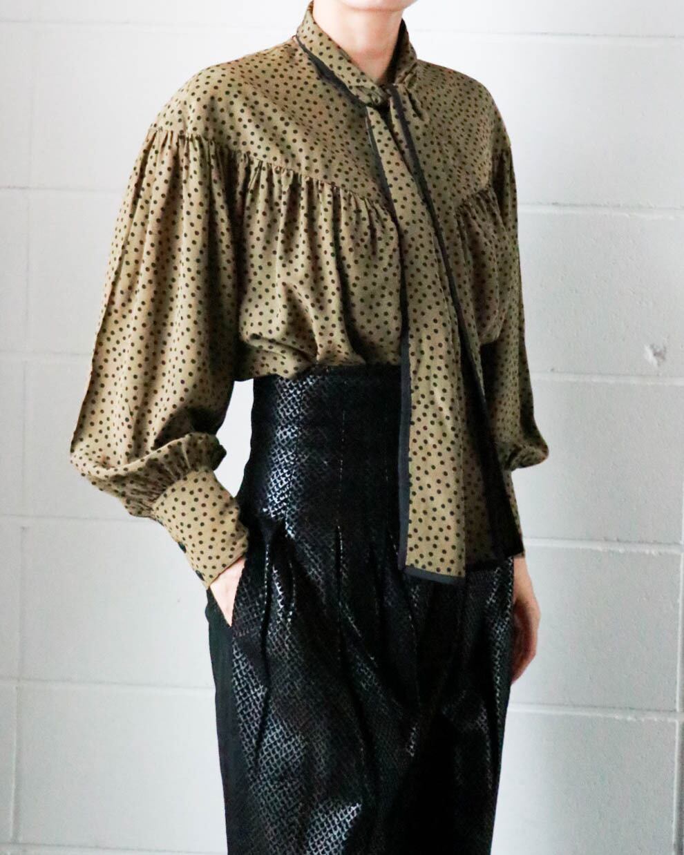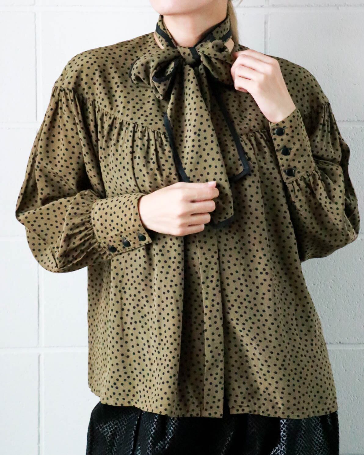 フェミニン感溢れるドット柄のディオール ブラウス。蕩けるような肌触りの良い生地で首元は同生地のリボンがとってもキュート。真冬はタートルのニットをインナーに、一年中お楽しみください!!