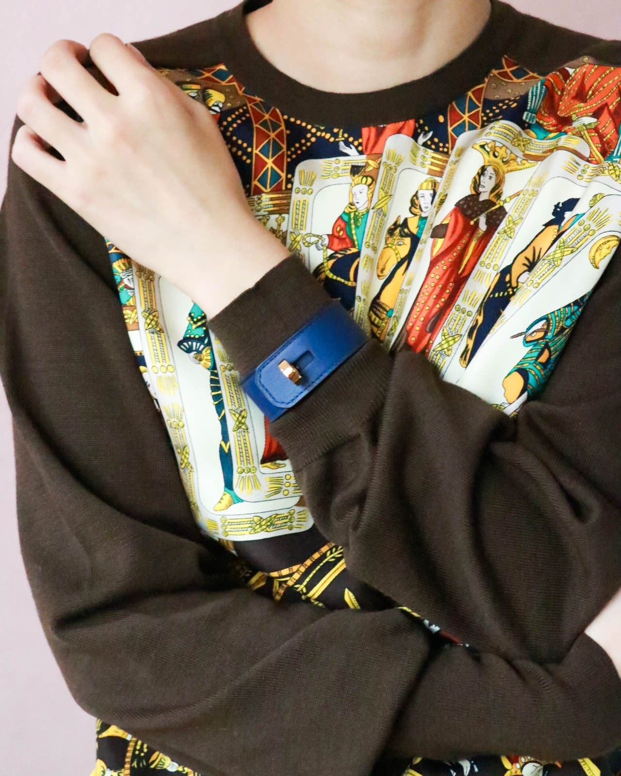 店頭でも人気が高いHERMESのバングル。こちらは綺麗なブルーに、ケリーターンロック金具が上品に輝くデザイン。エレガントにもカジュアルにも合わせやすく、コーディネートの差し色にも最適。飽きのこないデザインでテイスト問わず、デイリーに愛用できるのが嬉しい一品です。