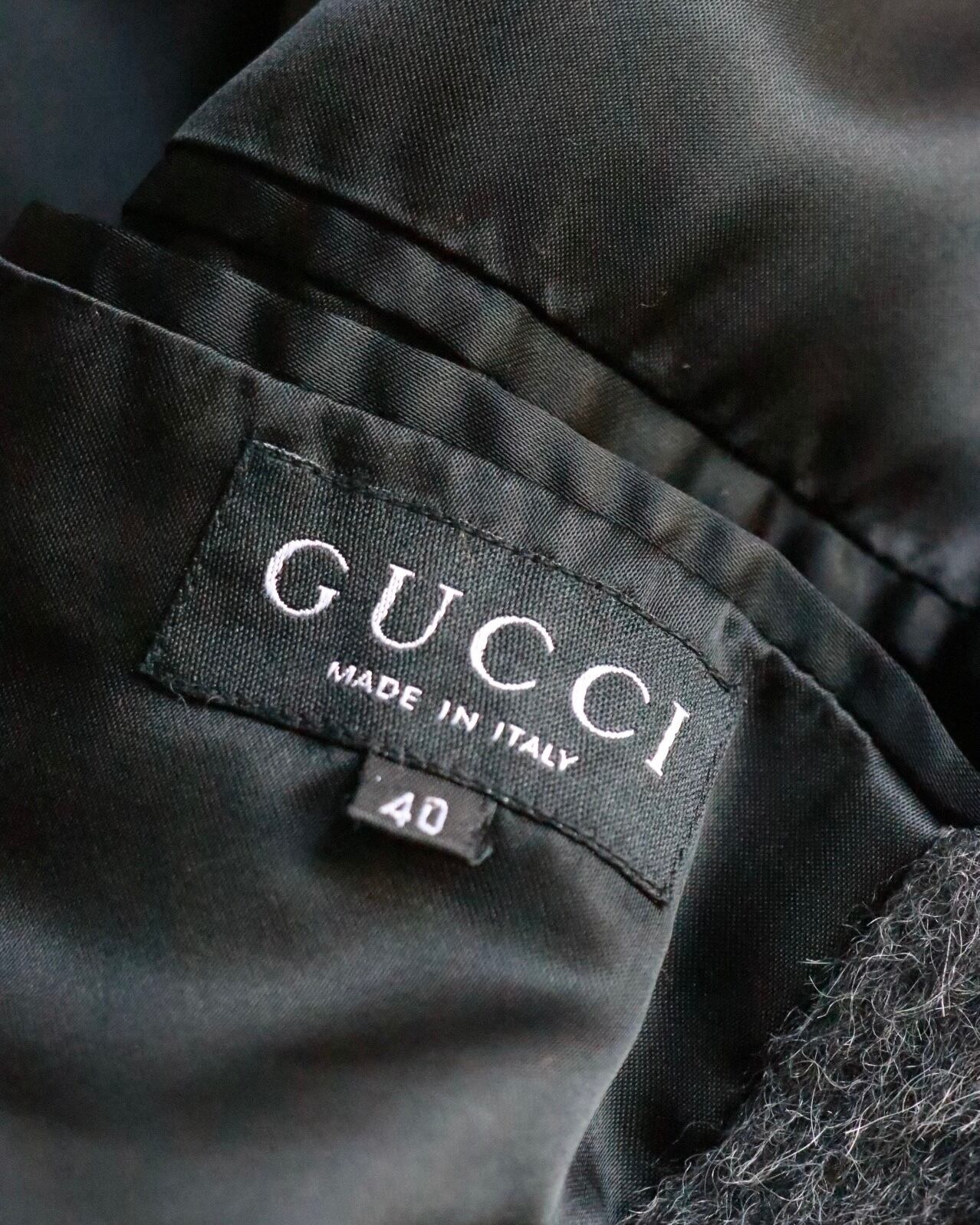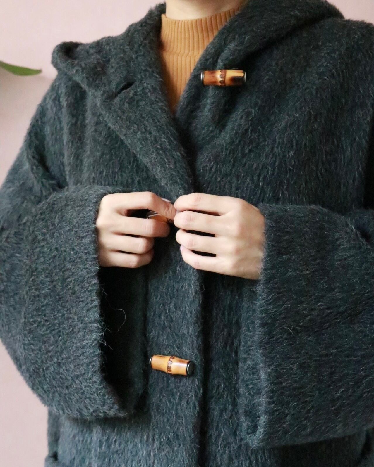 オーバーサイズのフード、ダッフルコートのようにふんわりとからだを包んでくれるゆったりフォルム。こちらのコートはトムフォード期のグッチになります。