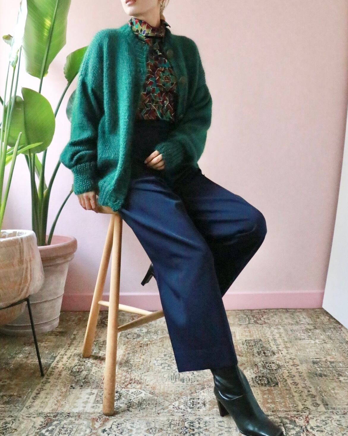 深みのあるグリーンのカーディガン。