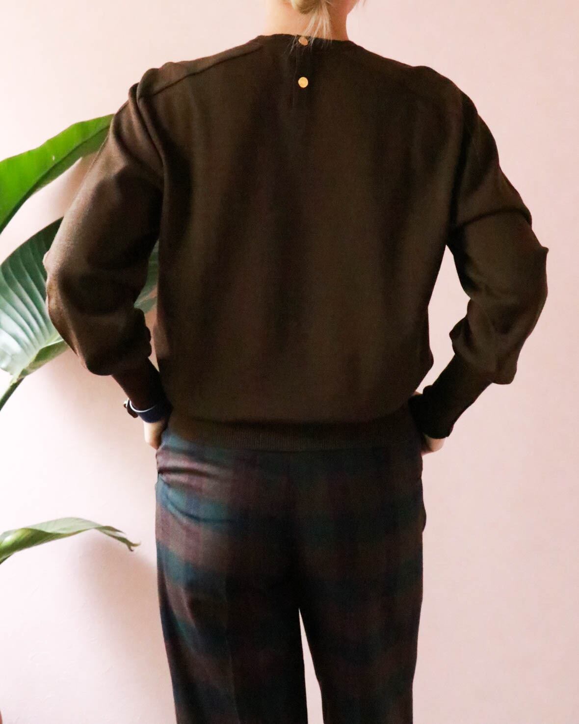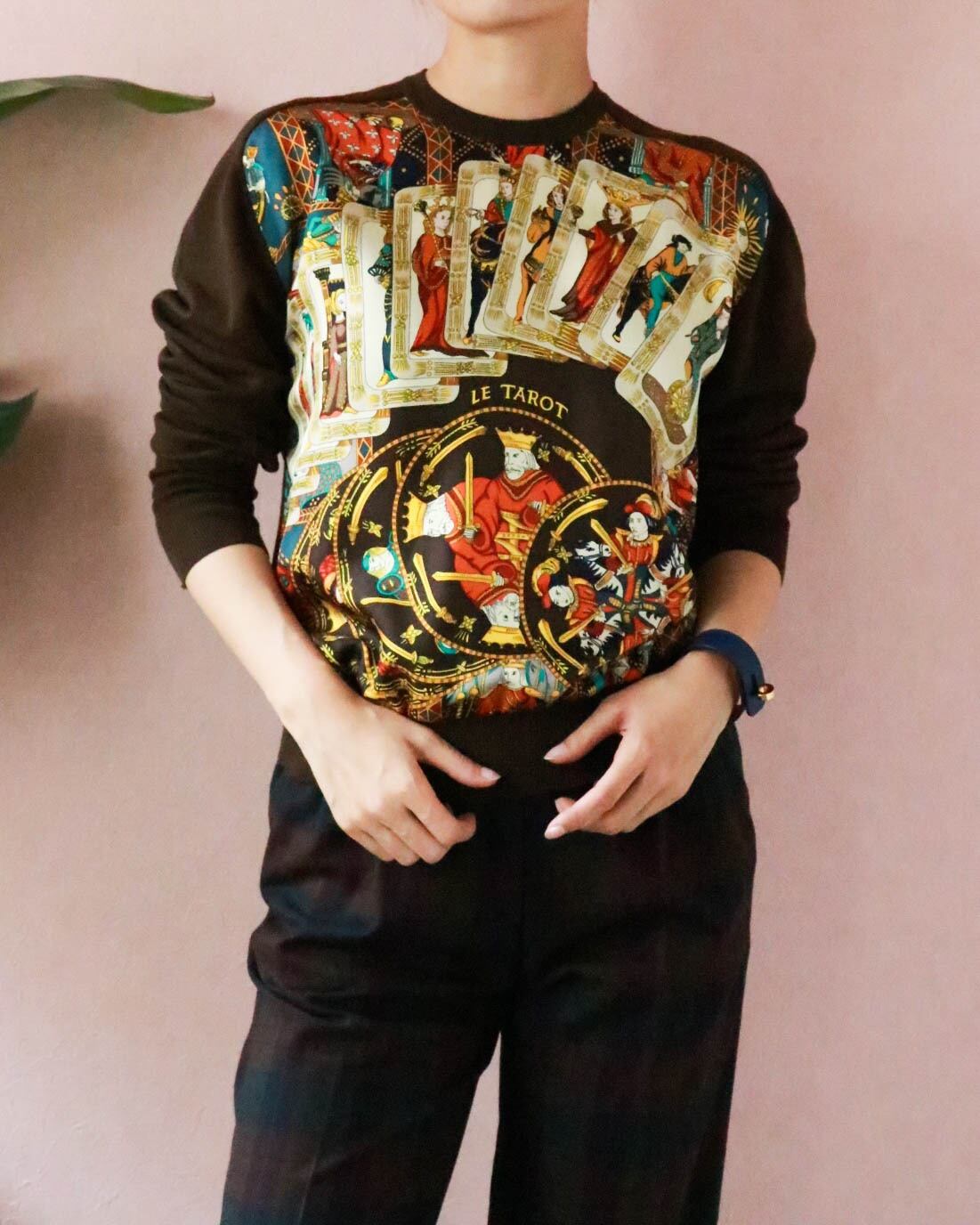 シルク部分は鮮やかな配色ですが、ニット部分のベースがブラウンなので意外と合わせるお洋服を選びません。
