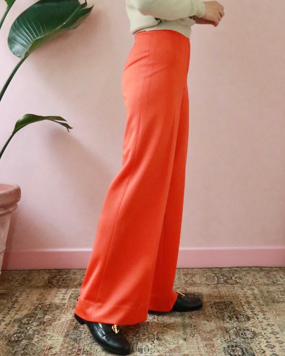 鮮やかなオレンジ色が目を引くワイドパンツ。