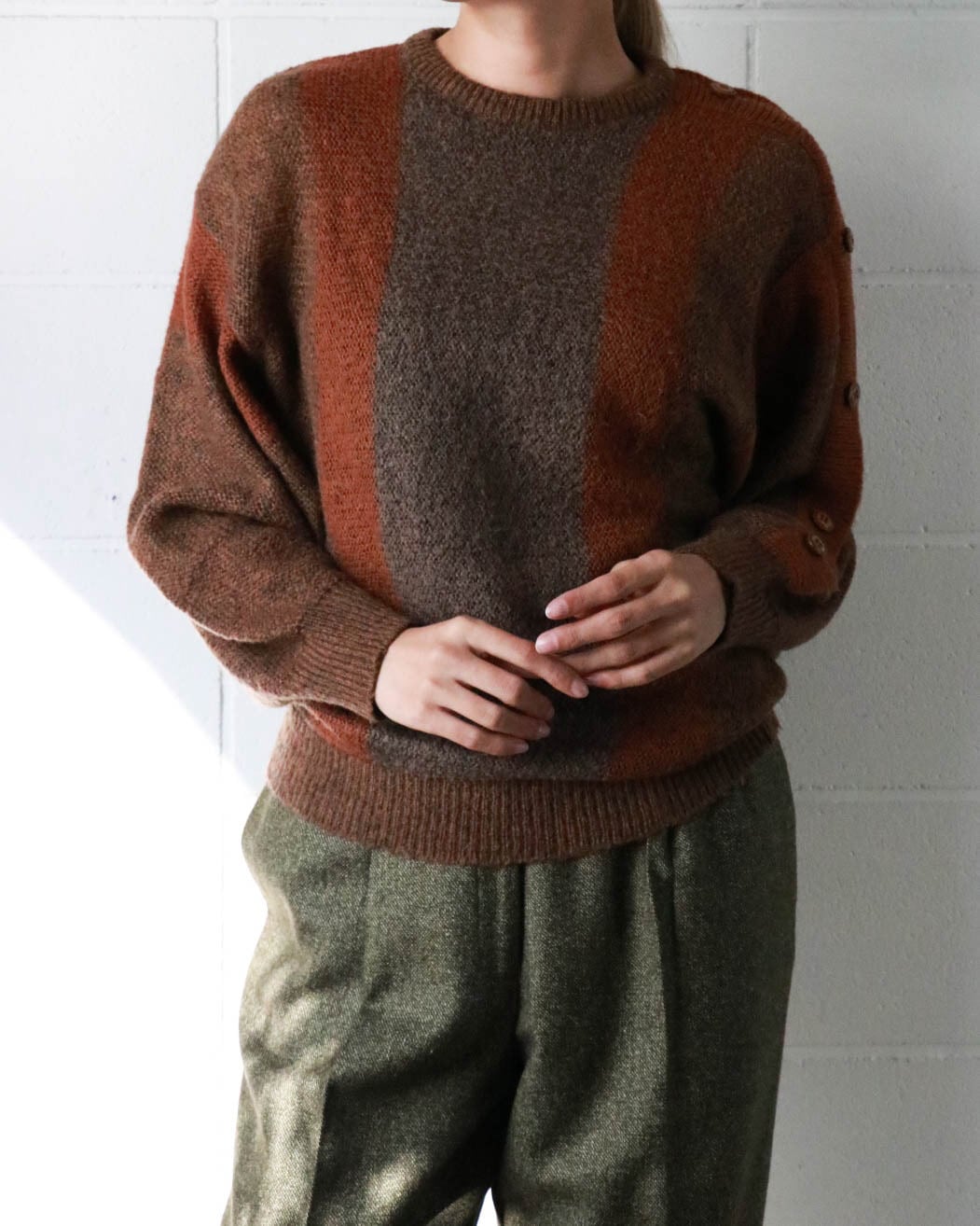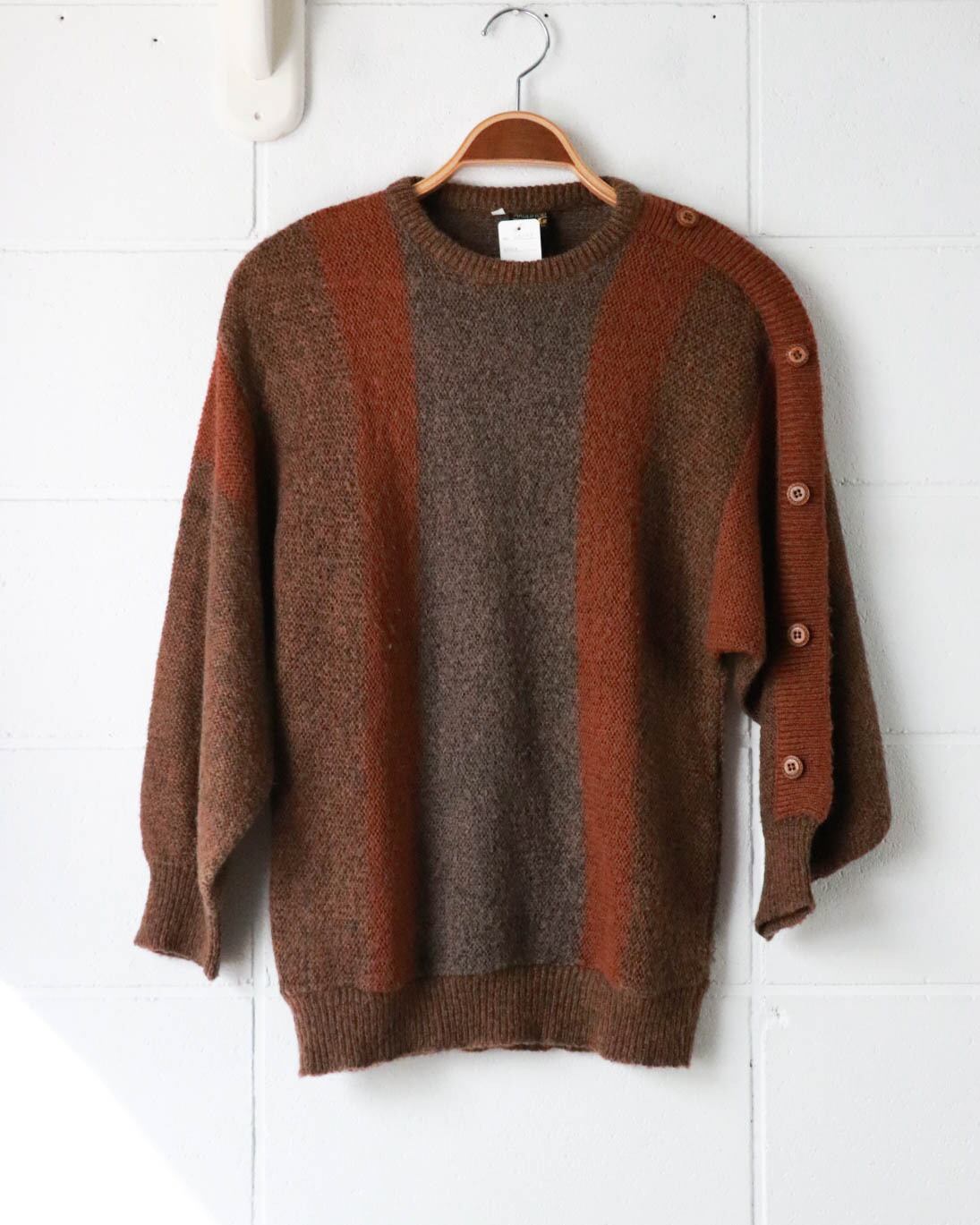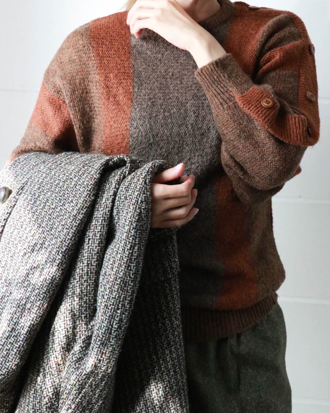 オレンジ×ブラウンのふわっと柔らかな雰囲気の秋冬ニットが入荷。左肩から袖にかけてボタンが付いた女性らしいデザイン。トレンドを問わず毎年寒い時期に活躍します。