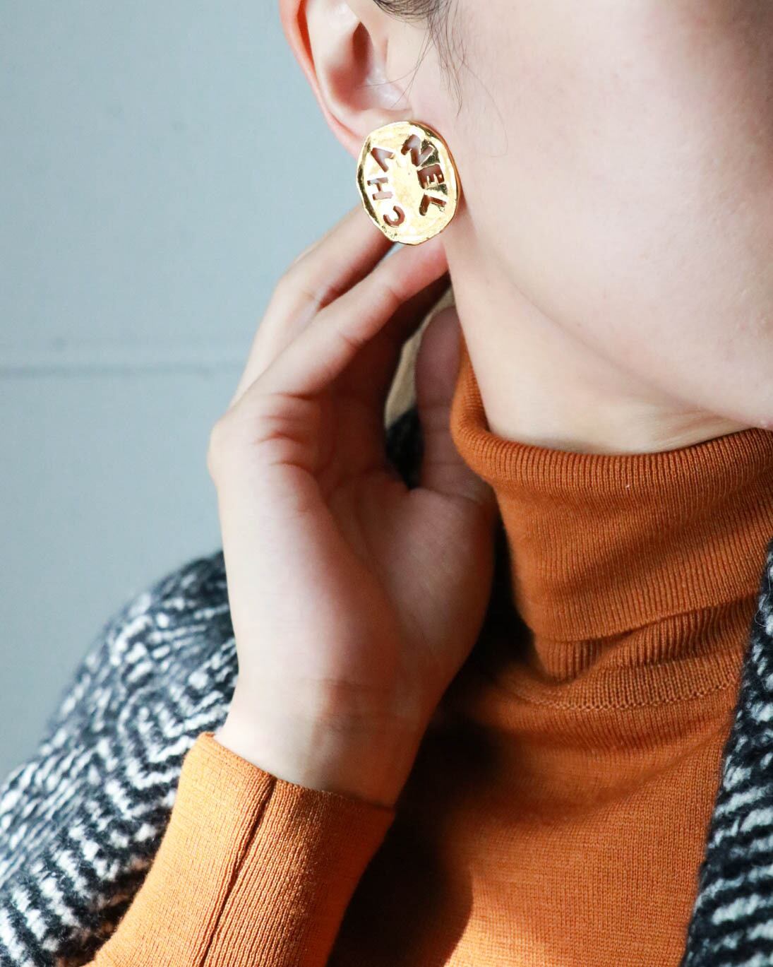 存在感のあるシャネルイヤリングイヤリング。透かしデザインがモード<ポップな印象です。