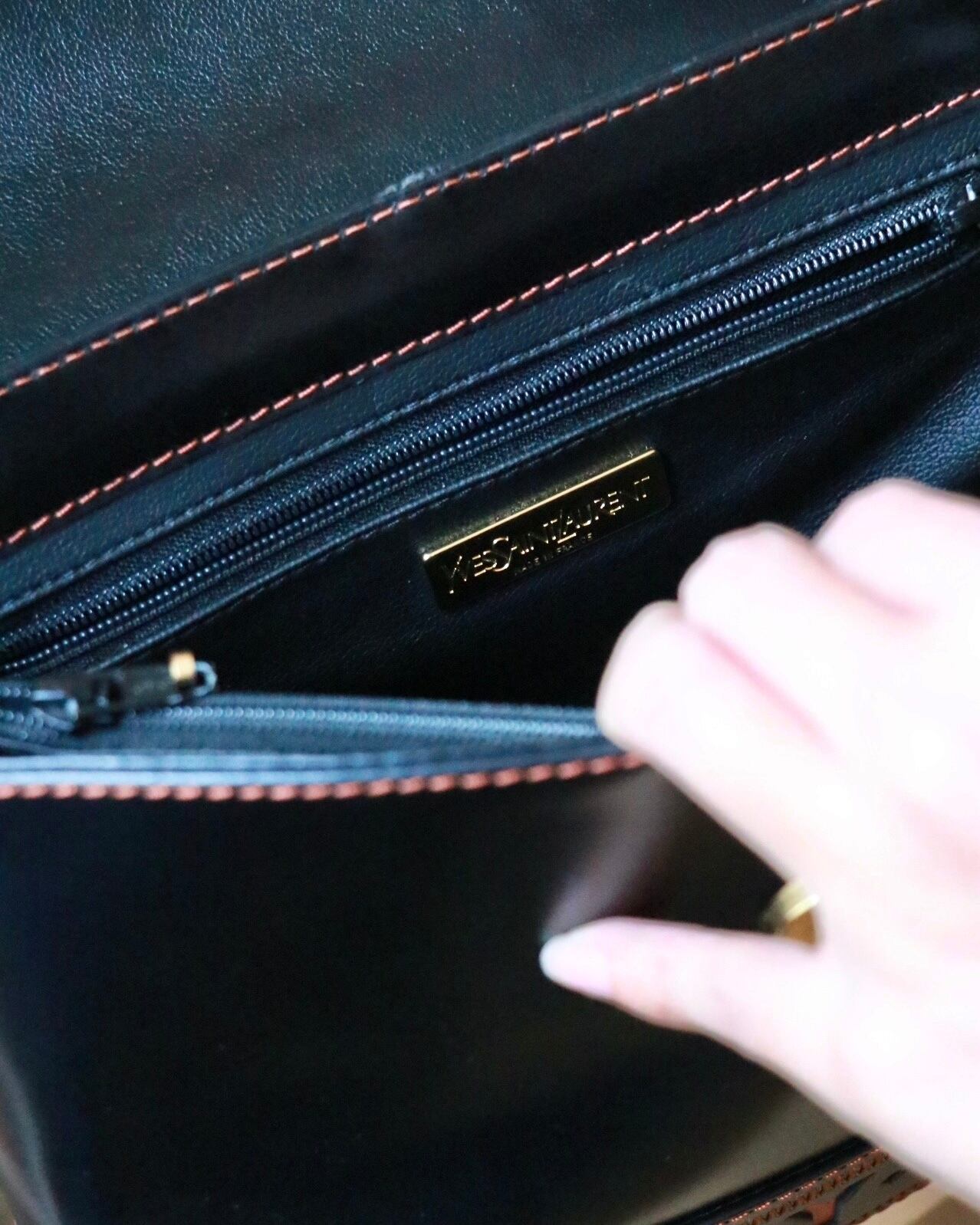艶やかなブラックレザーにオレンジブラウンのYと洒落たステッチデザインが施されたイヴ・サンローランのショルダーバッグ。
