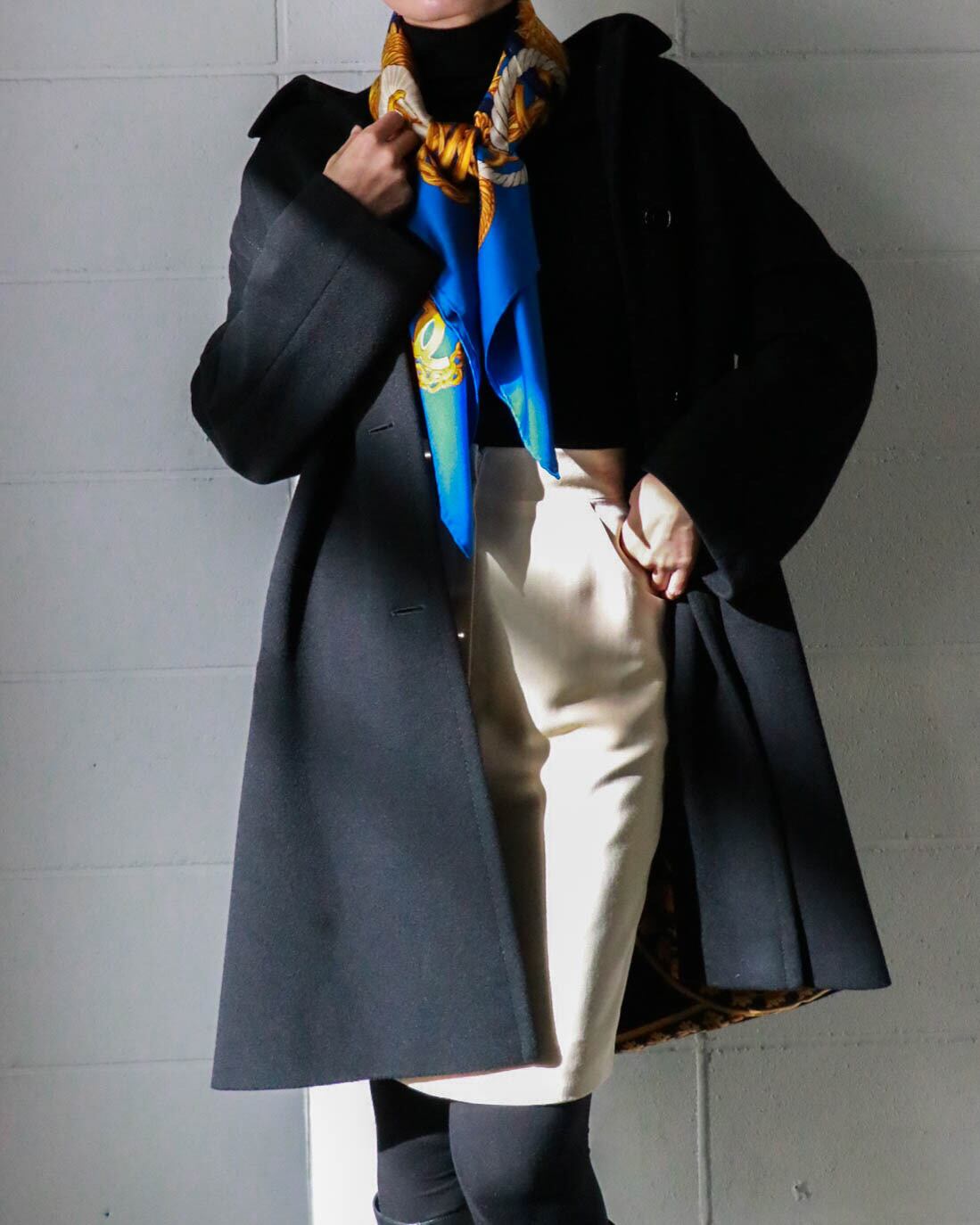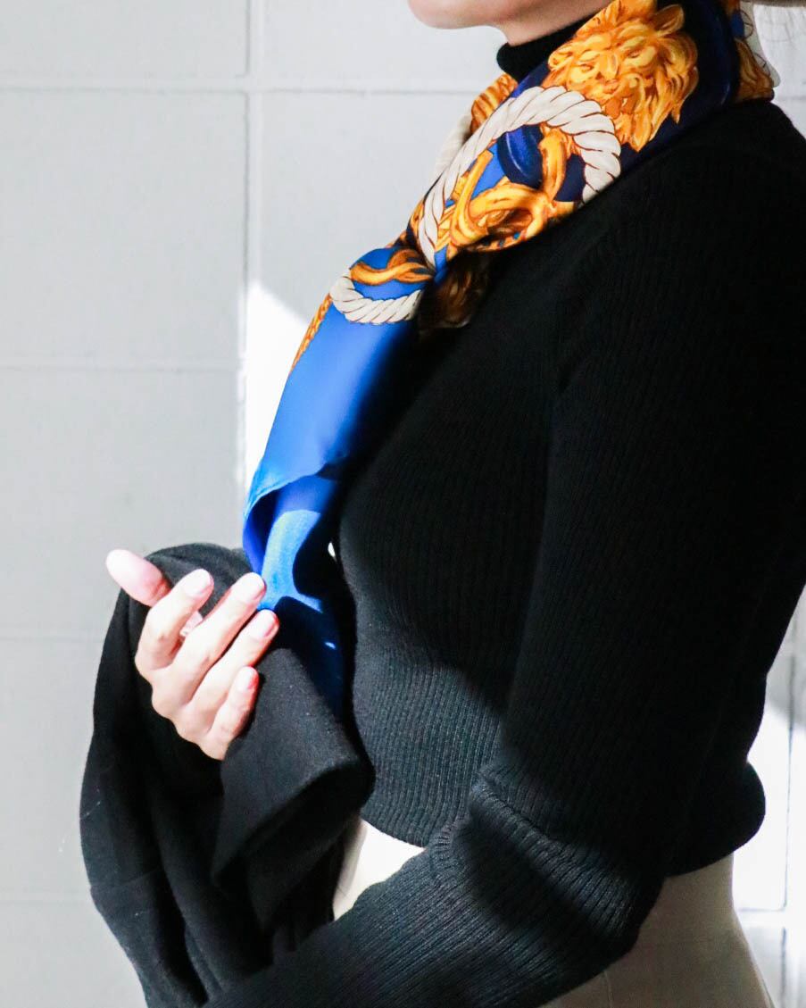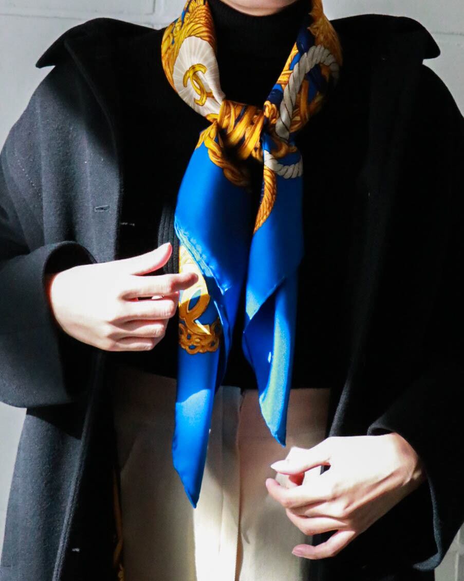 チェーンモチーフにたくさんのココマークが散りばめられたブルー×ゴールドのスカーフ がコーディネートのポイントに。大判なので首にはもちろん、頭につけたり、ベルトのようにつけたりと様々なアレンジが楽しめます。