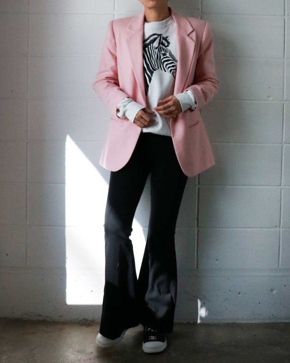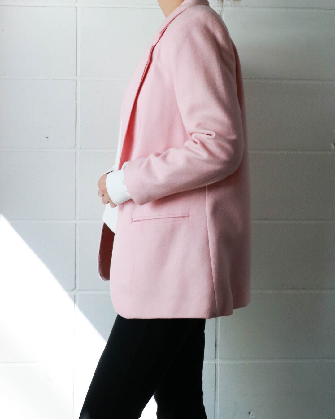 ウール100%、シングルボタンのシンプルなディテールは通年使いやすい。女性らしい柔らかなピンクカラーにかっちりとした印象のラインがバランス◎