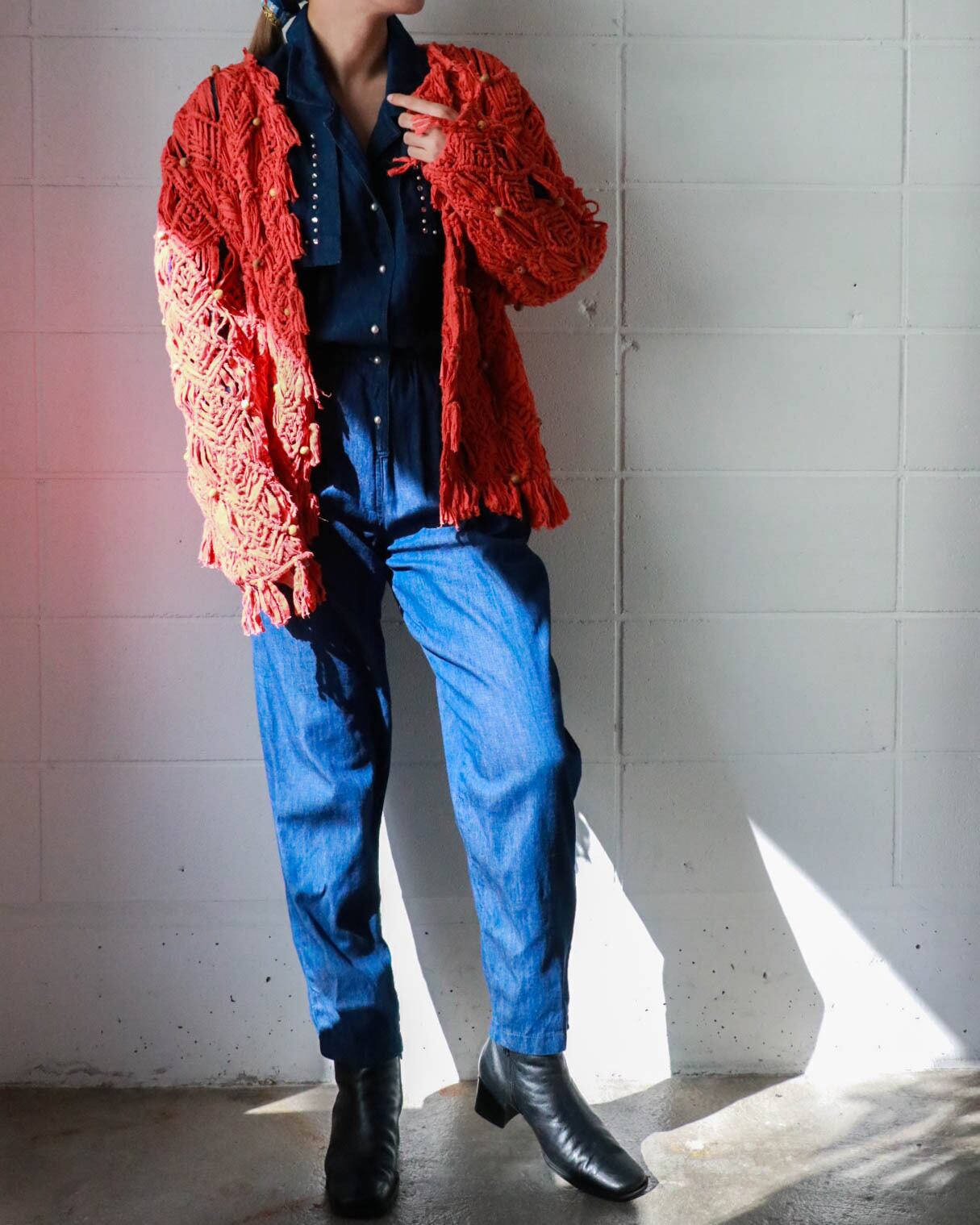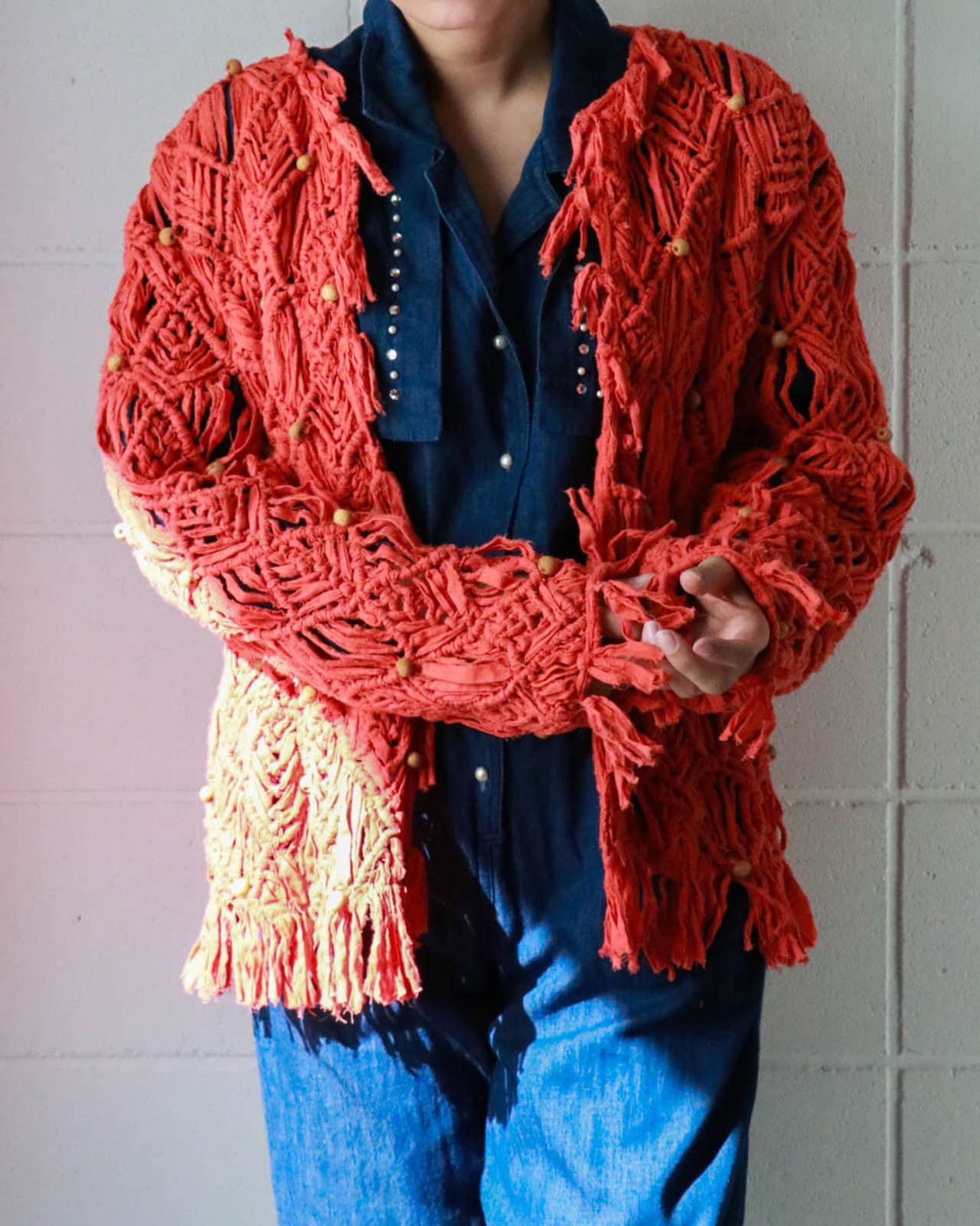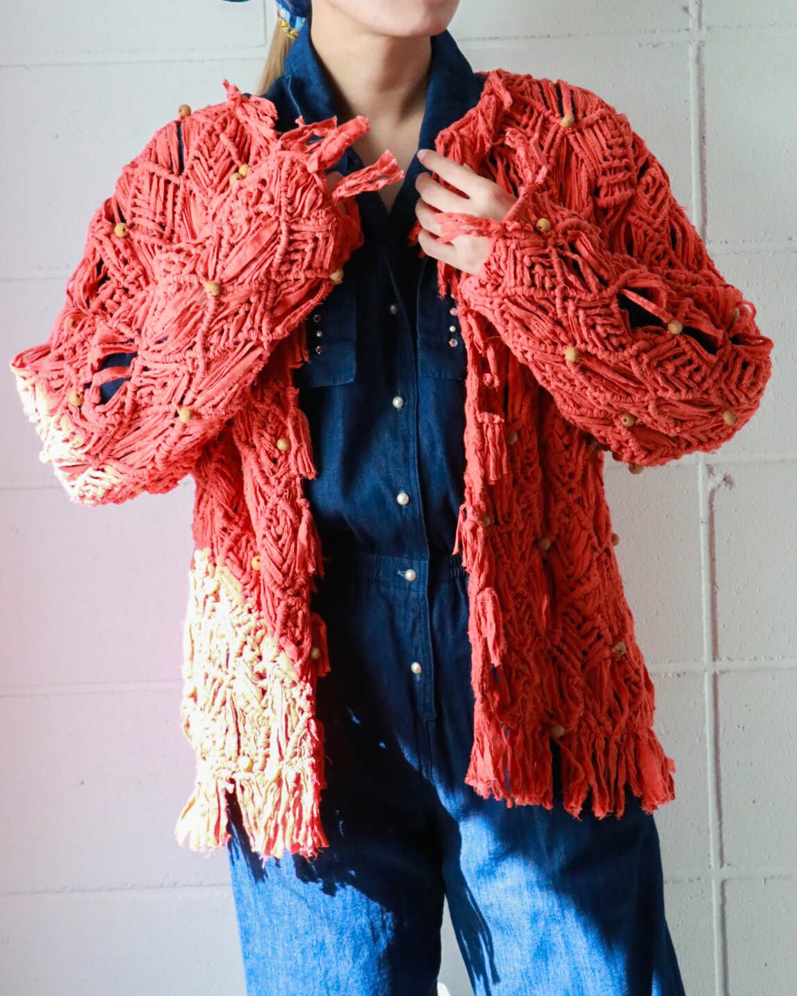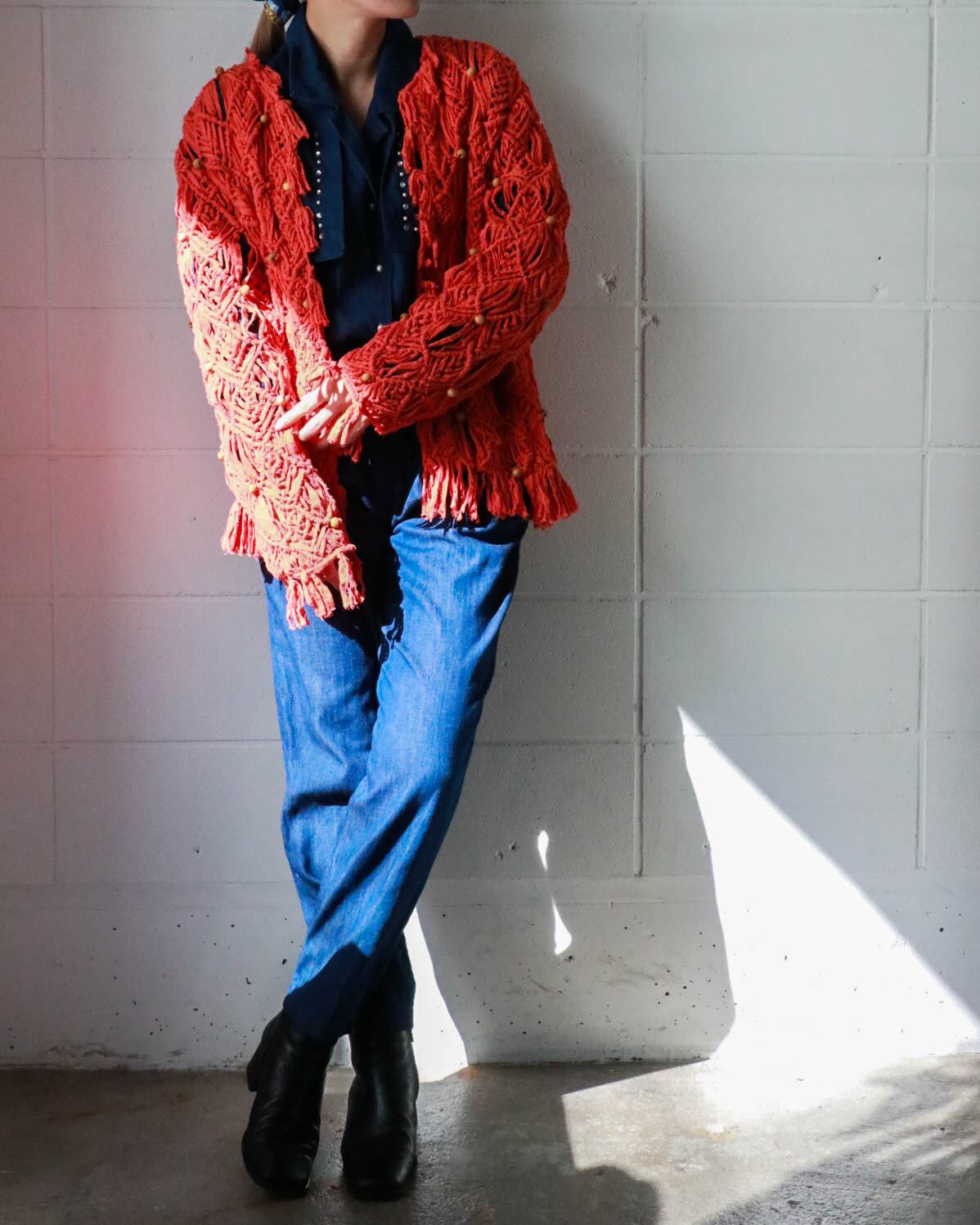 このフリンジアウターは、アートピースのような存在感を放つ一枚。大胆なマクラメ編みとビーズの装飾が、ボヘミアンなムードを漂わせつつ、鮮やかなオレンジがスタイリングにエネルギーをプラス。羽織るだけで、ラフさと個性が絶妙に融合し、こなれたヴィンテージスタイルが完成。唯一無二のデザインが、装いにドラマティックなアクセントを加えてくれます。