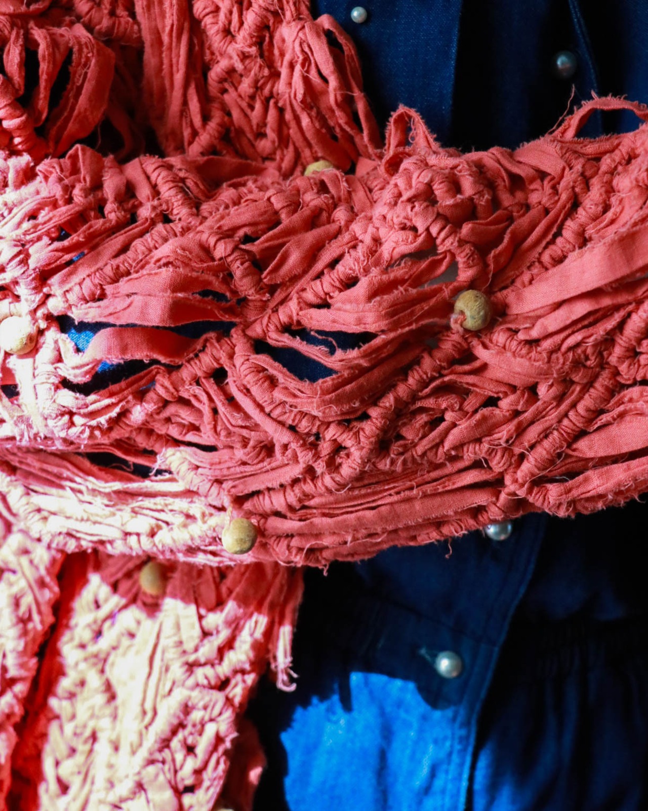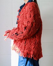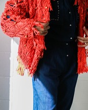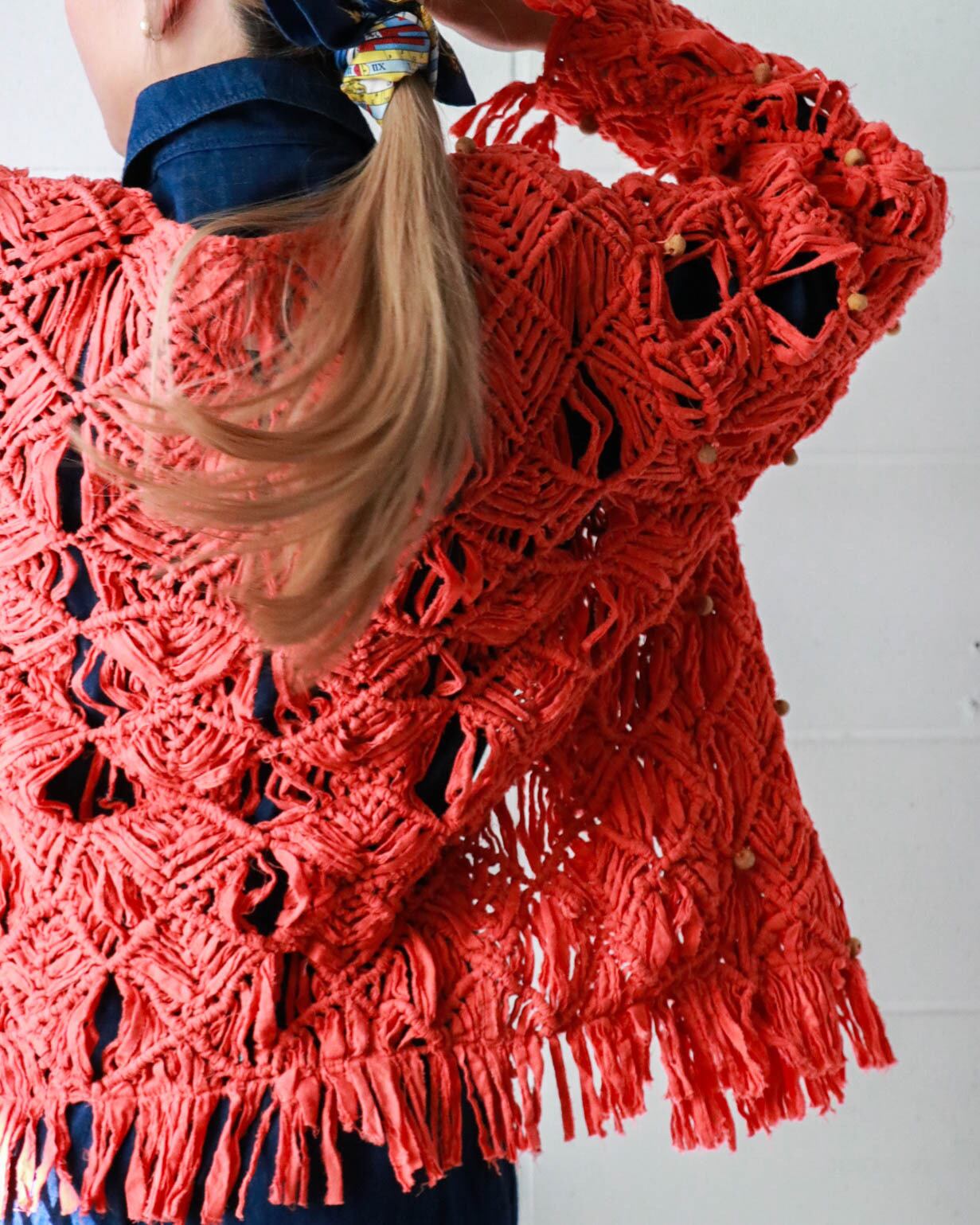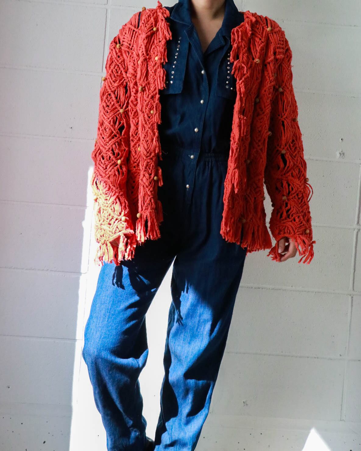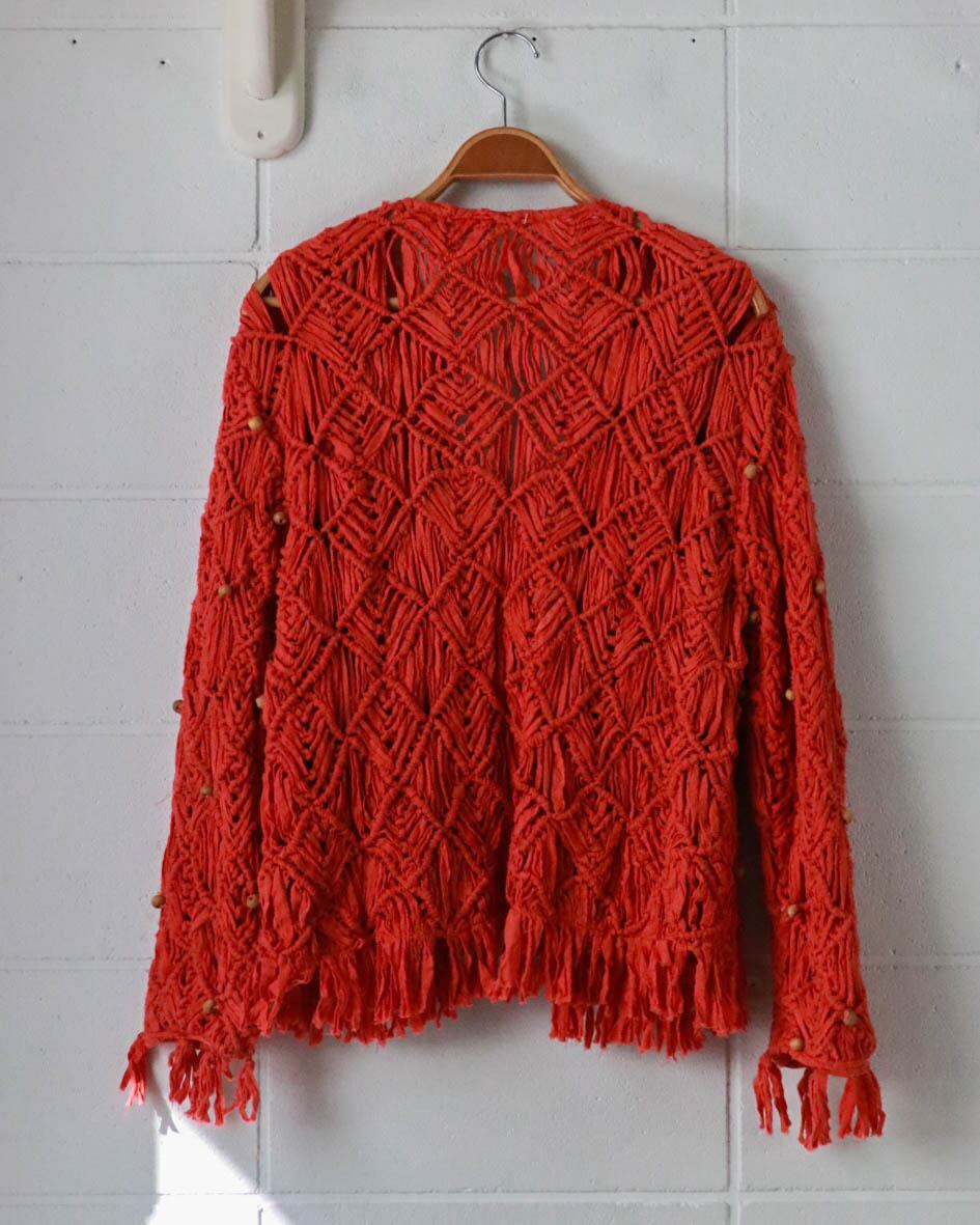 このフリンジアウターは、アートピースのような存在感を放つ一枚。大胆なマクラメ編みとビーズの装飾が、ボヘミアンなムードを漂わせつつ、鮮やかなオレンジがスタイリングにエネルギーをプラス。羽織るだけで、ラフさと個性が絶妙に融合し、こなれたヴィンテージスタイルが完成。唯一無二のデザインが、装いにドラマティックなアクセントを加えてくれます。